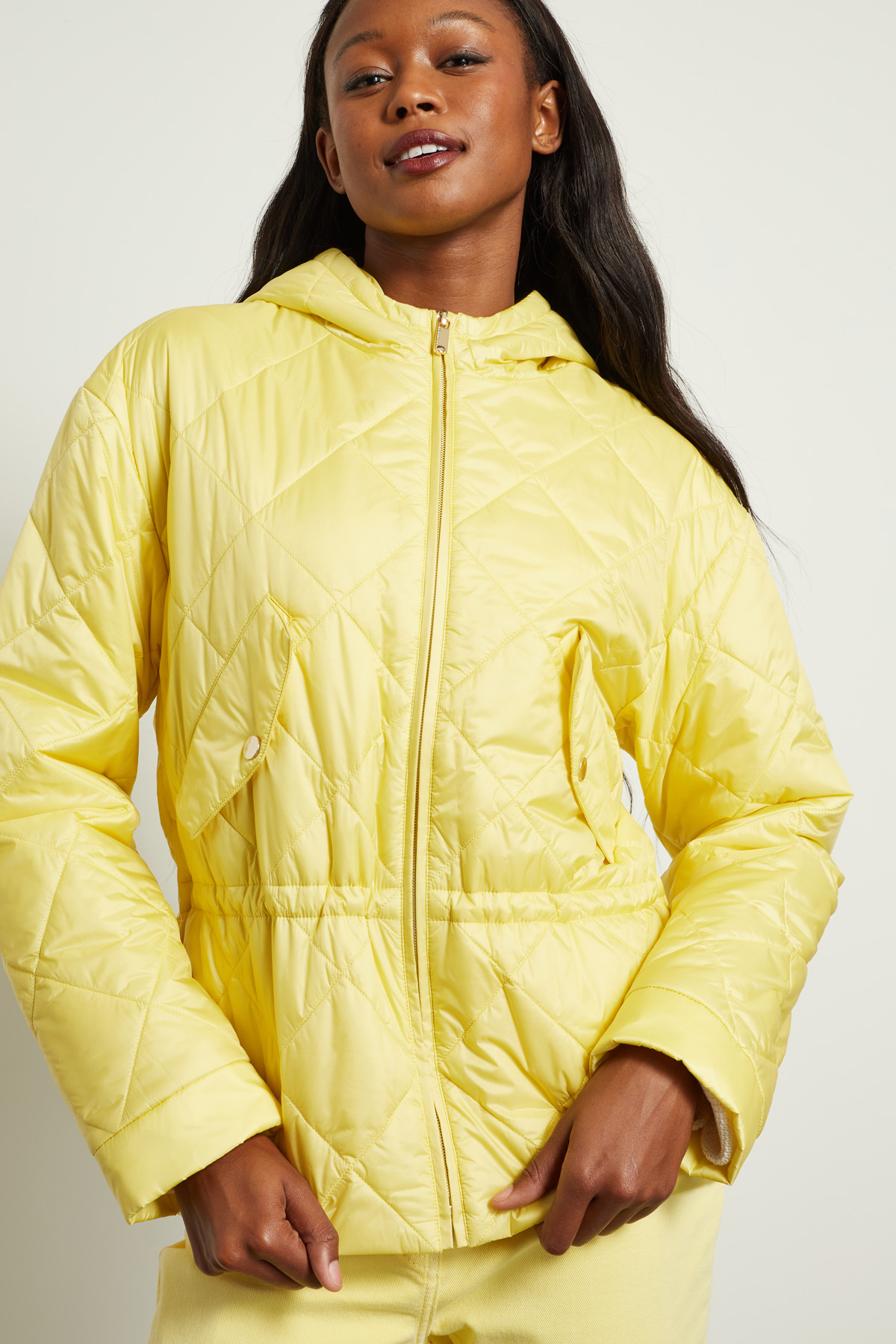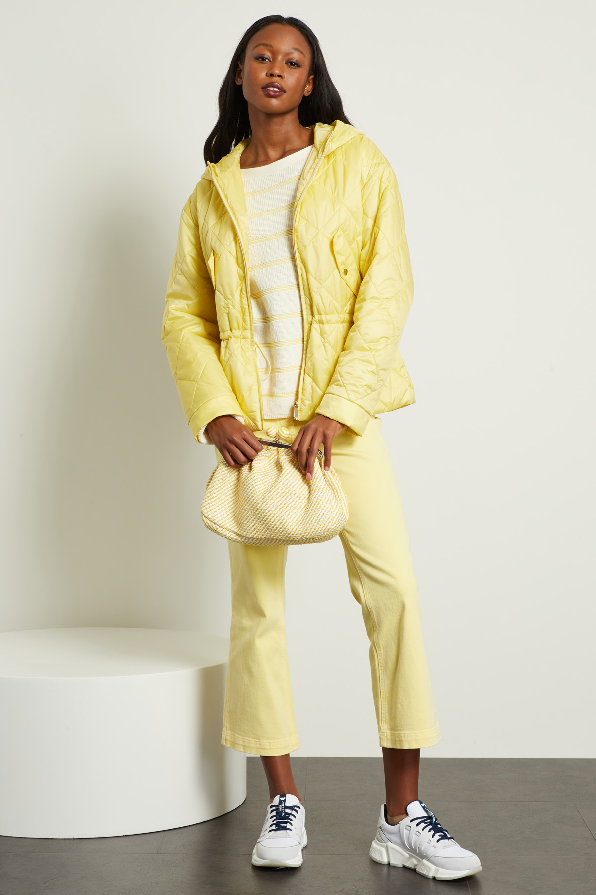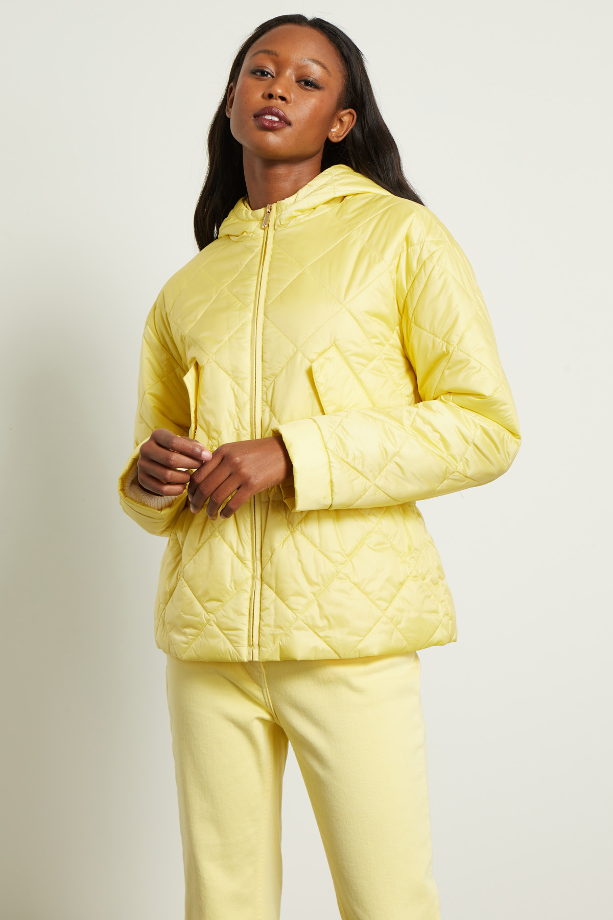 Imbottito corto dalla linea dritta realizzato in raso tecnico trapuntato, con cappuccio, coulisse interna in vita, maniche lunghe, tasche a filetto con patta e bottone. Allacciatura tramite zip.