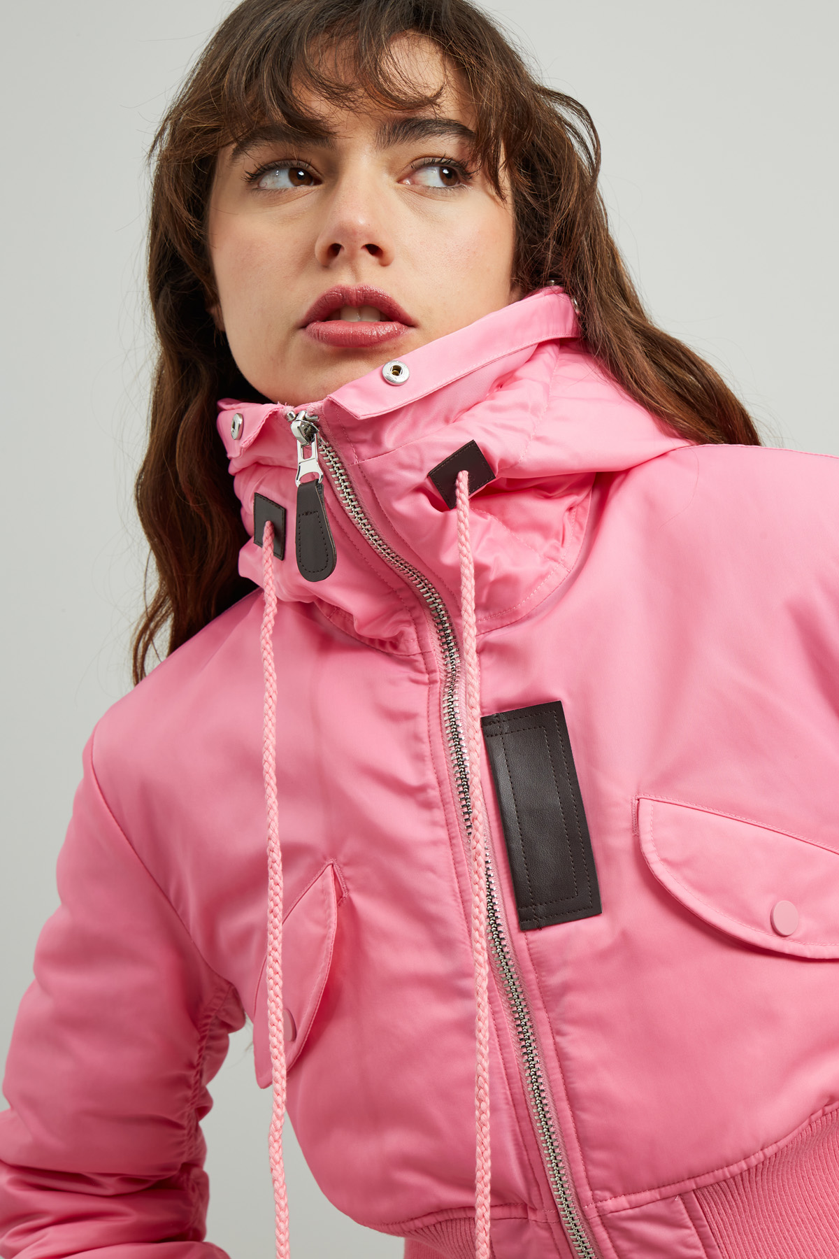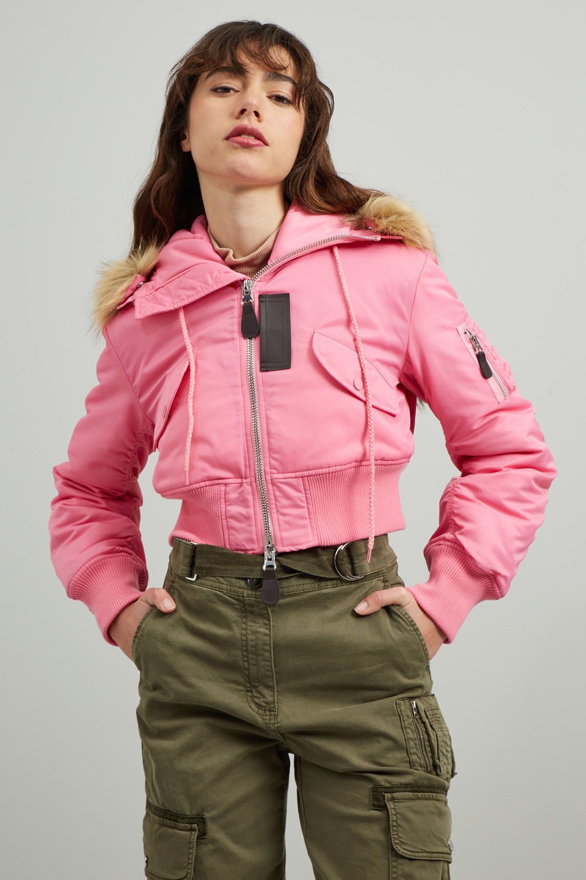 Giacca imbottita corta realizzata in raso tecnico antigoccia, con cappuccio rifinito in tessuto effetto pelliccia removibile, coulisse, maniche lunghe con dettaglio di taschino, tasche a filetto con patta e bottone sul davanti. Profili rifiniti in maglia e allacciatura tramite zip a doppio cursore. Foderata.