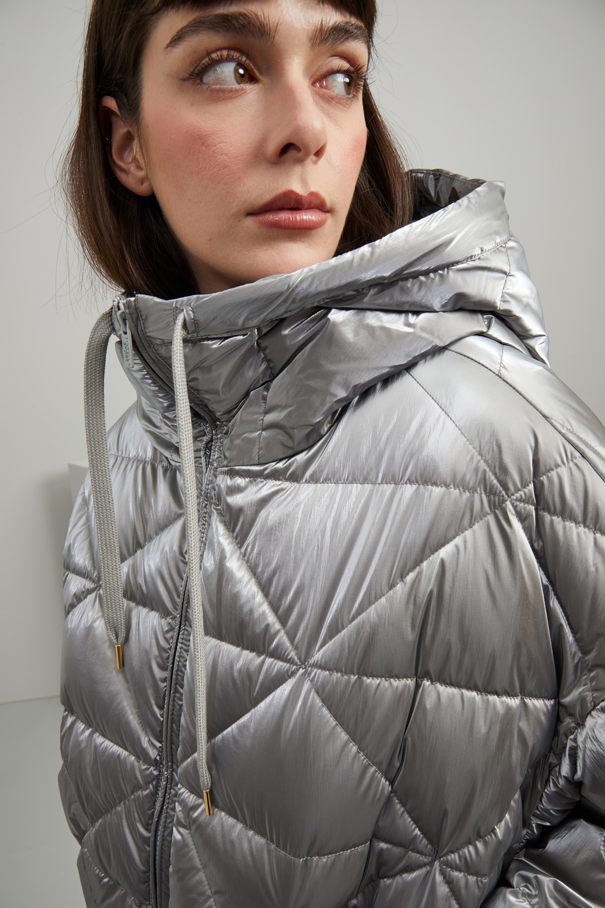 Piumino dalla linea ad uovo realizzato in tessuto tecnico antigoccia trapuntato con collo alto, cappuccio e coulisse, maniche lunghe dal giro sceso con polsino e bottone, tasche a filettone. Allacciatura tramite zip.