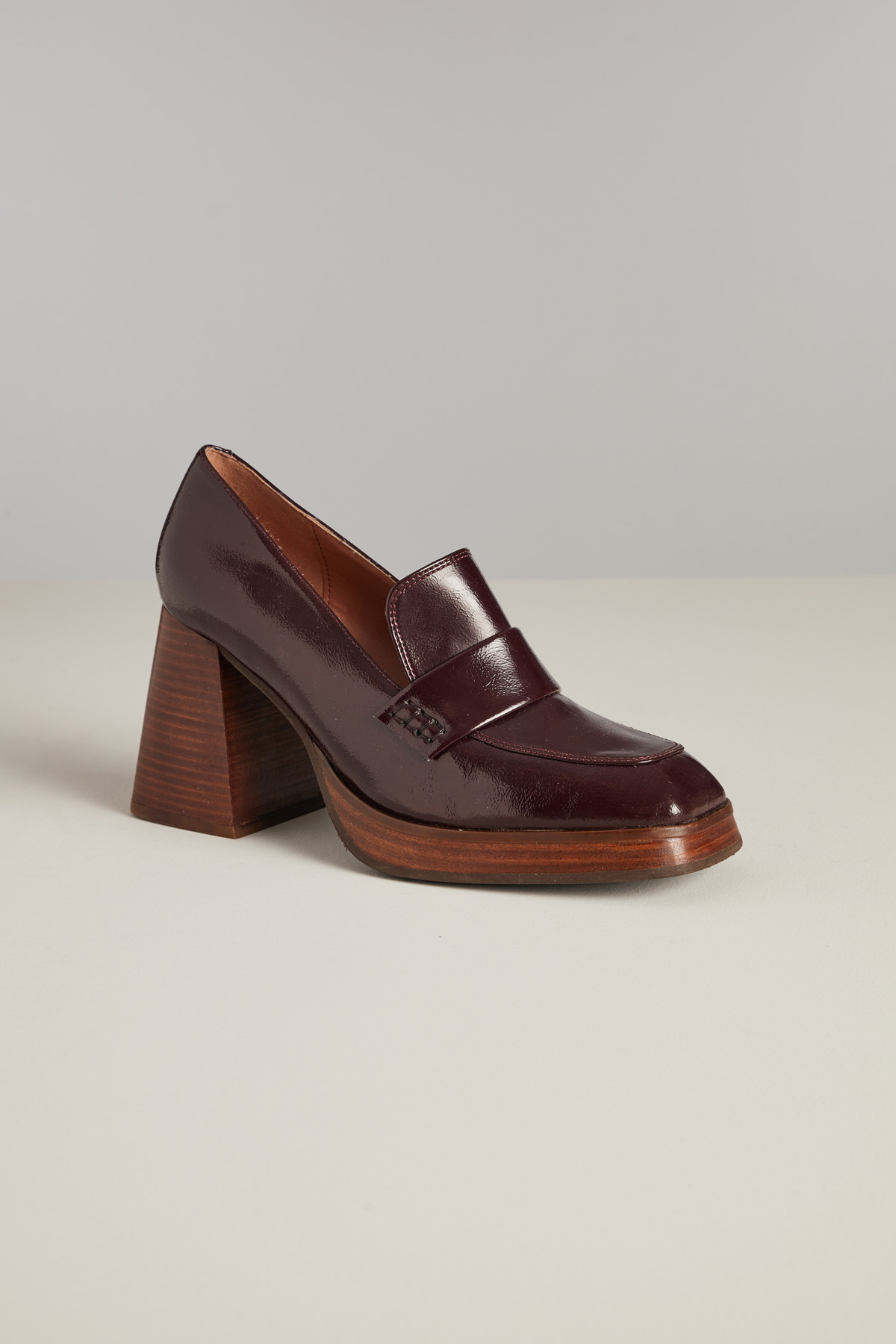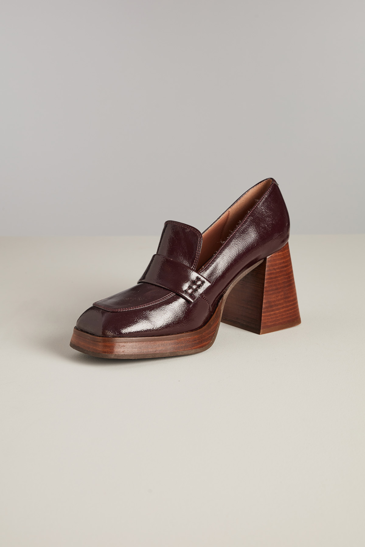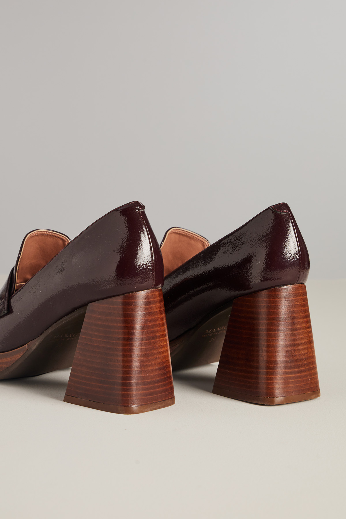Dècolletè stile mocassino realizzate in similpelle dal finish lucido con punta squadrata, tacco largo e suola in gomma. Modello senza chiusura.