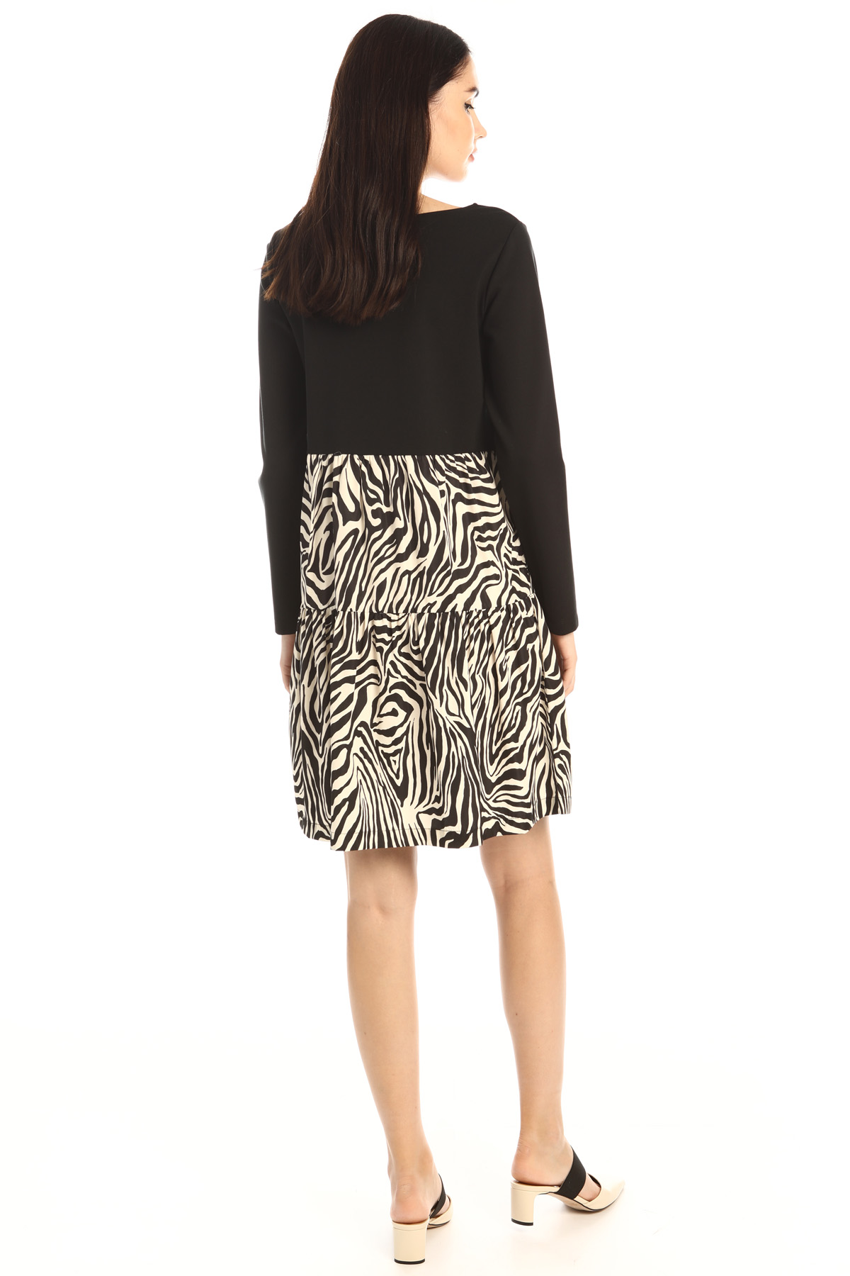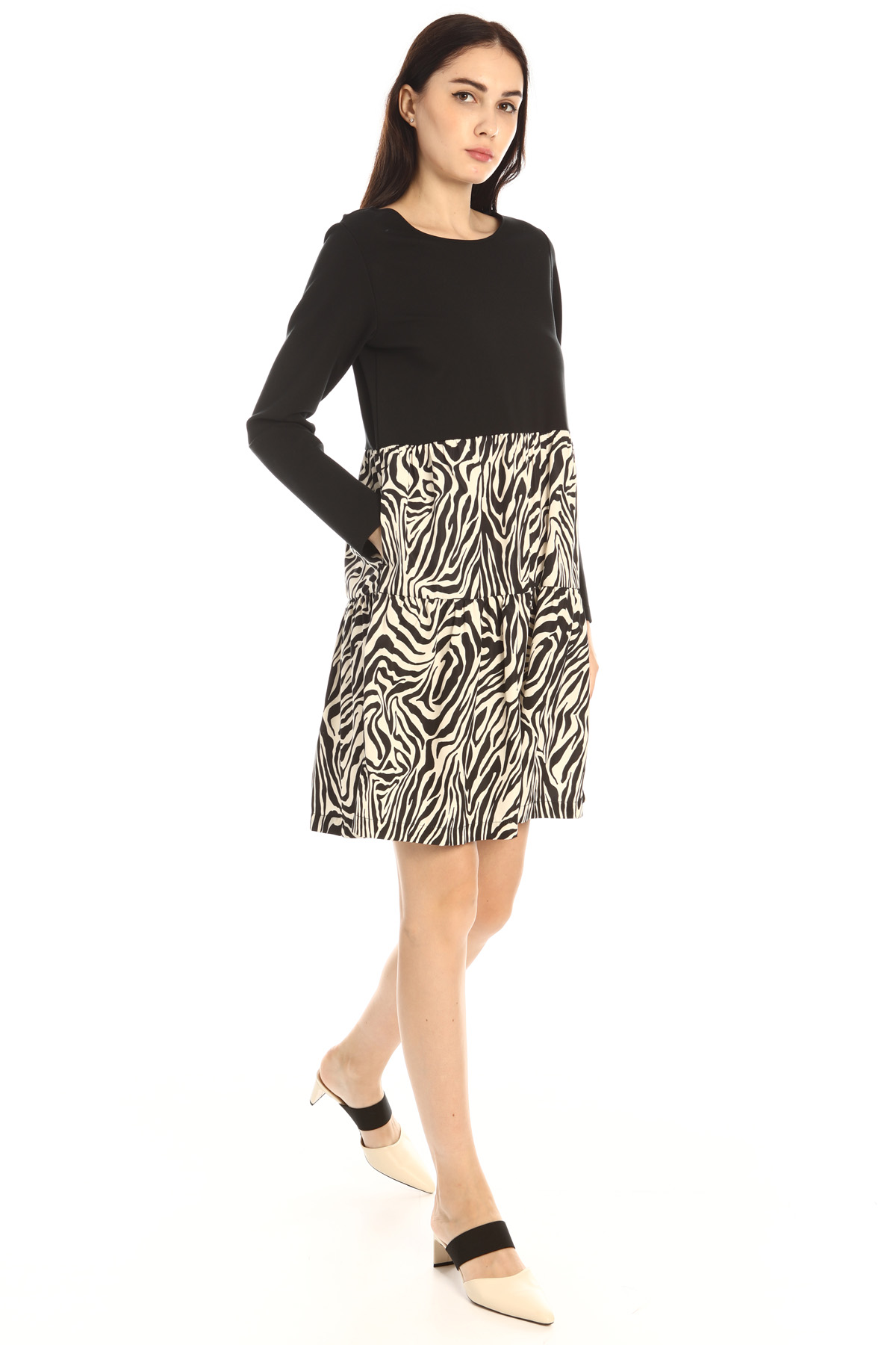 Abito dalla linea dritta realizzato in jersey di viscosa e tessuto tecnico stampato, con scollo rotondo, maniche lunghe e taglio in vita. Gonna con tasche laterali a filetto e balza al fondo.