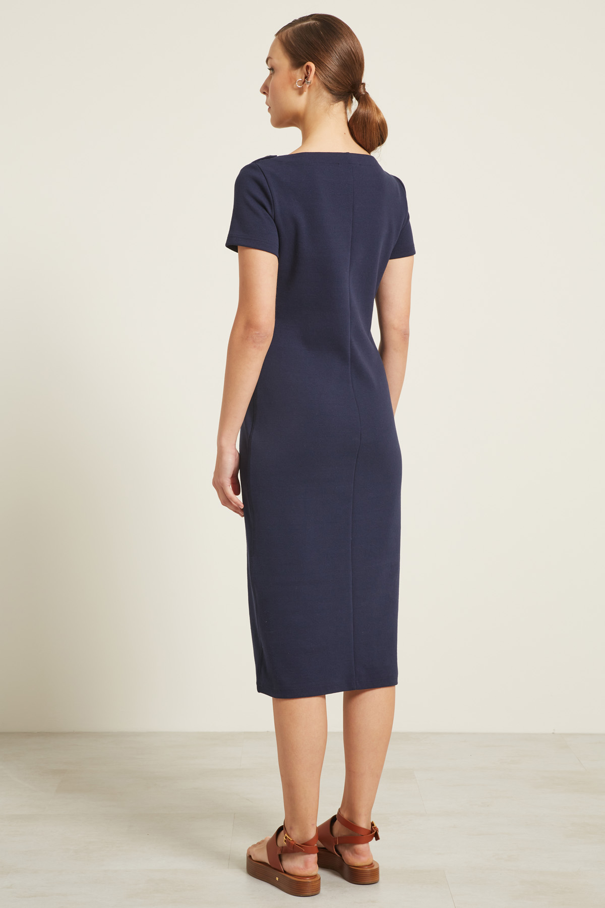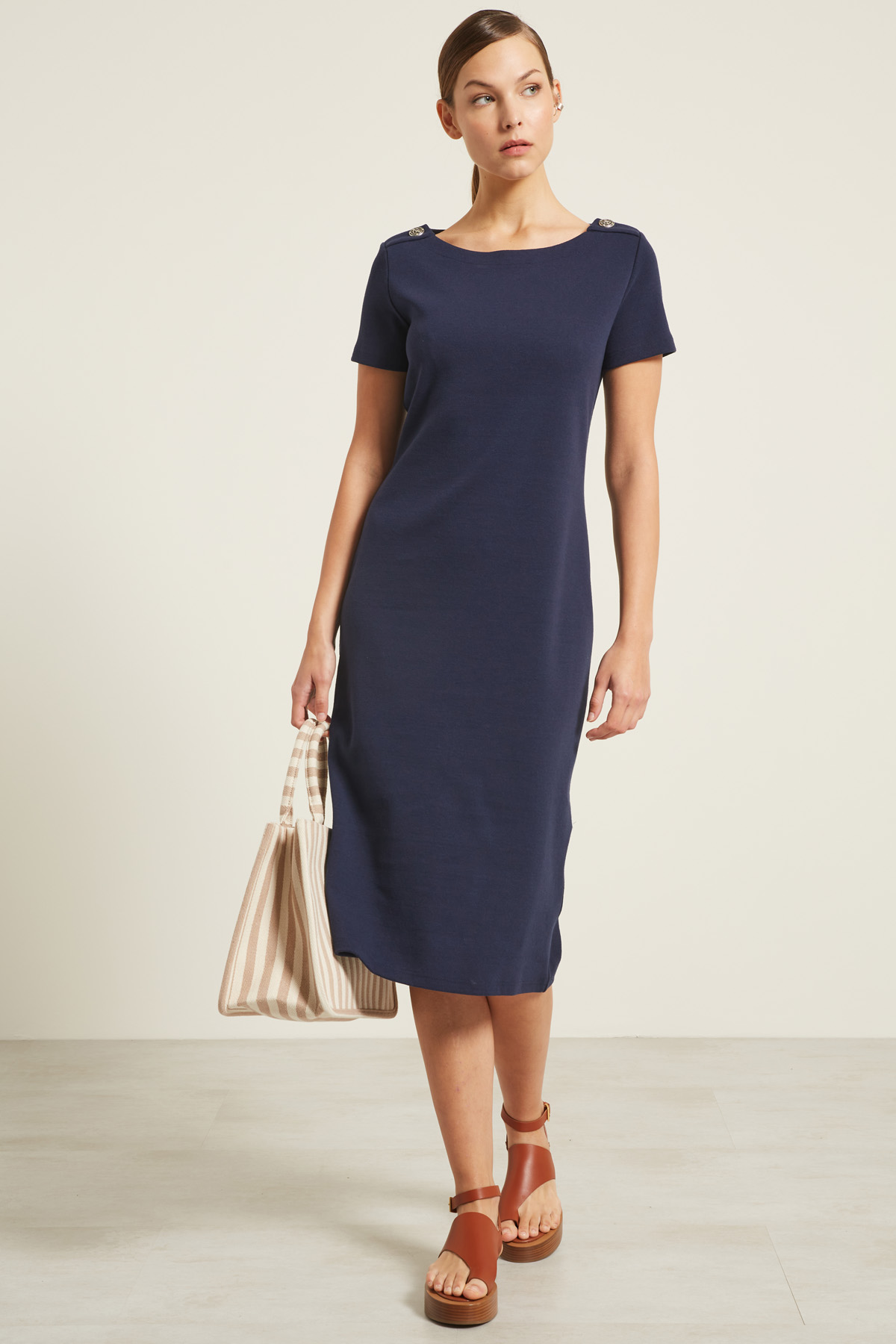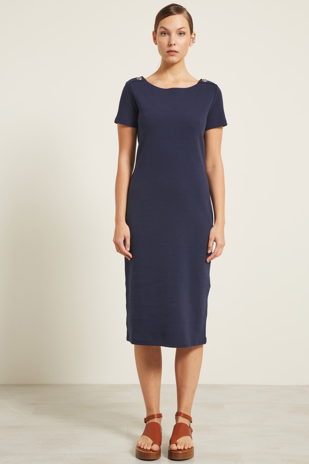 Tubino dalla linea dritta realizzato in jersey di misto cotone, con scollo a barchetta, dettaglio di bottoni sulle spalle e maniche corte.