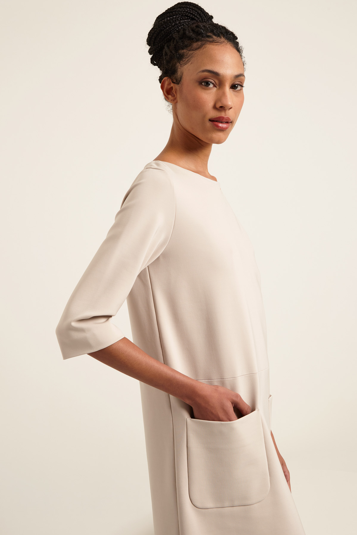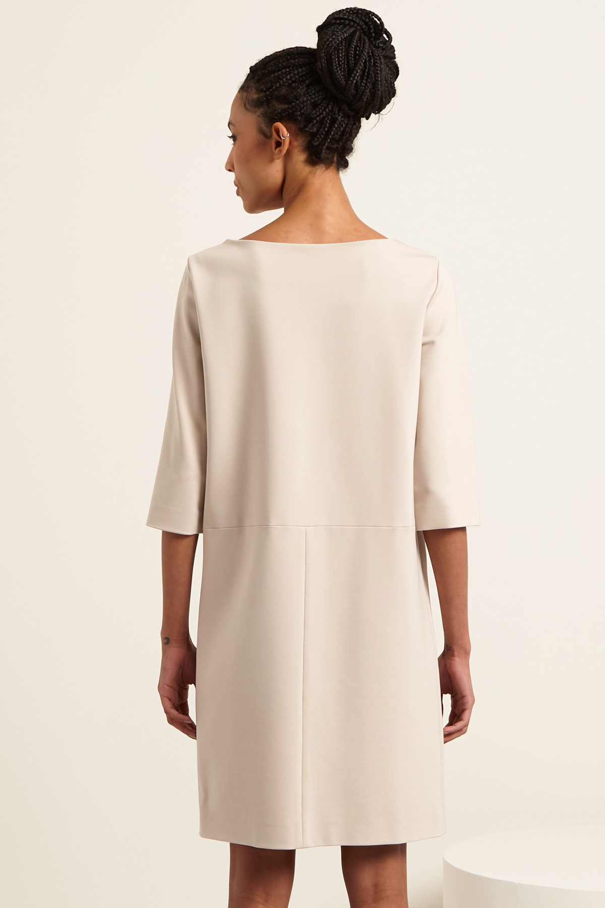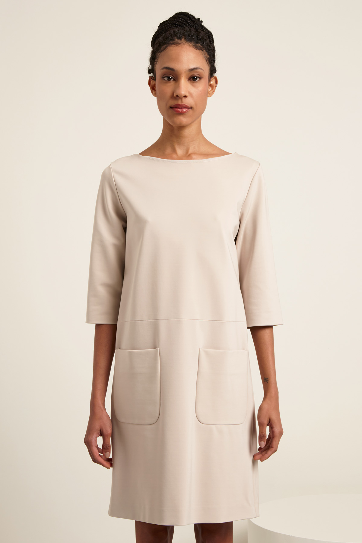 Abito dalla linea dritta realizzato in jersey crèpe di misto viscosa, con scollo a barchetta, maniche tre quarti, taglio in vita e tasche applicate. Semifoderato.