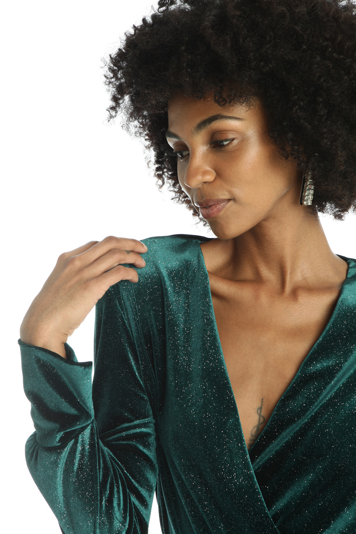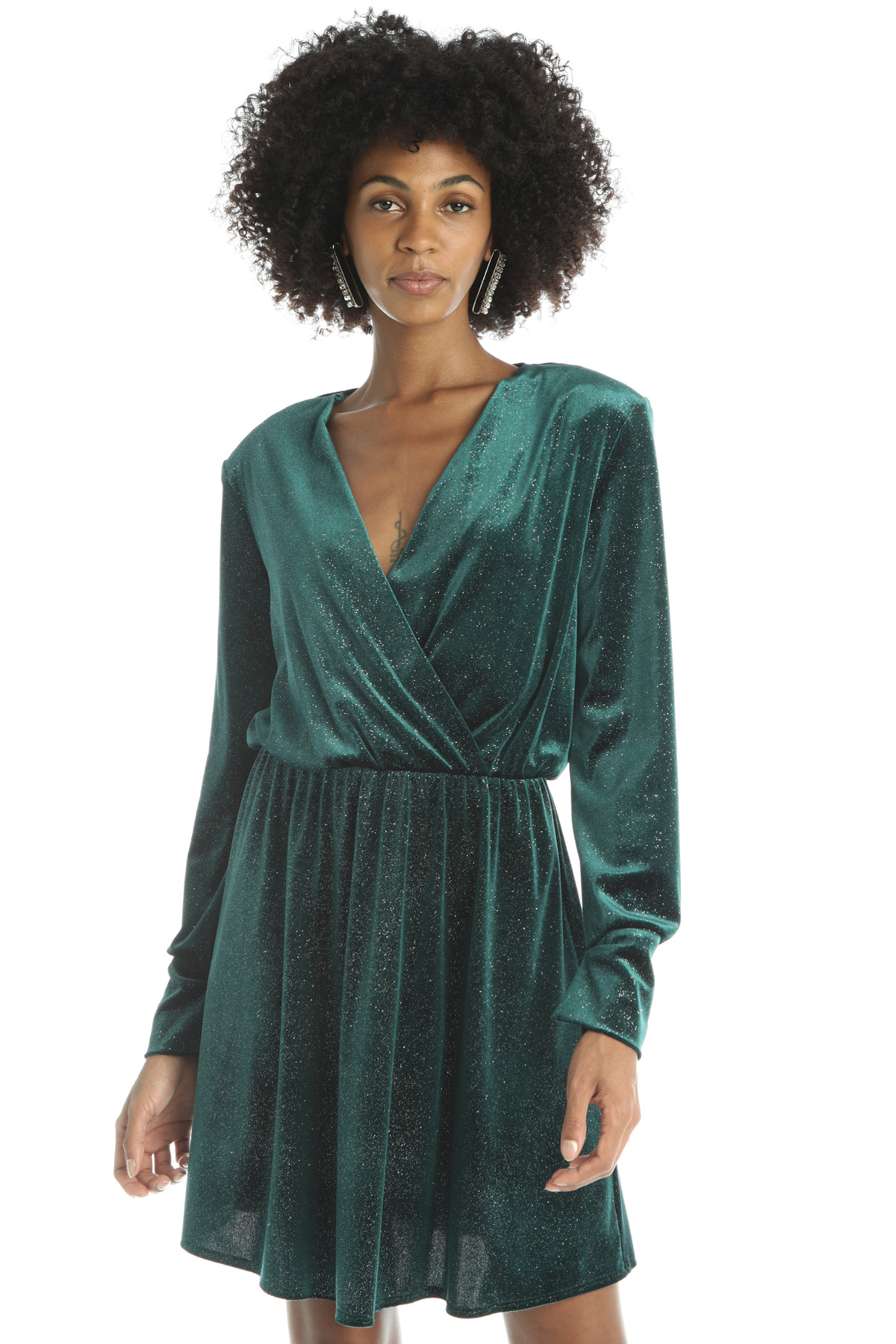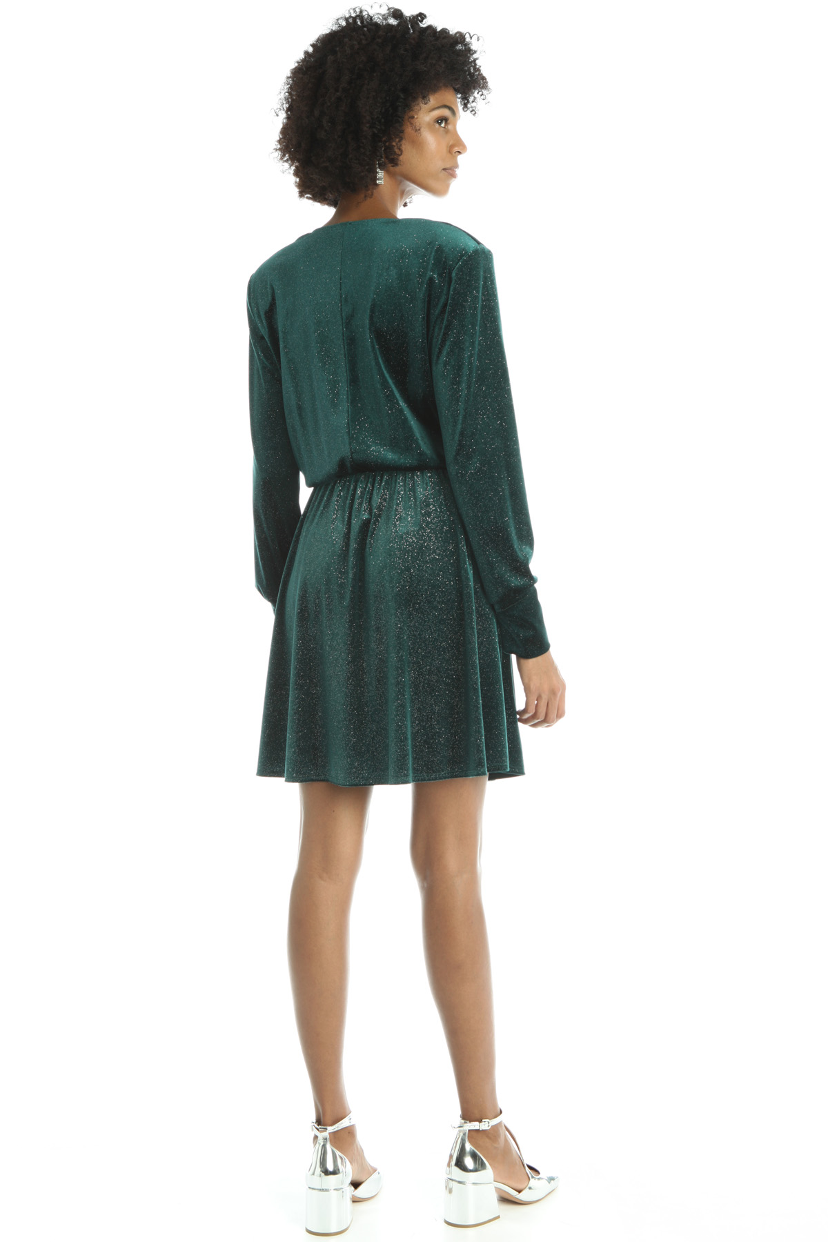 Abito corto realizzato in jersey velluto, con inserto di fibra lamé, scollo a V incrociato, maniche lunghe con polsino, taglio in vita con inserto elastico e arriccio. Capo dotato di fusciacca coordinata.