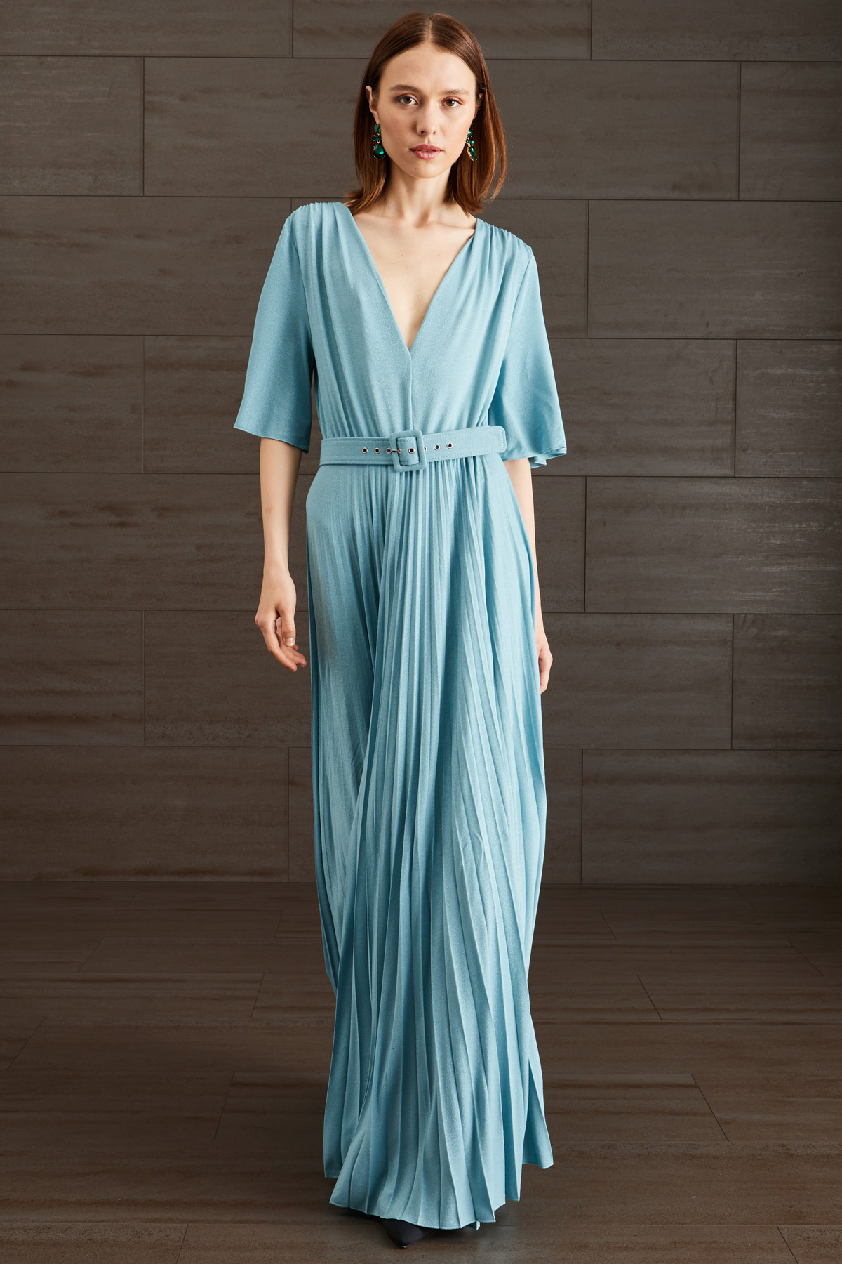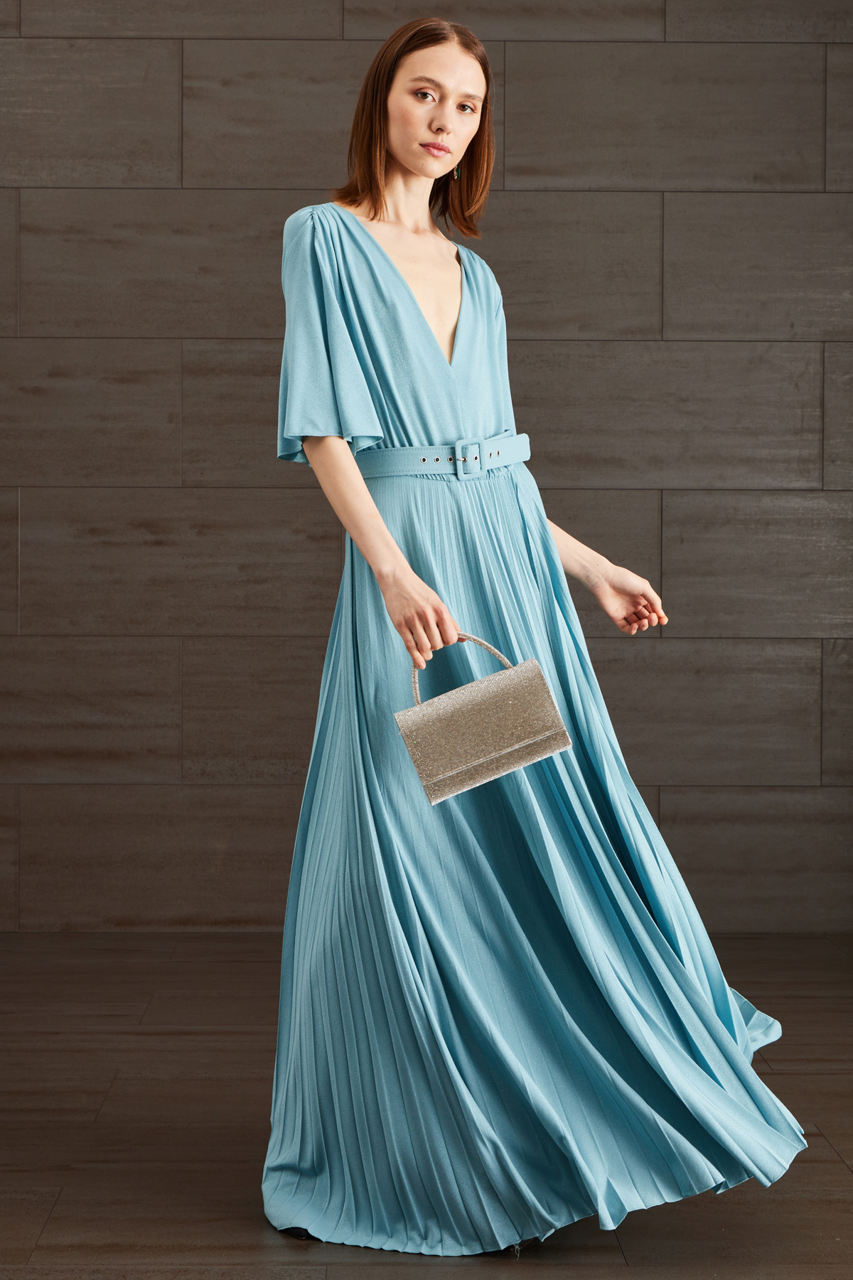 Abito lungo dalla linea morbida realizzato in jersey di misto viscosa lamè, con scollo a V, maniche corte, inserto elastico in vita, lavorazione plissè sulla gonna e apertura a V con nastrini da annodare nel retro. Capo dotato di cintura in abbinamento.