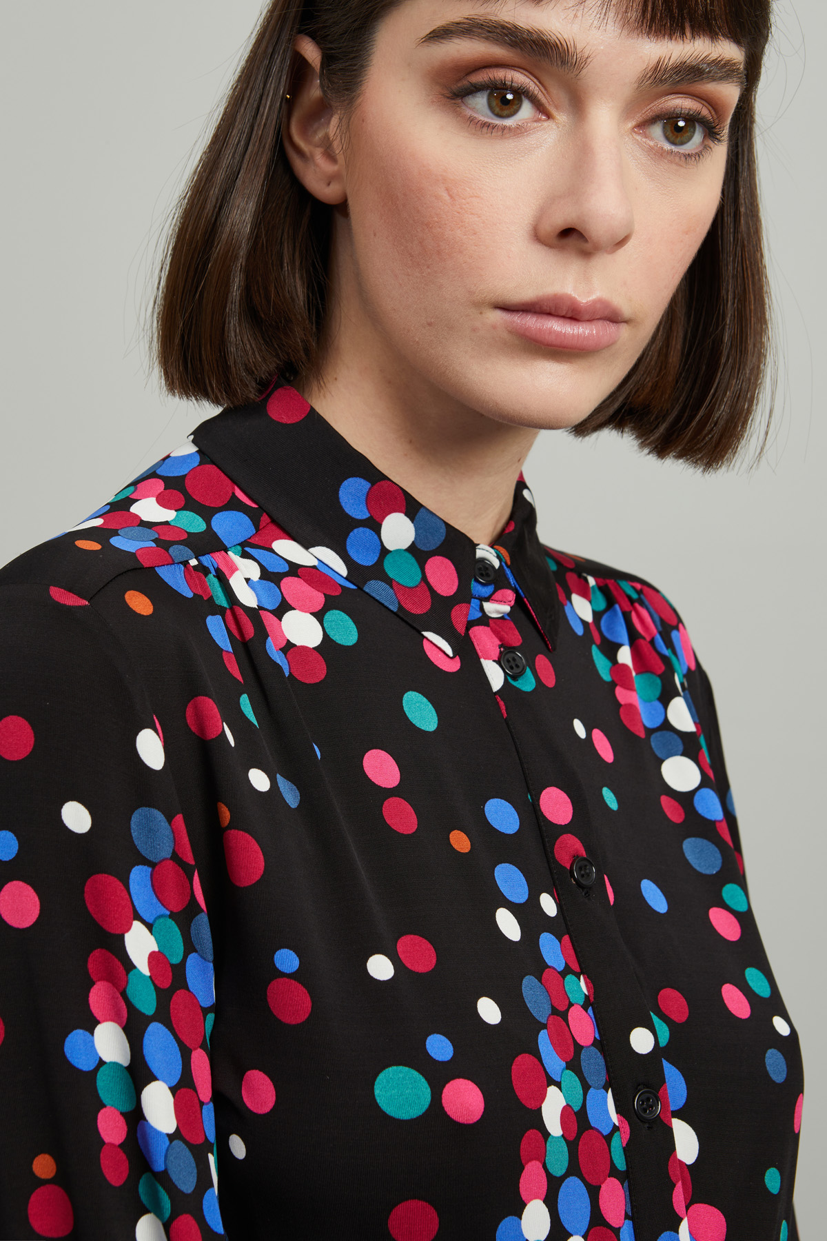 Abito dalla linea morbida realizzato in jersey stampato con collo a camicia, maniche lunghe con inserto elastico sul fondo e in vita, spacco sul fondo. Allacciatura tramite bottoni.
