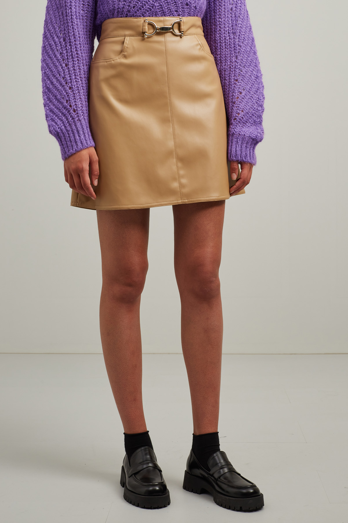 Gonna corta dalla linea ad A realizzata in similpelle con morsetto in metallo dorato sul davanti, tasche alla francese e a filetto nel retro. Chiusura con zip invisibile sul fianco. Foderata.
