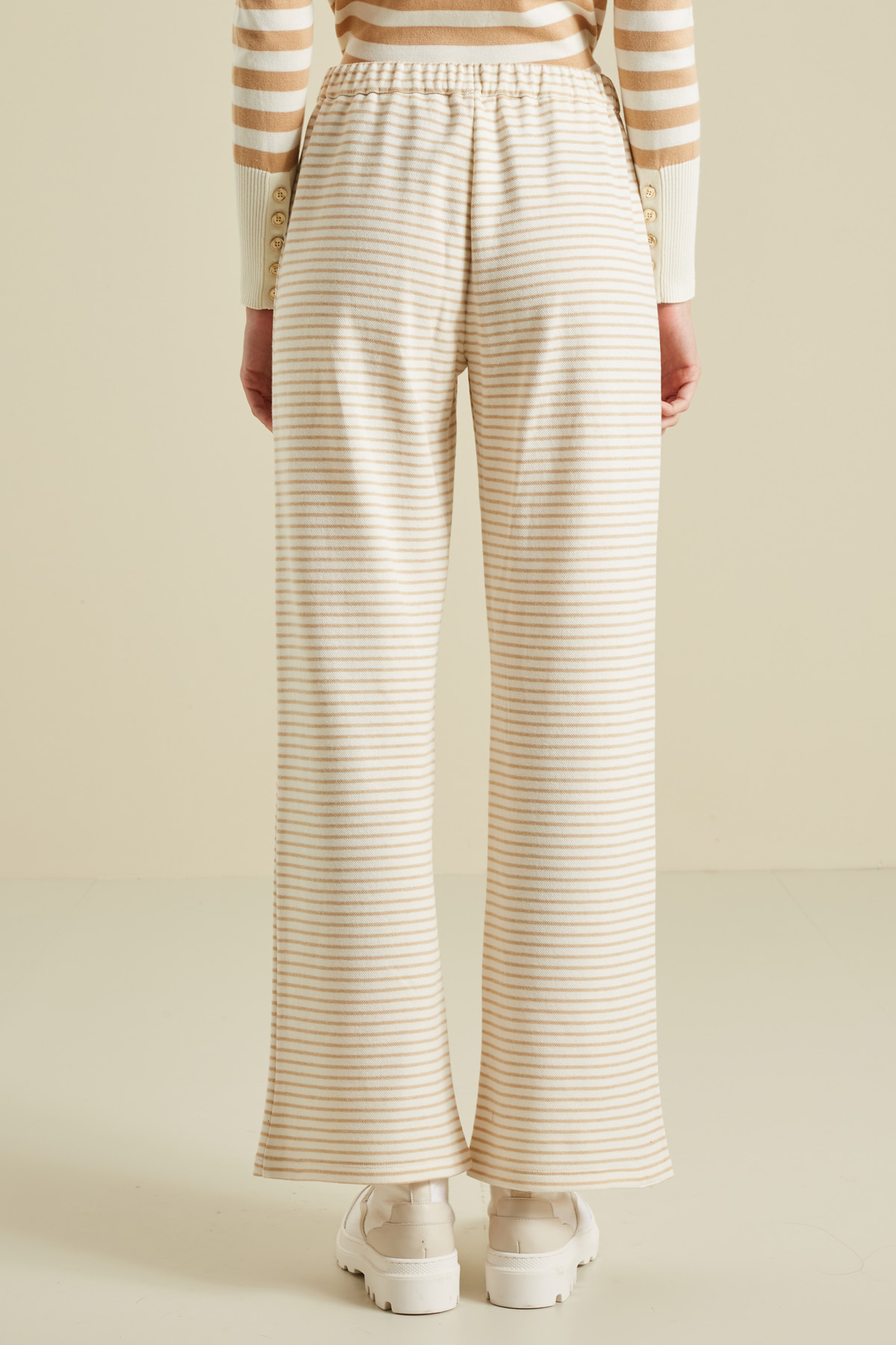 Pantaloni a gamba larga realizzati in doppio jersey di cotone piquet, con inserto elastico in vita dietro, tasche a filetto davanti e chiusura tramite zip coperta e bottone.