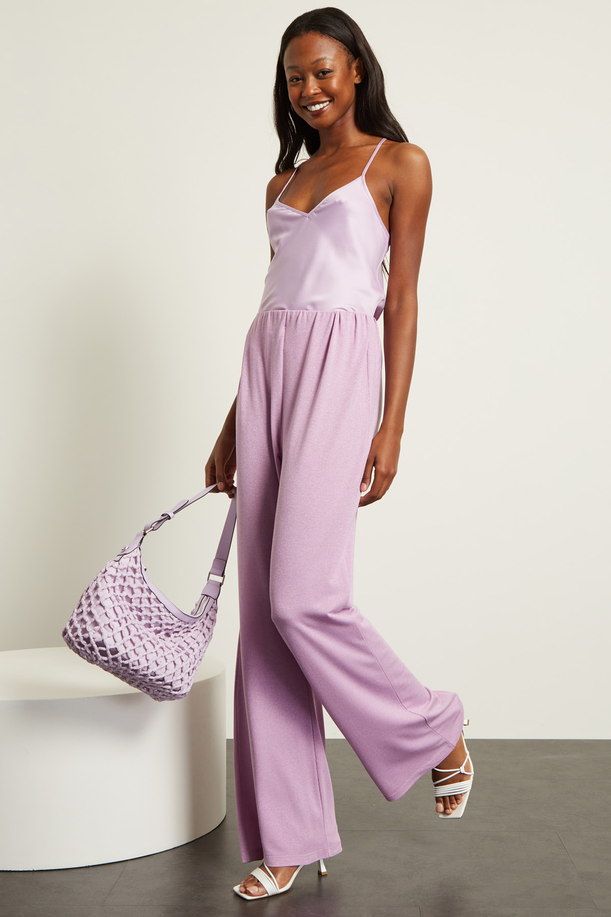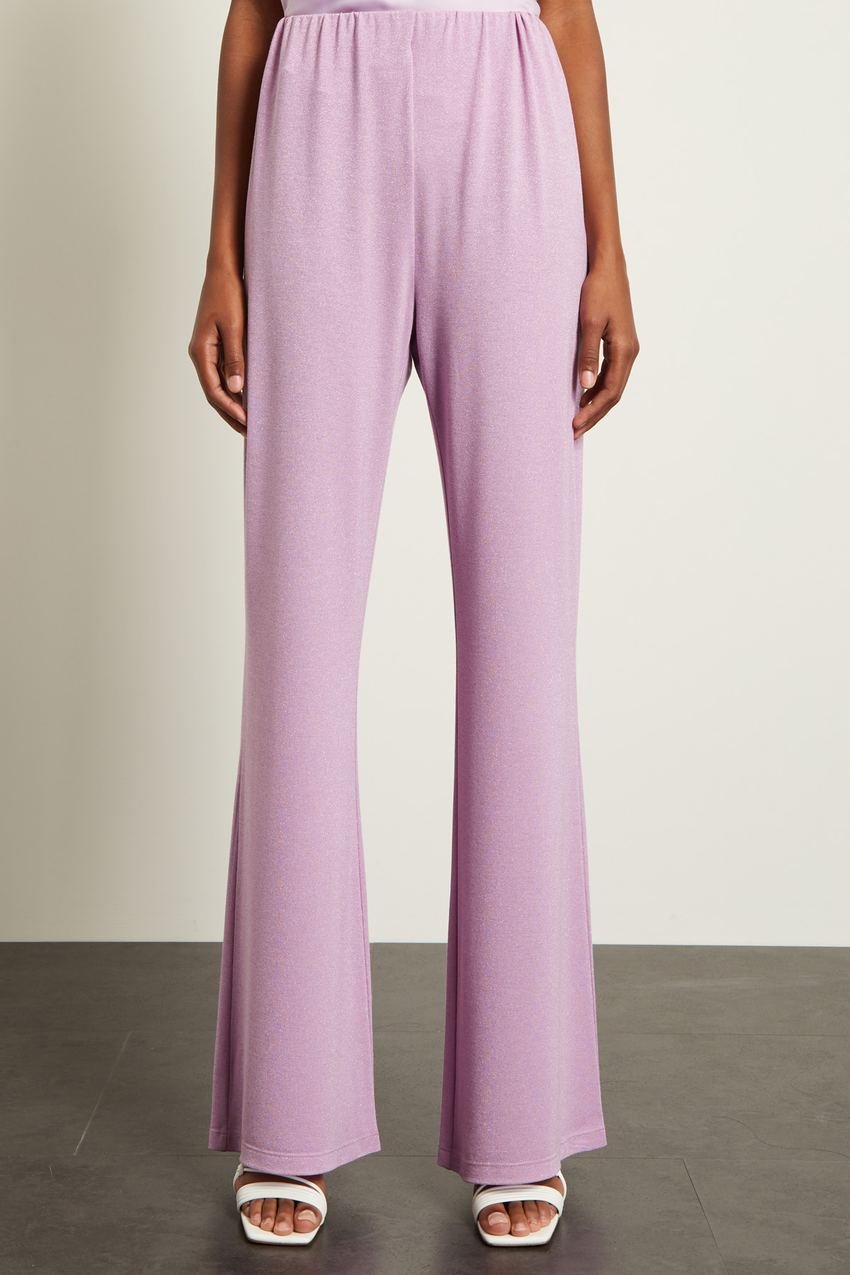 Pantaloni a palazzo realizzati in jersey di misto viscosa lamè, con inserto elastico in vita.