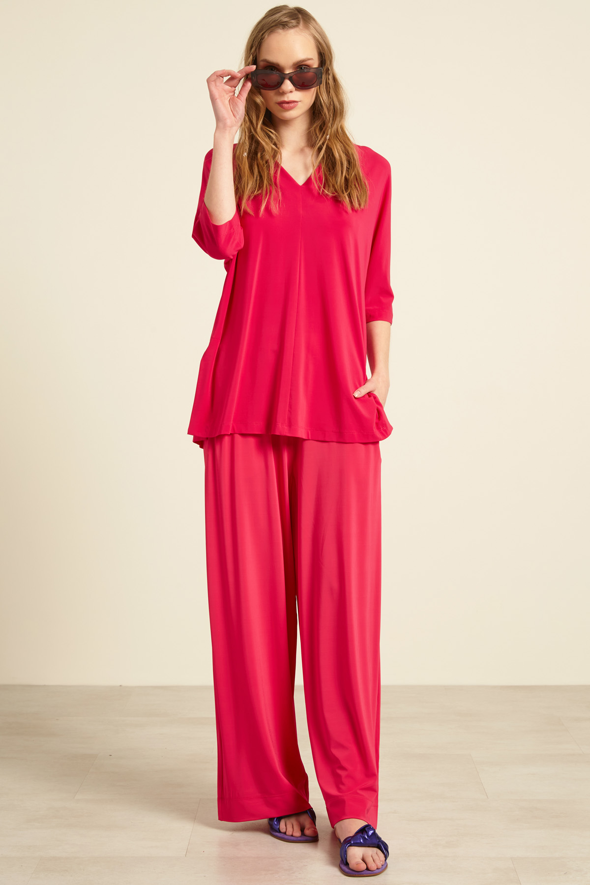 Pantaloni dalla linea morbida realizzati in jersey di viscosa, con inserto elastico in vita e tasche alla francese.