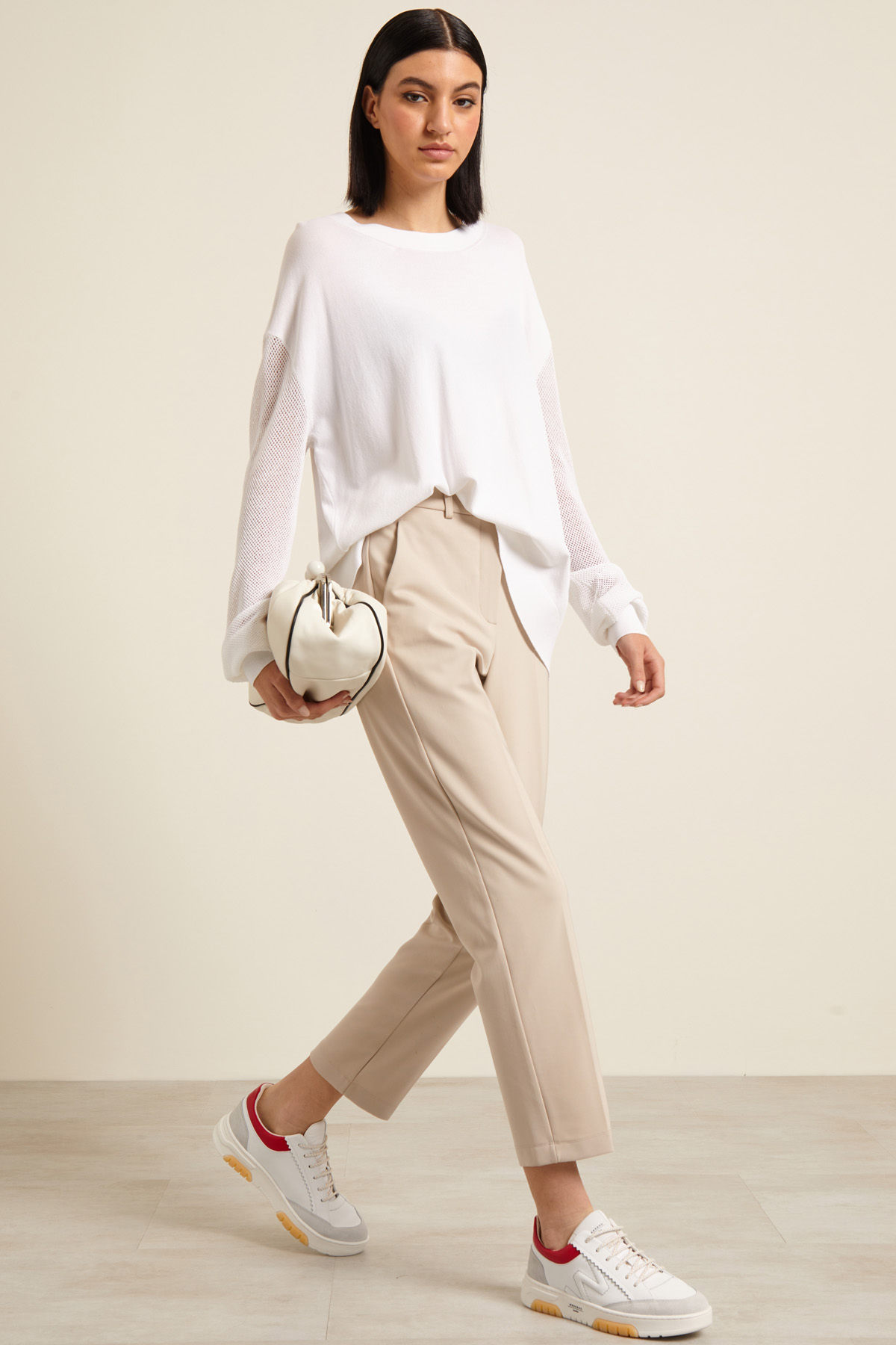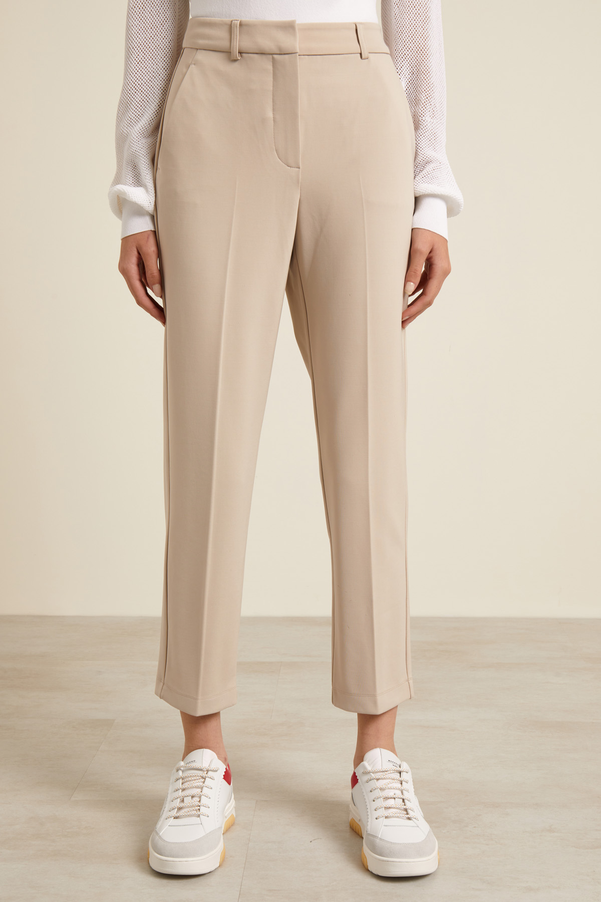 Pantaloni carrot realizzati in jersey crèpe di viscosa, con passanti in vita, tasche alla francese sul davanti e piega stirata in vita. Allacciatura nascosta tramite zip bottone e gancio.