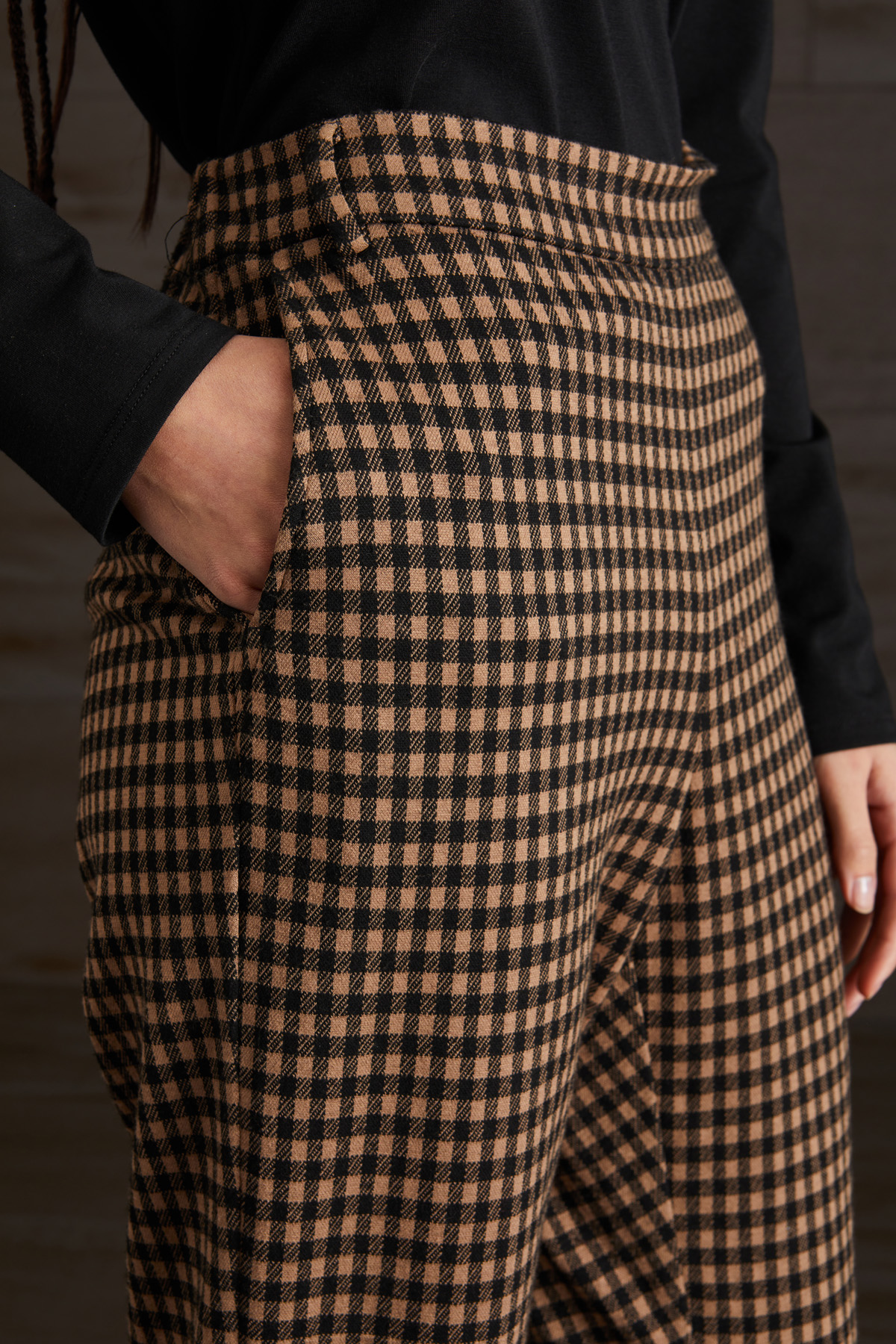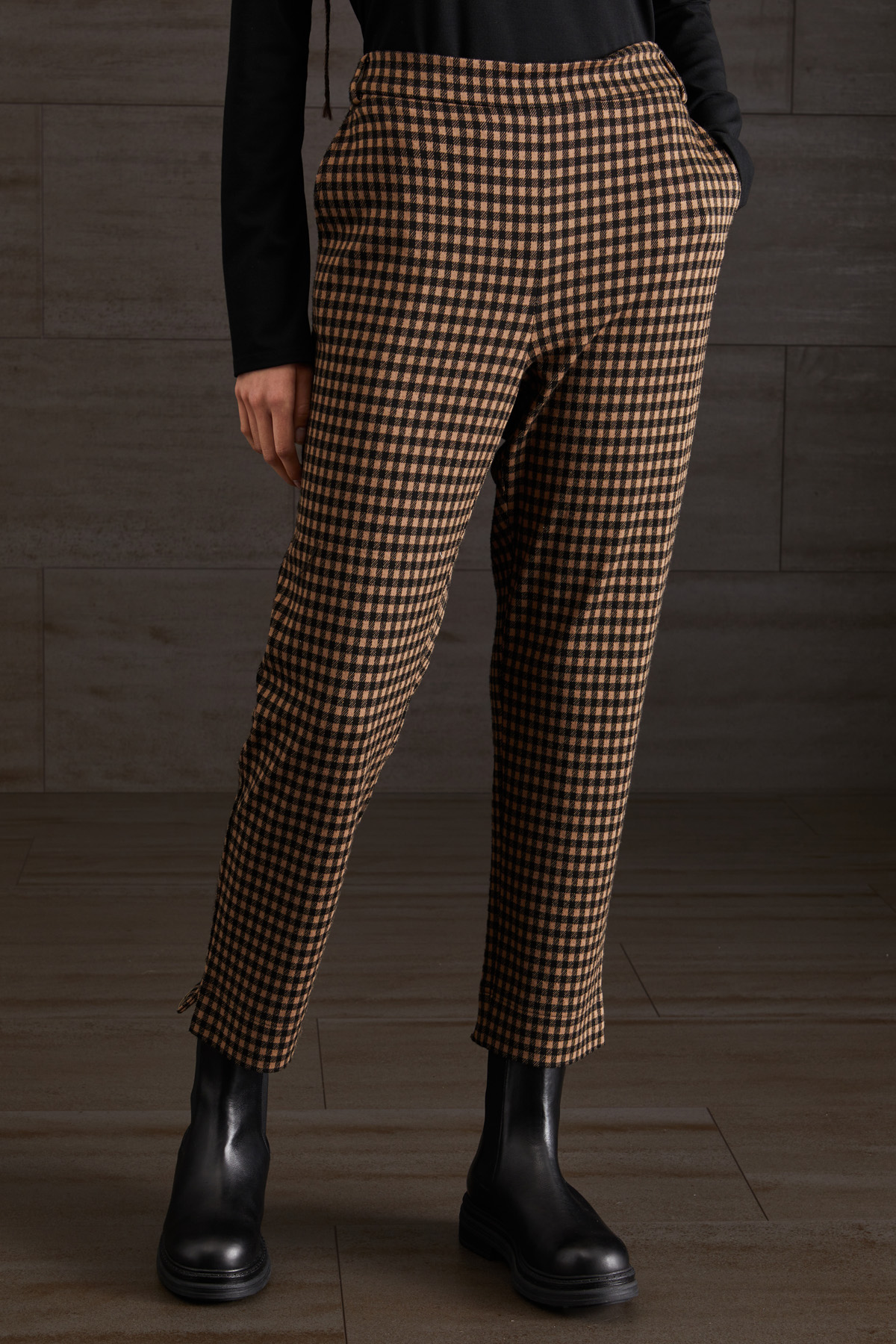 Pantaloni dalla linea dritta realizzati in jersey di misto viscosa, con inserto elastico e passanti in vita, tasche alla francese sul davanti.