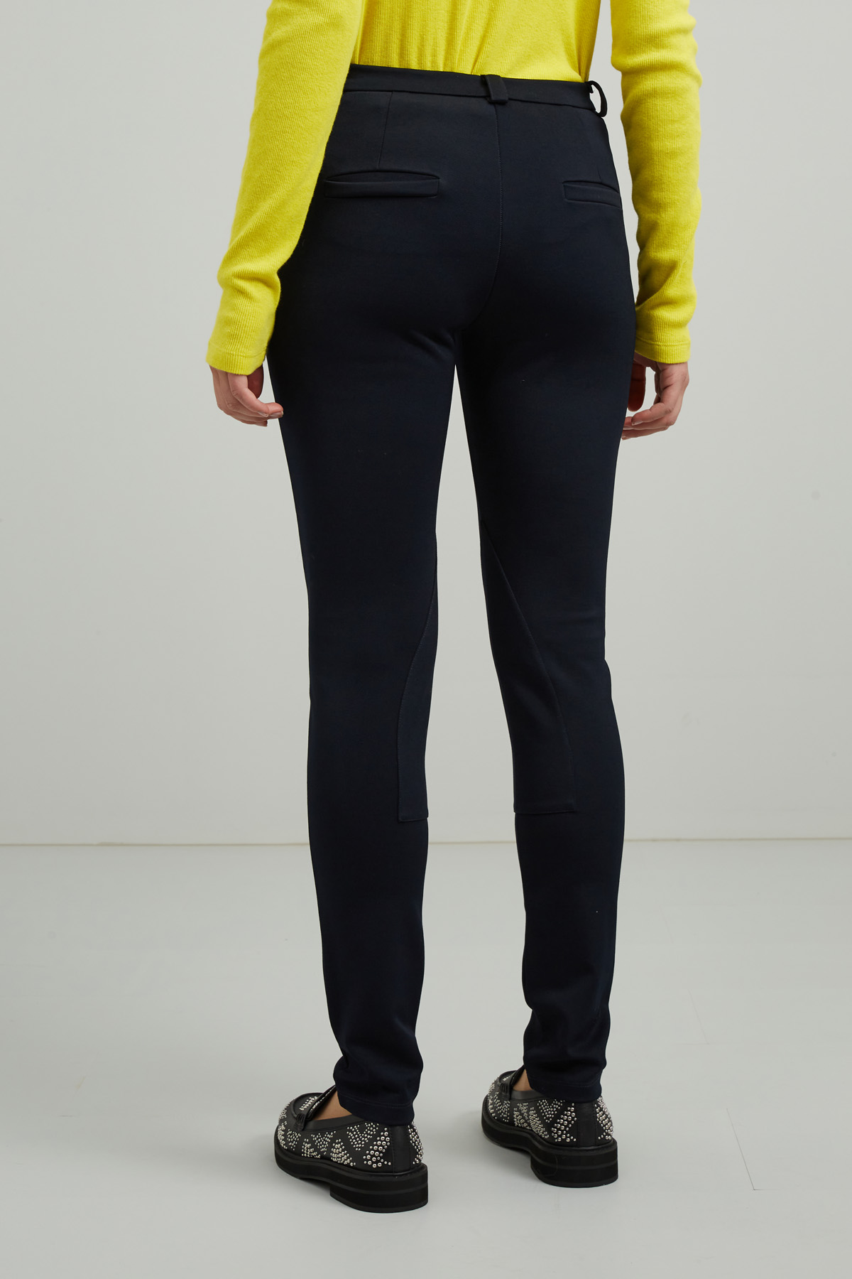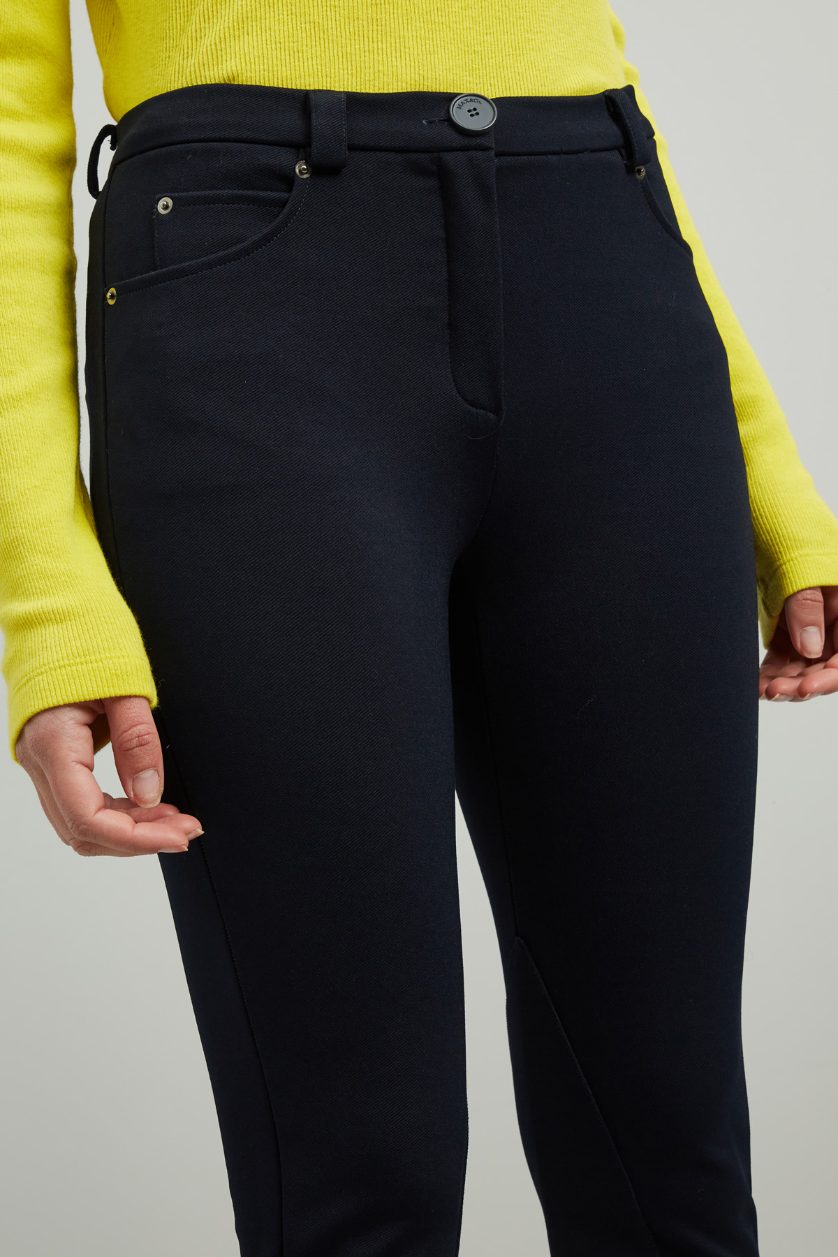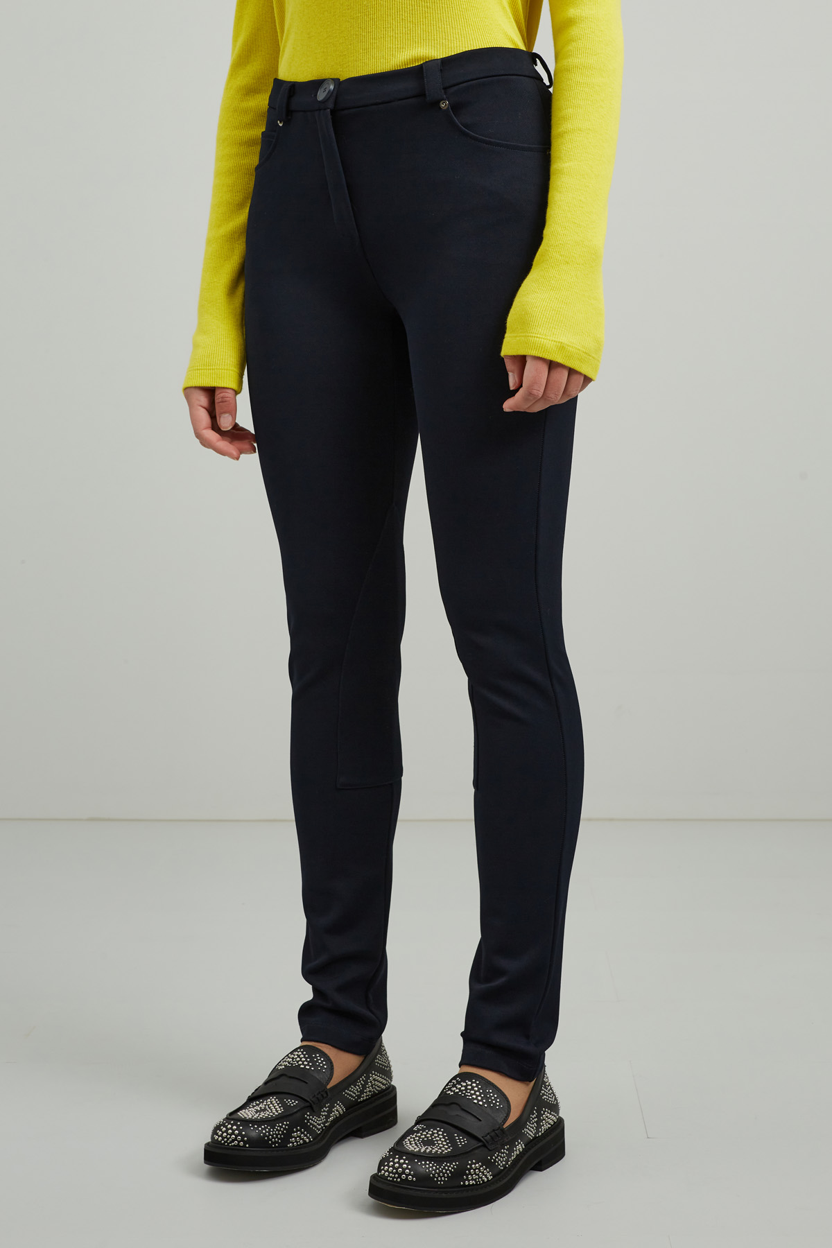 Pantaloni a sigaretta dalla linea aderente realizzati in tessuto diagonale di misto viscosa stretch, con passanti in vita, tasche laterali alla francese e a filetto nel retro. Allacciatura tramite zip nascosta e bottone.