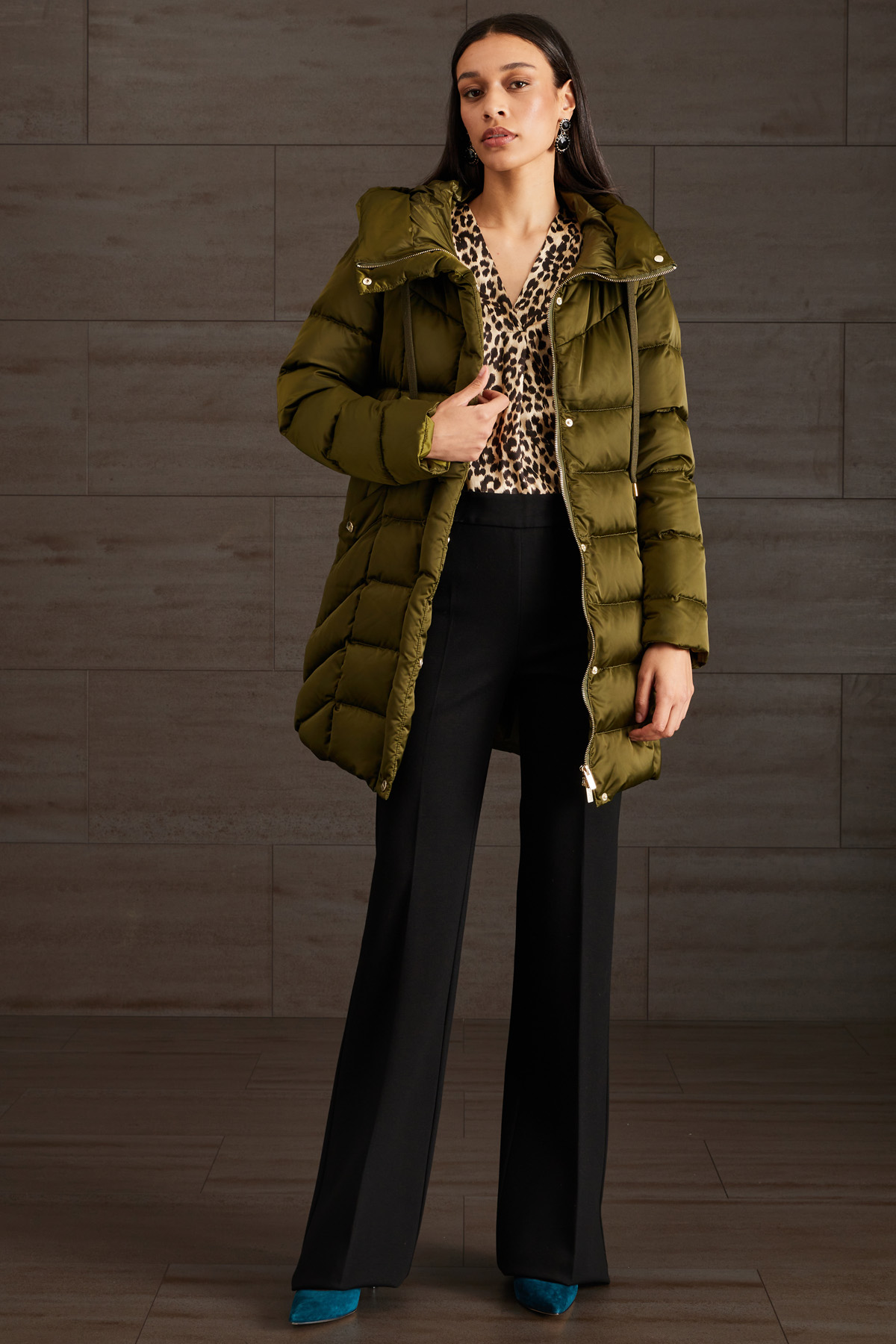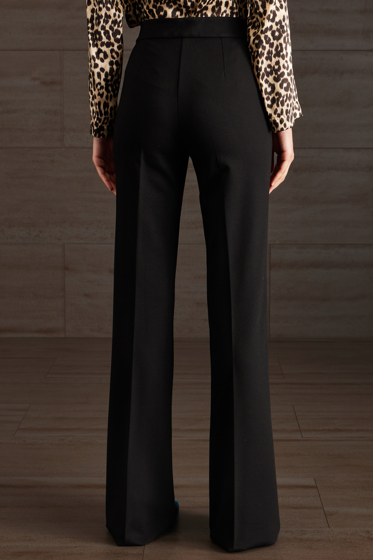 Pantaloni a palazzo realizzati in jersey di misto viscosa stretch, con inserto elastico in vita, piega stirata e allacciatura tramite zip invisibile sul fianco.