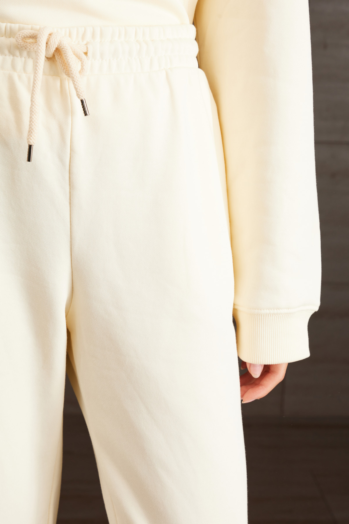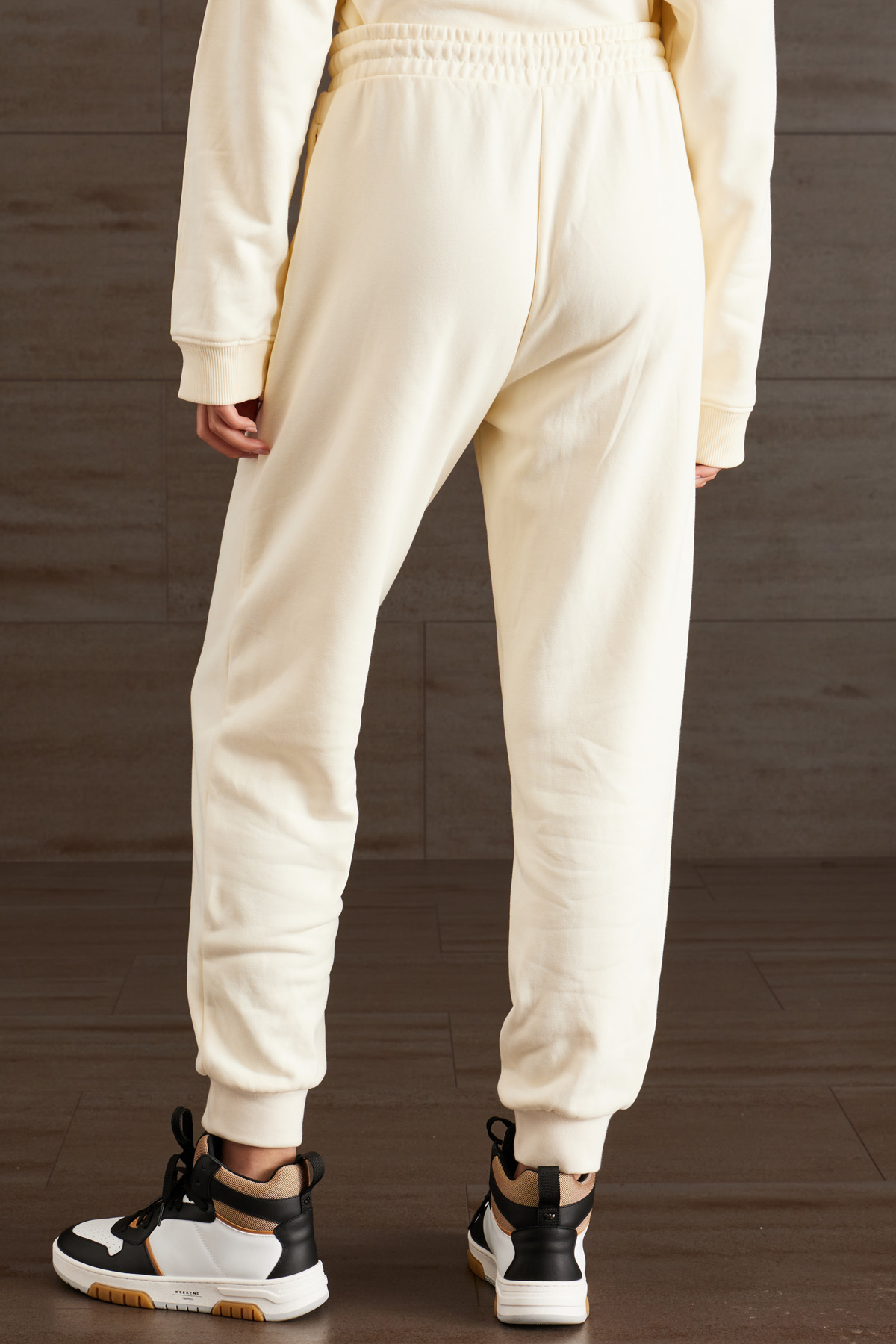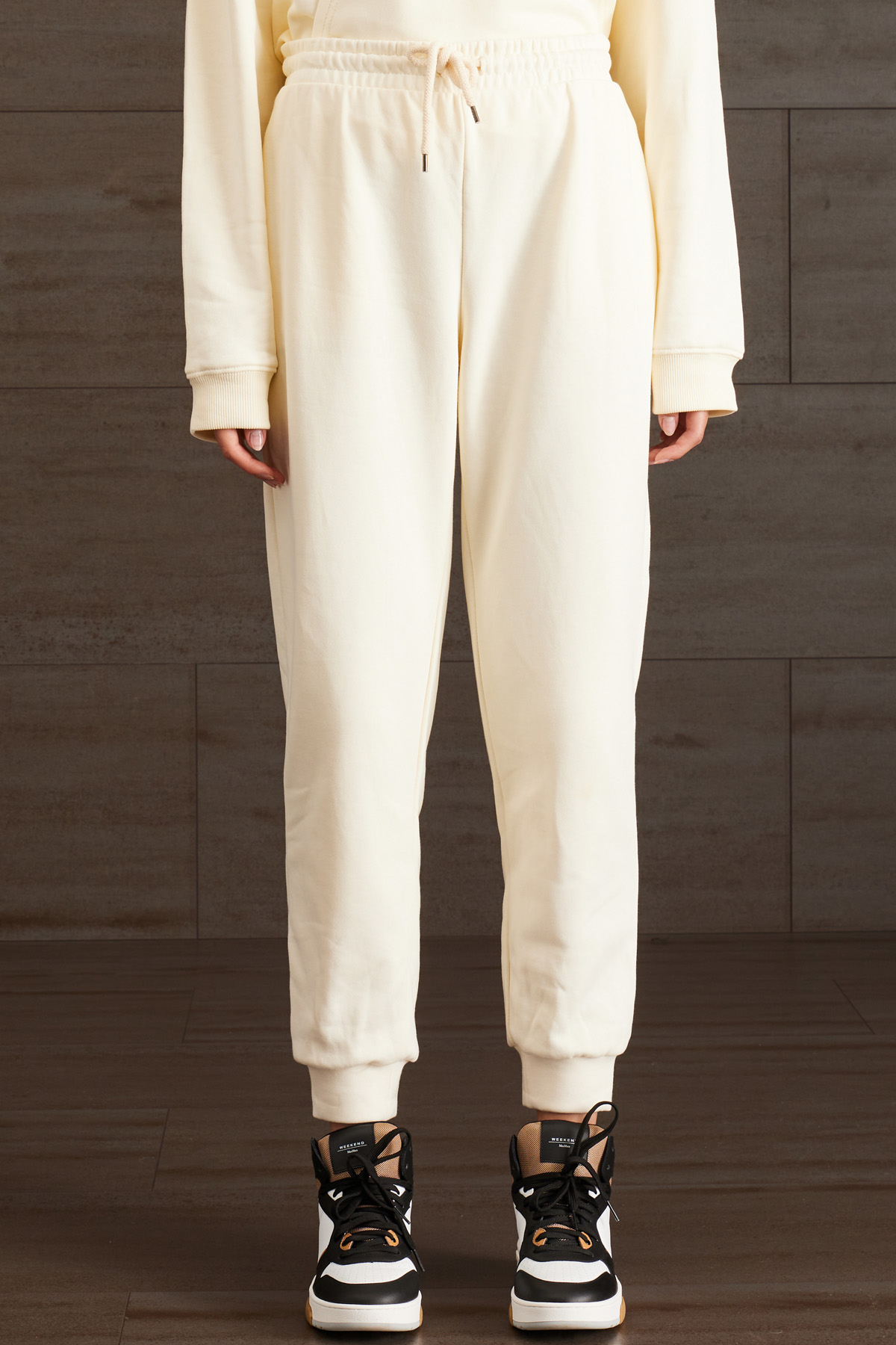 Pantaloni jogger dalla linea dritta realizzati in jersey pesante di misto cotone, con coulisse, inserto elastico in vita e al fondo, tasche laterali inserite in cucitura.