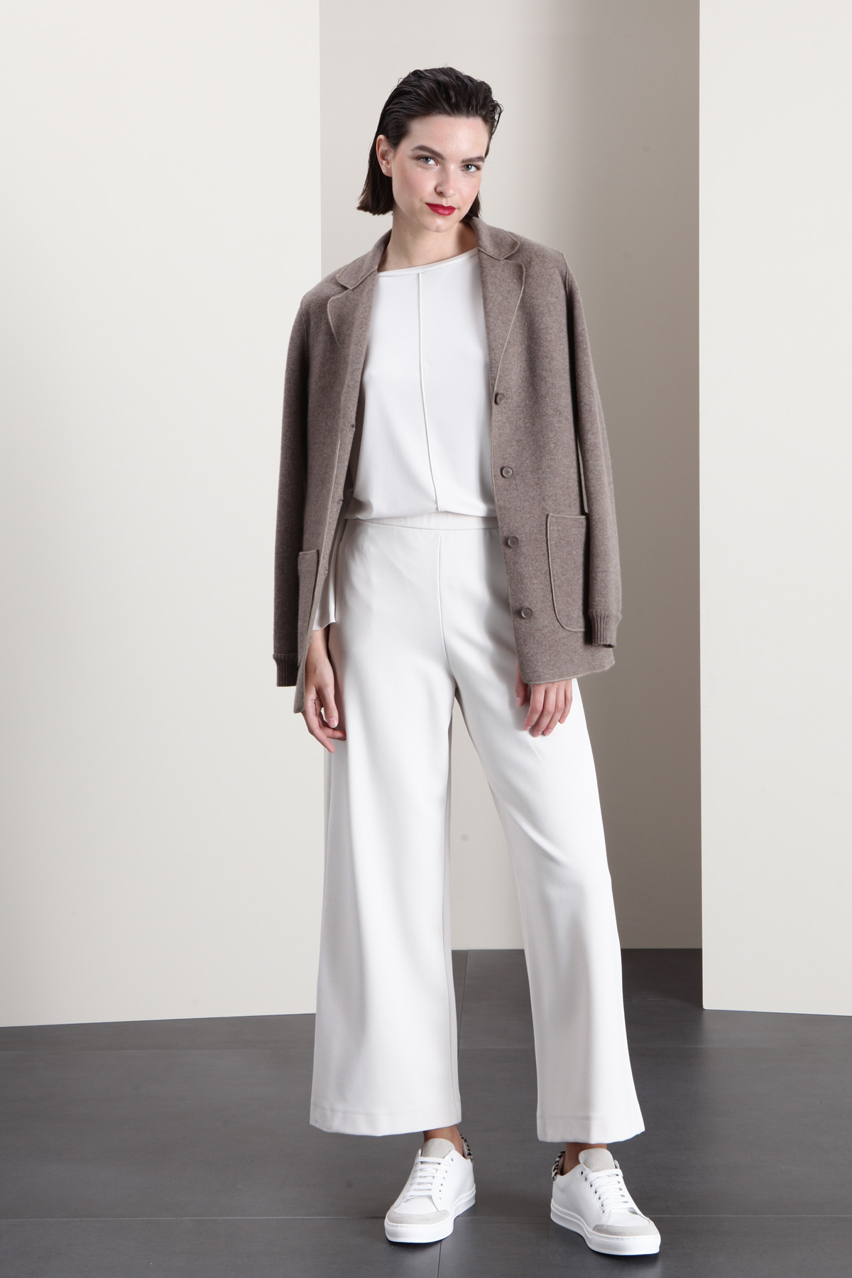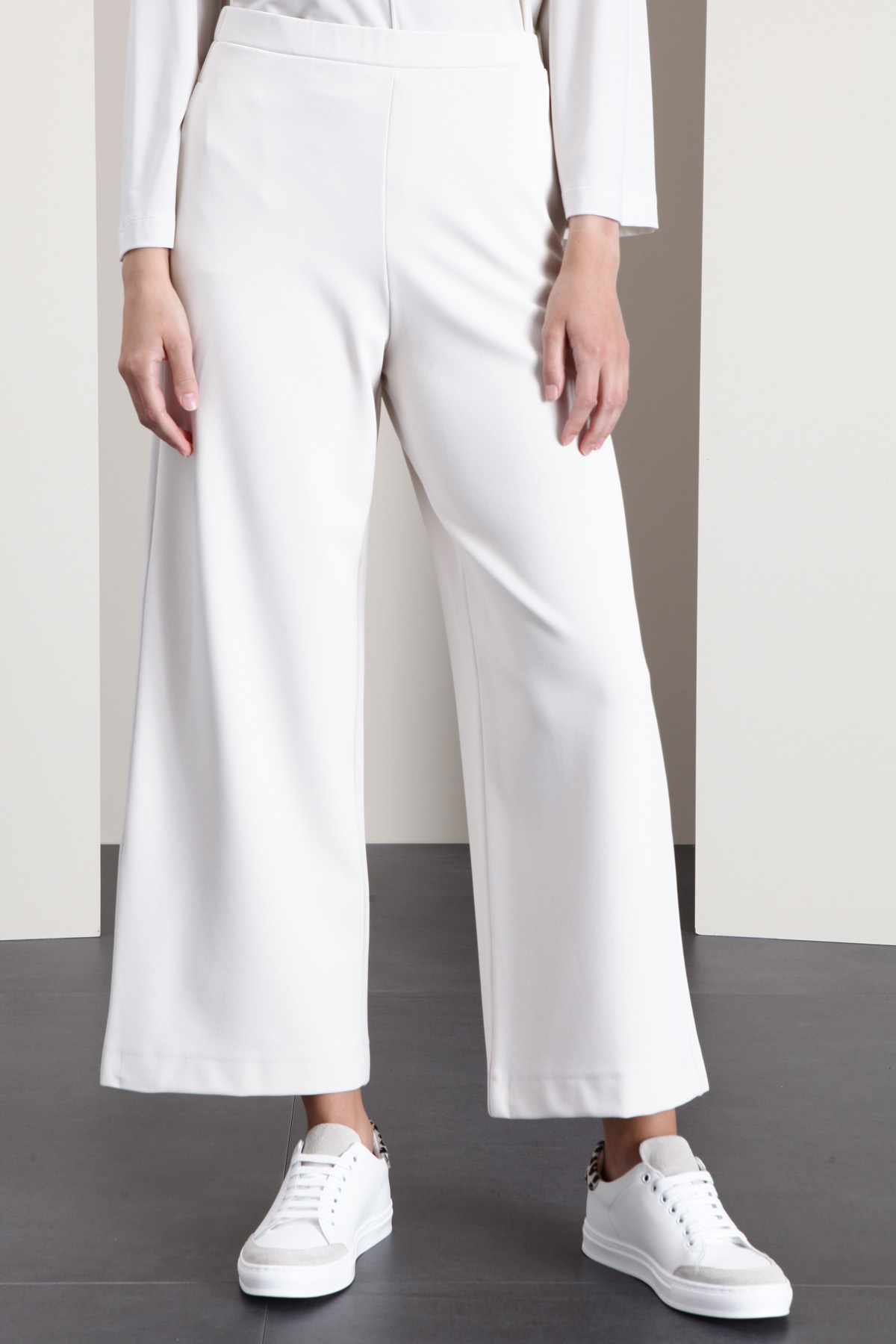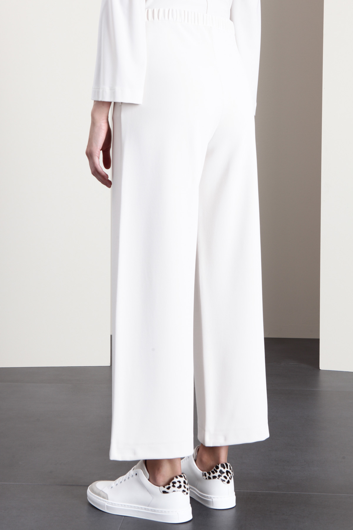 Pantaloni dalla linea svasata realizzati in jersey diagonale stretch, con inserto elastico in vita e tasche laterali inserite in cucitura.