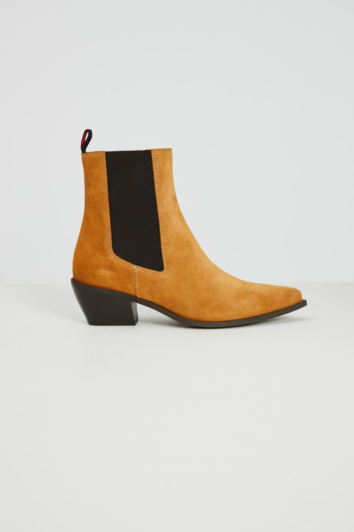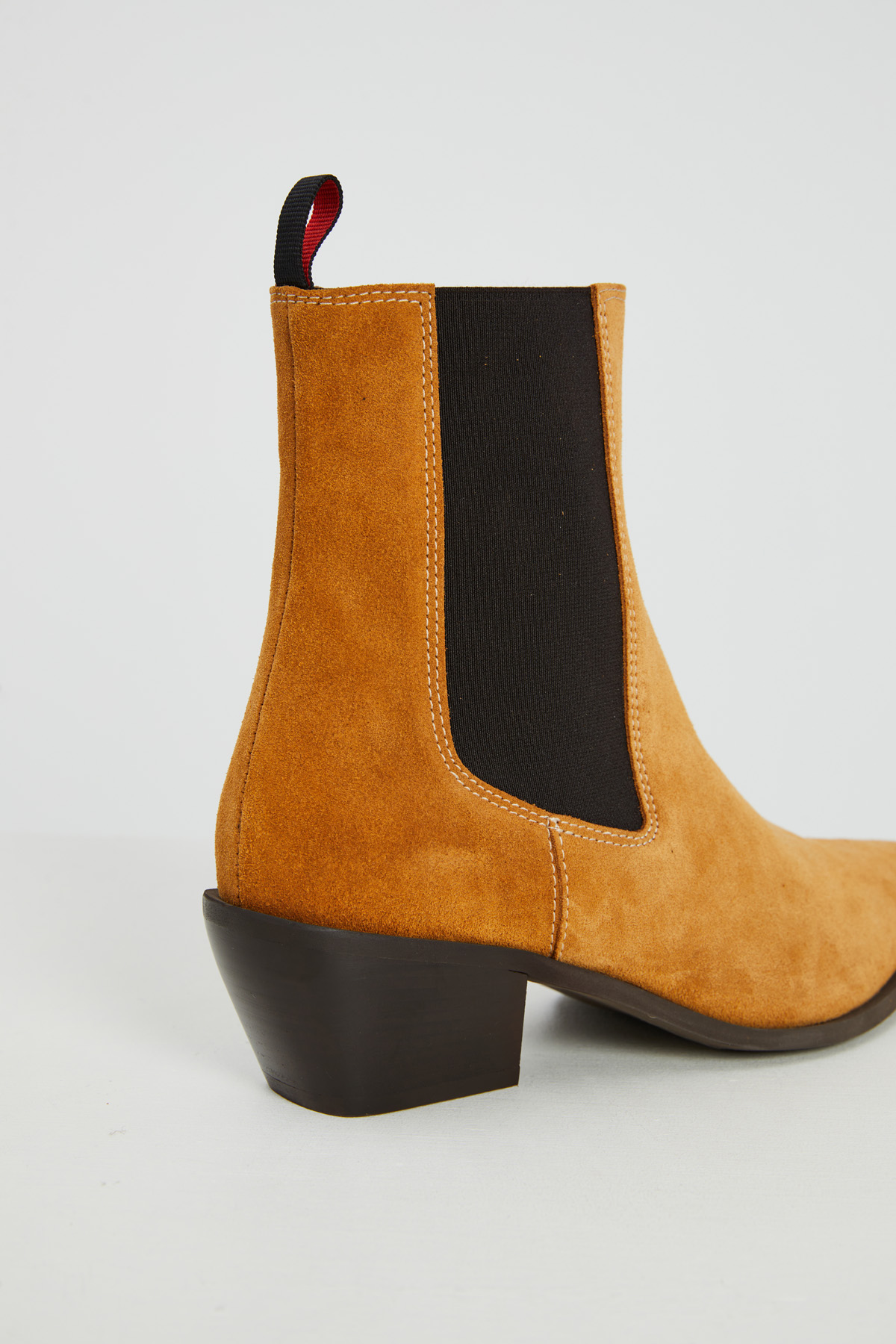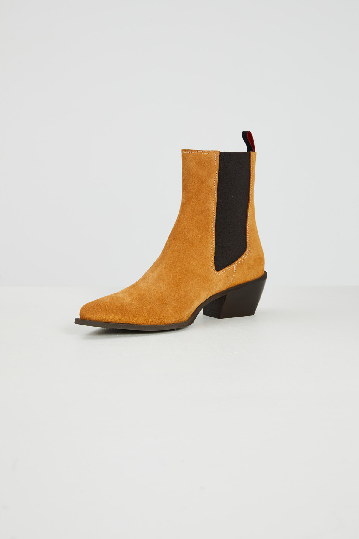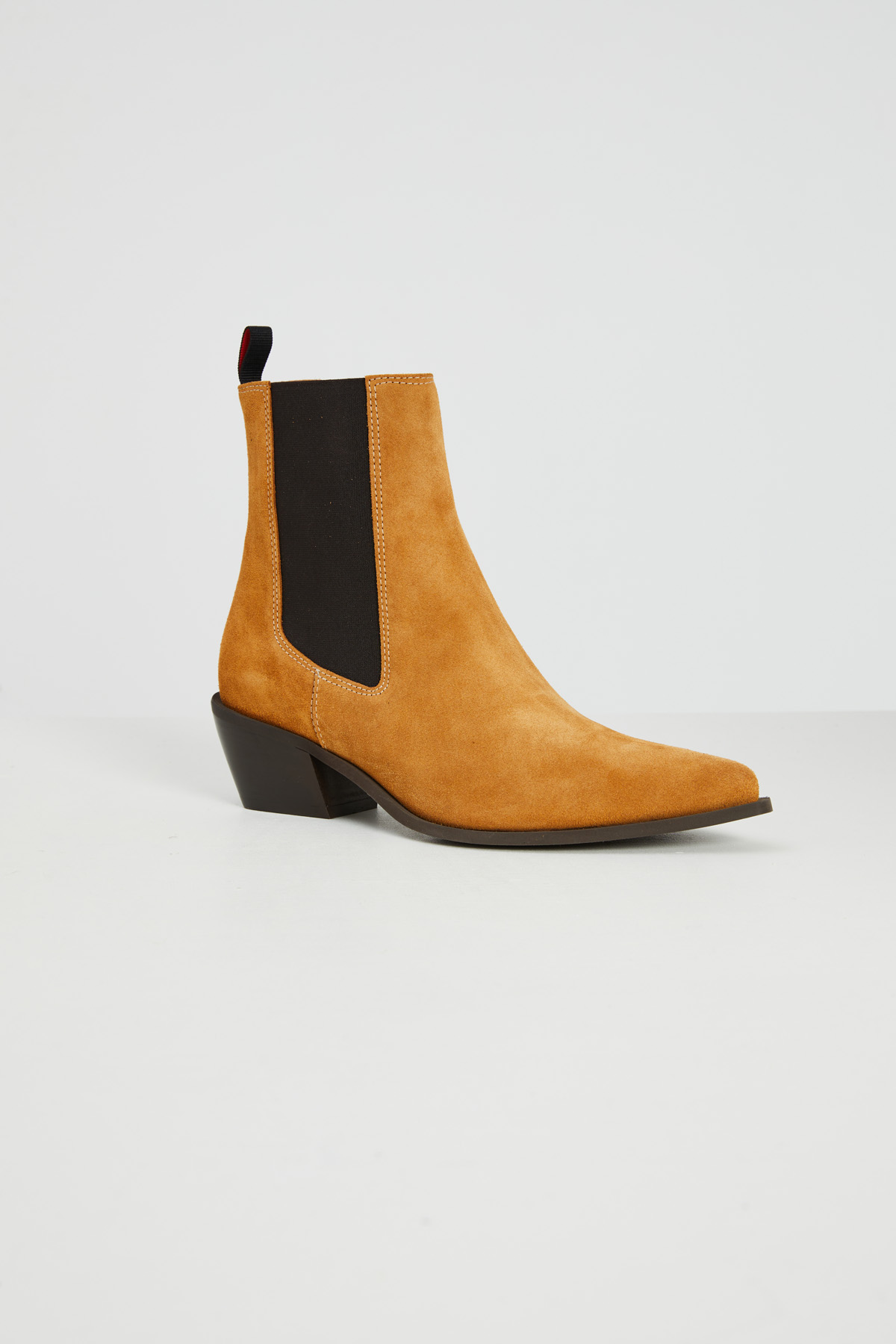 Stivaletti realizzati in vera pelle scamosciata con punta affusolata, tacco basso e inserti elastici laterali. Suola in gomma.