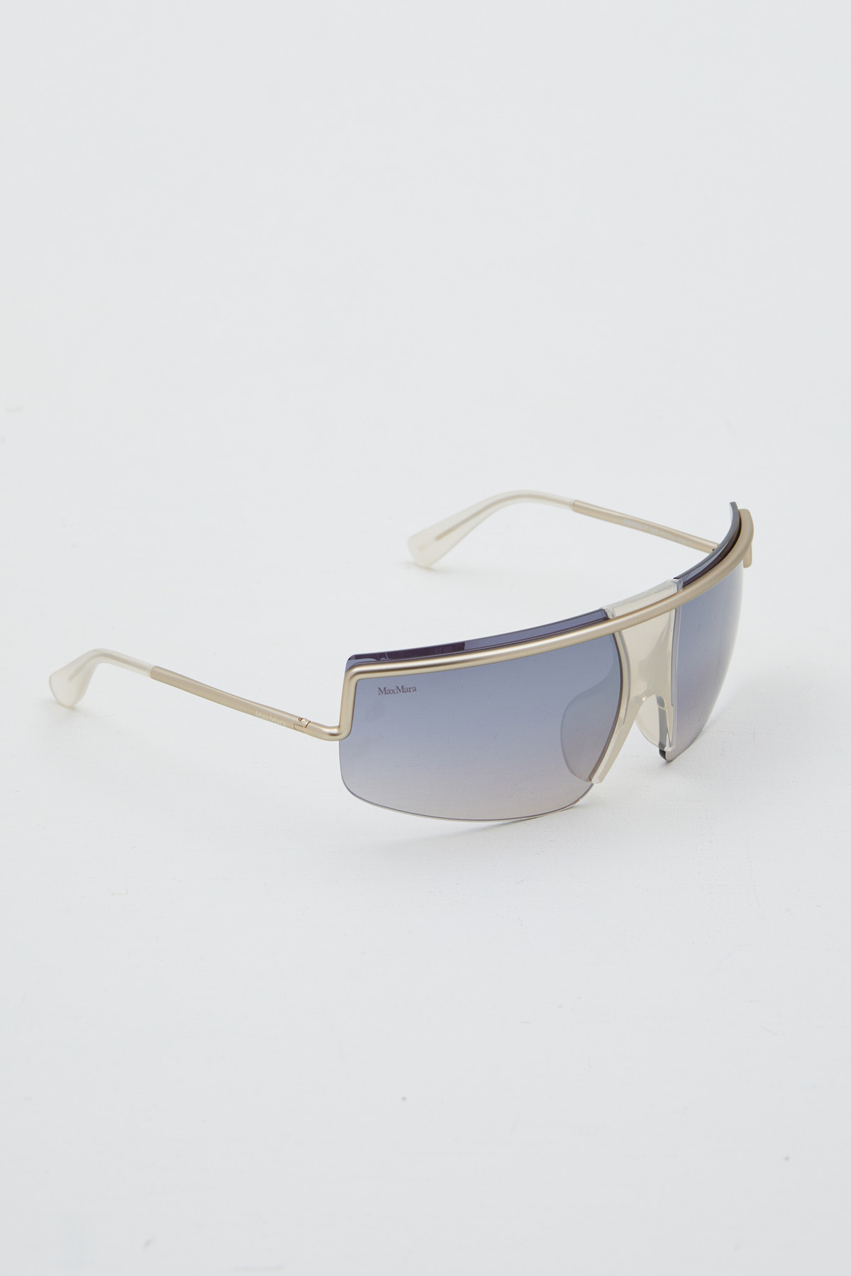 Occhiali da sole a mascherina dalla linea over, con montatura in metallo, dettagli in plastica e terminali a contrasto.