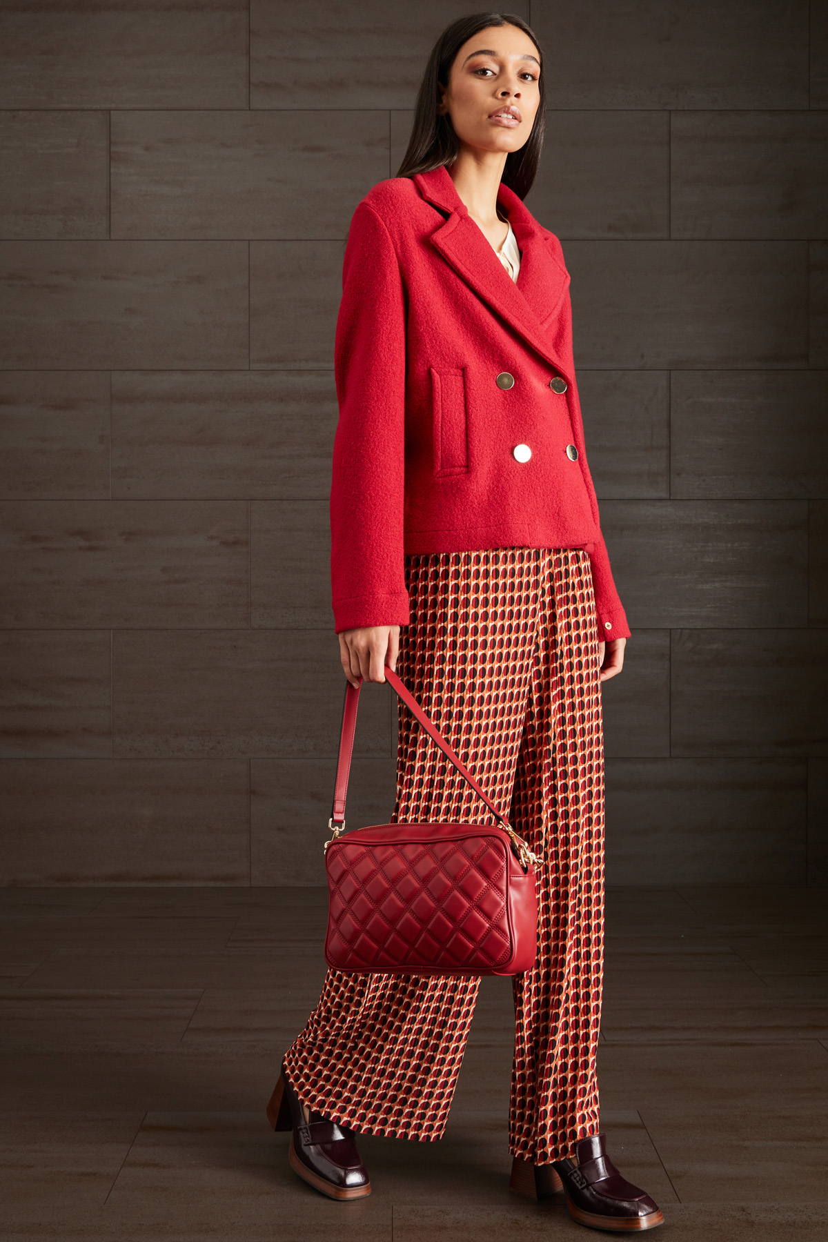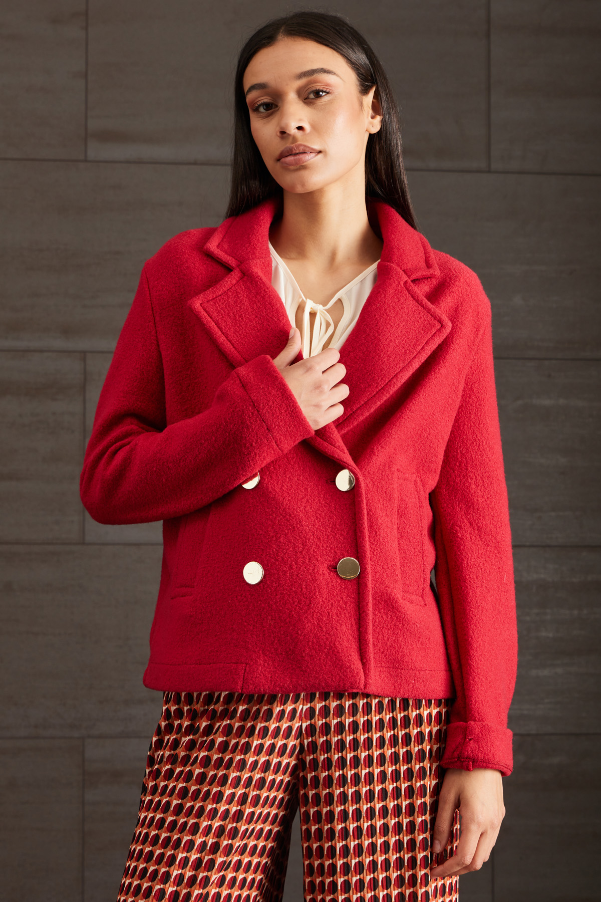 Caban dalla linea dritta realizzato in jersey di pura lana. Il modello ha collo a rever, maniche lunghe e tasche a filettone. Allacciatura doppiopetto tramite bottoni in metallo. Sfoderato.
