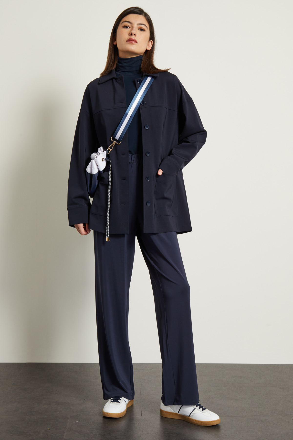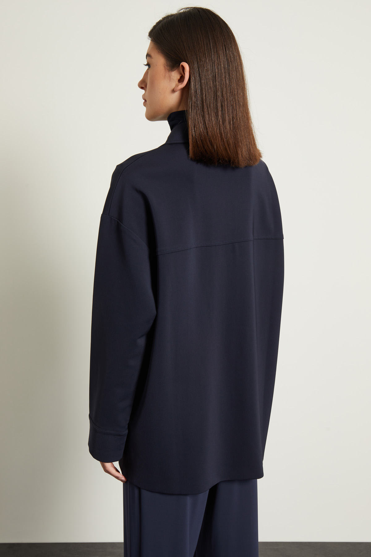 Giacca dalla linea dritta realizzata in jersey tecnico di misto viscosa stretch, con colletto a camicia, maniche lunghe con polsino e tasche applicate sul davanti. Allacciatura tramite bottoni a vista. Sfoderata.