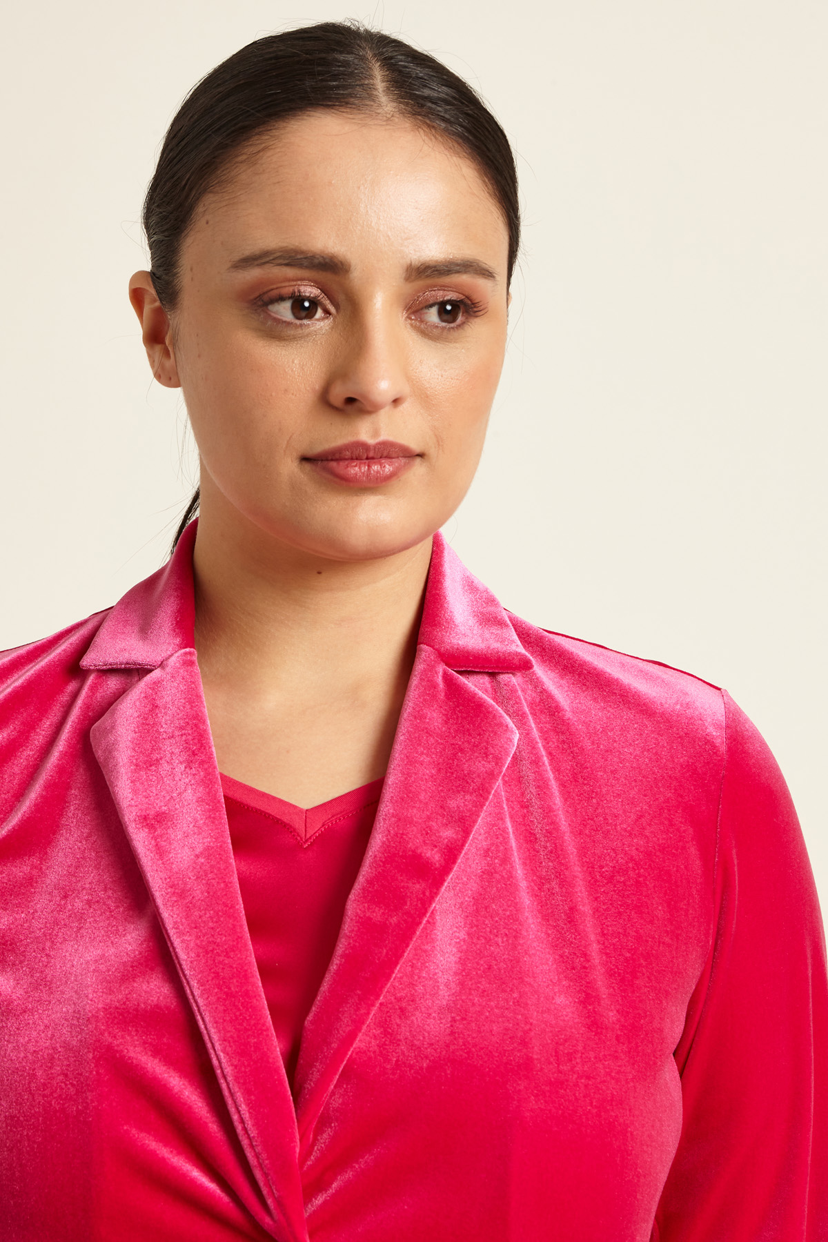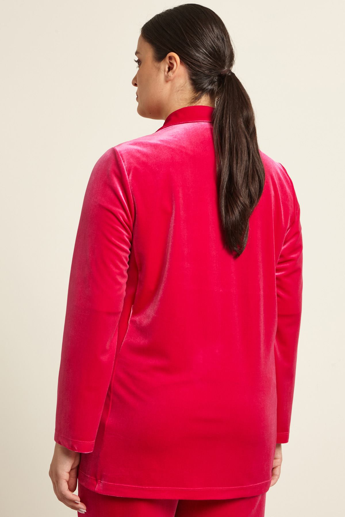 Blazer dalla linea dritta realizzato in ciniglia stretch, con collo a rever, maniche lunghe, tasche laterali inserite in cucitura. Allacciatura monopetto tramite bottoni e cintura coordinata. Sfoderato.