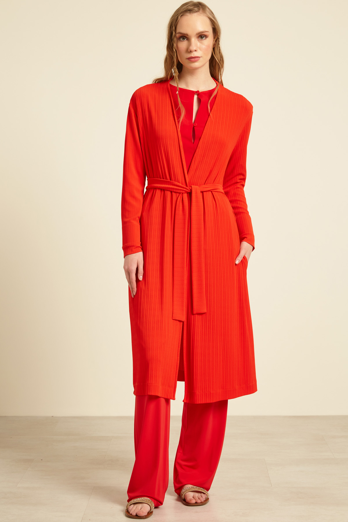 Cardigan lungo dalla linea fluida realizzato in jersey creponne con maniche lunghe dal giro sceso, tasche inserite in cucitura e chiusura tramite cintura coordinata.