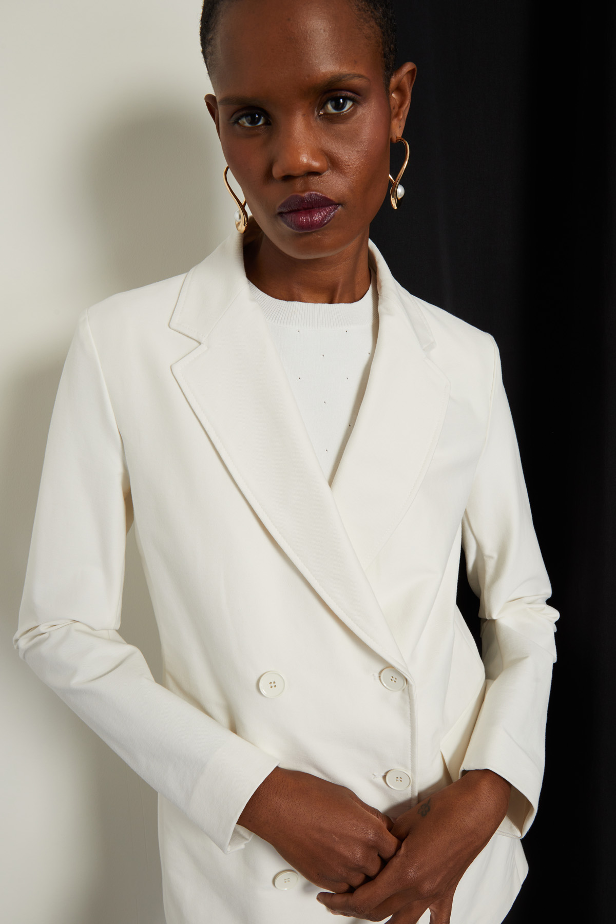 Blazer dalla linea dritta realizzato in jersey diagonale di cotone stretch, con collo a rever, maniche lunghe con bottoni al fondo, tasche a doppio filetto con patta, spacco nel retro. Allacciatura doppiopetto tramite bottoni. Sfoderato.
