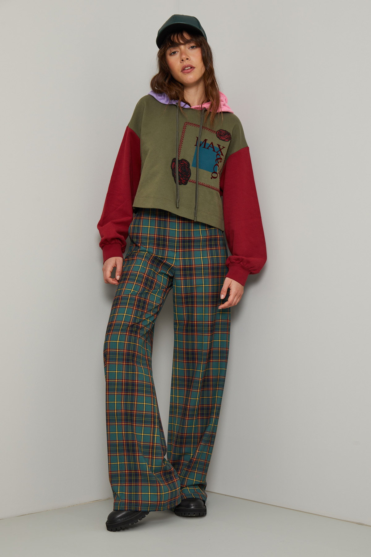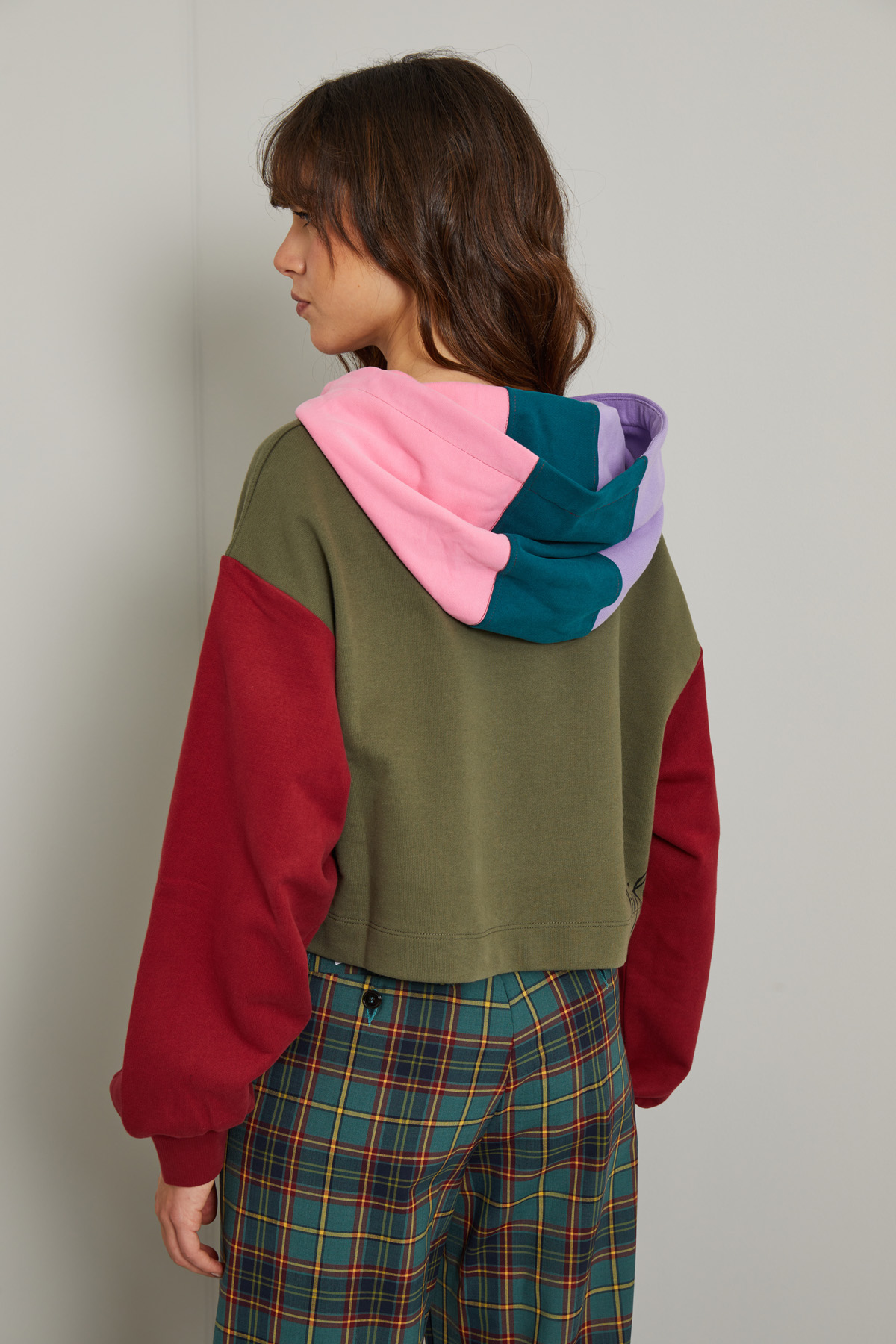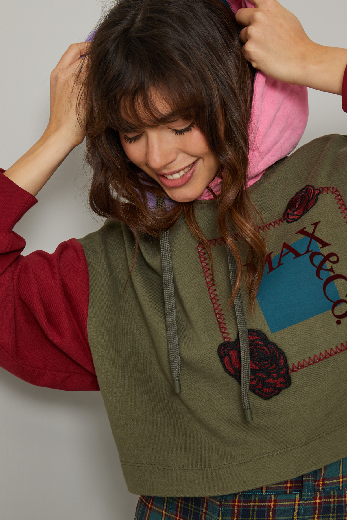 Felpa corta dalla linea dritta realizzata in jersey pesante di puro cotone, con motivo ricamato e dettagli applicati sul davanti, cappuccio con coulisse e maniche lunghe.