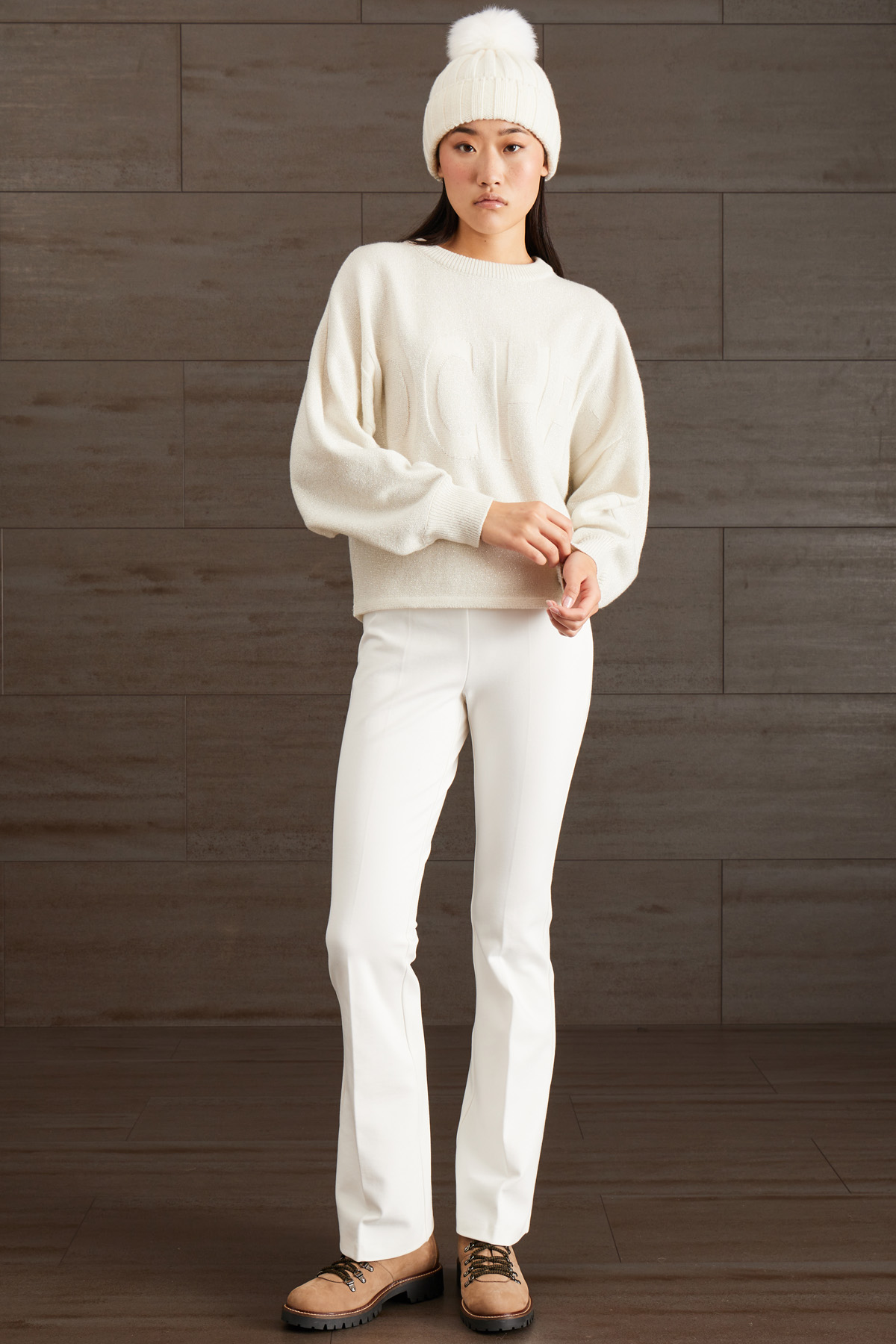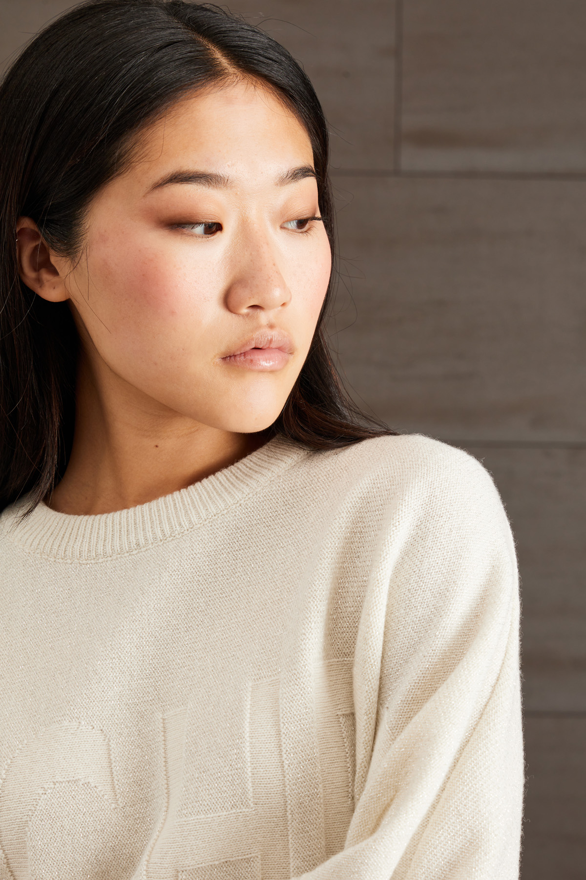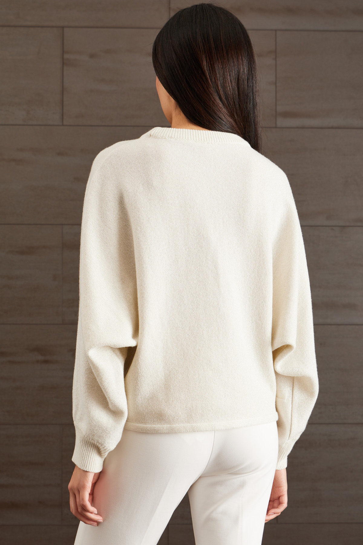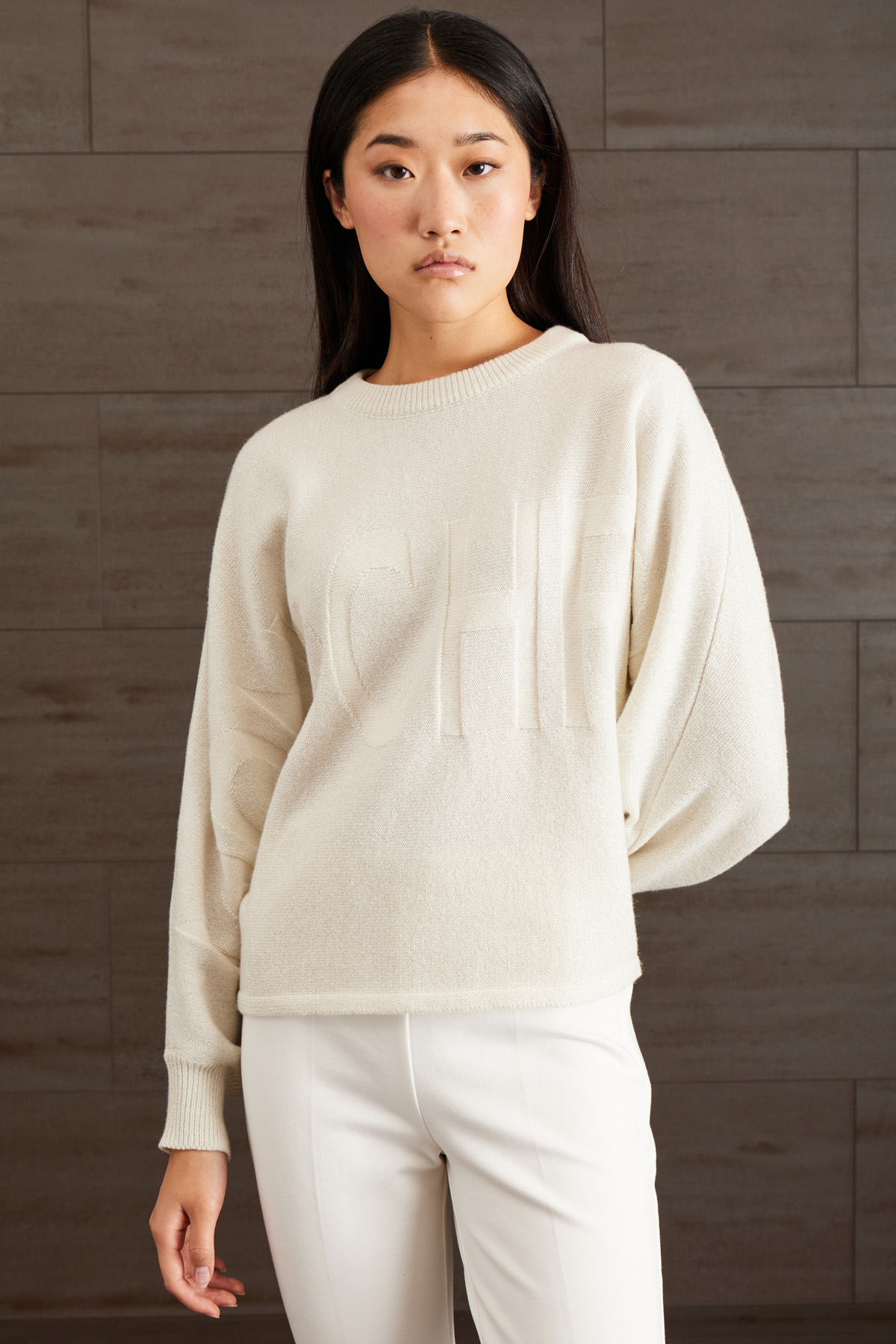 Maglia dalla linea morbida realizzata in filato di misto lana, viscosa e cashmere, con inserto lamè, motivo sul davanti, scollo rotondo, maniche lunghe a kimono e profili rifiniti a coste.