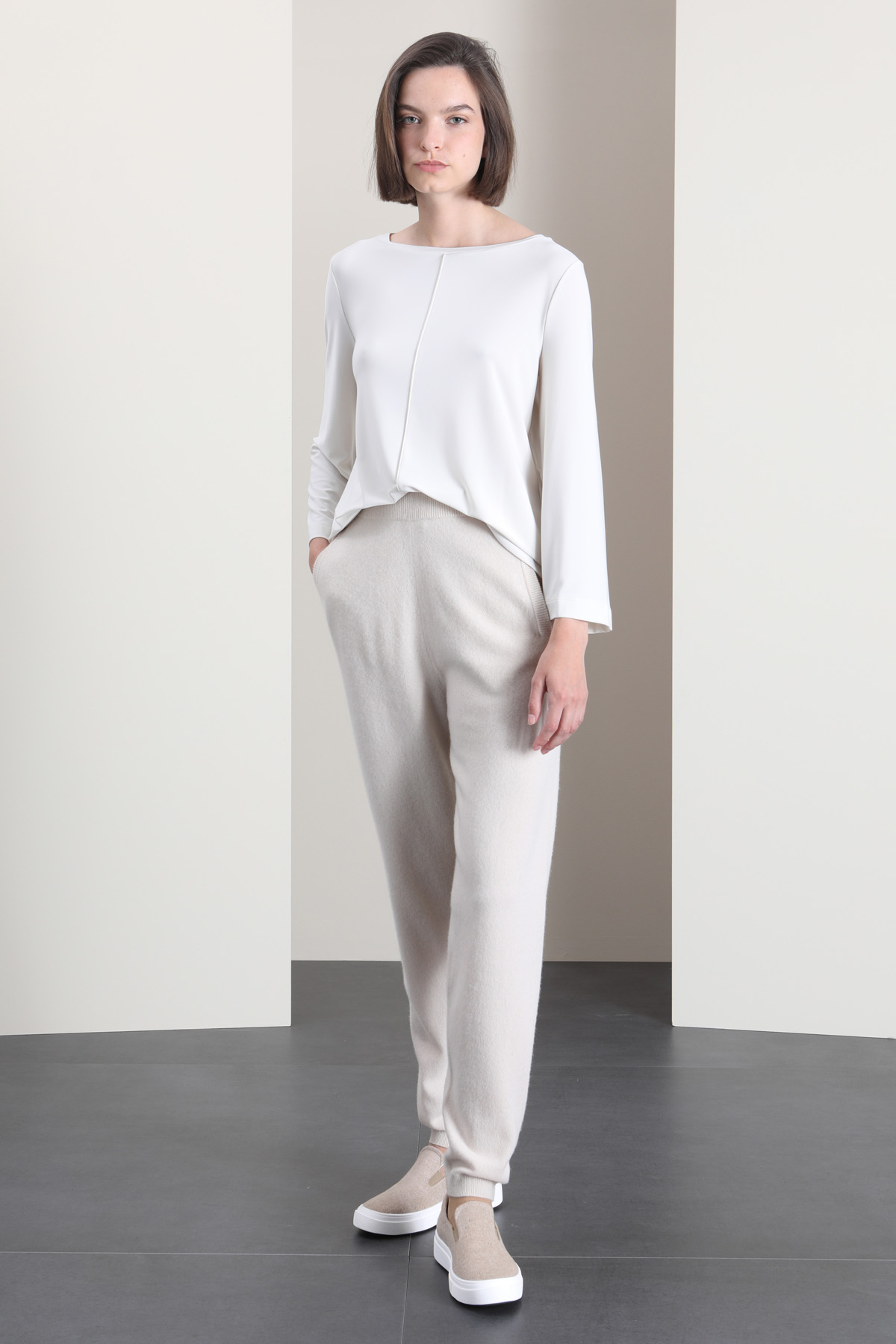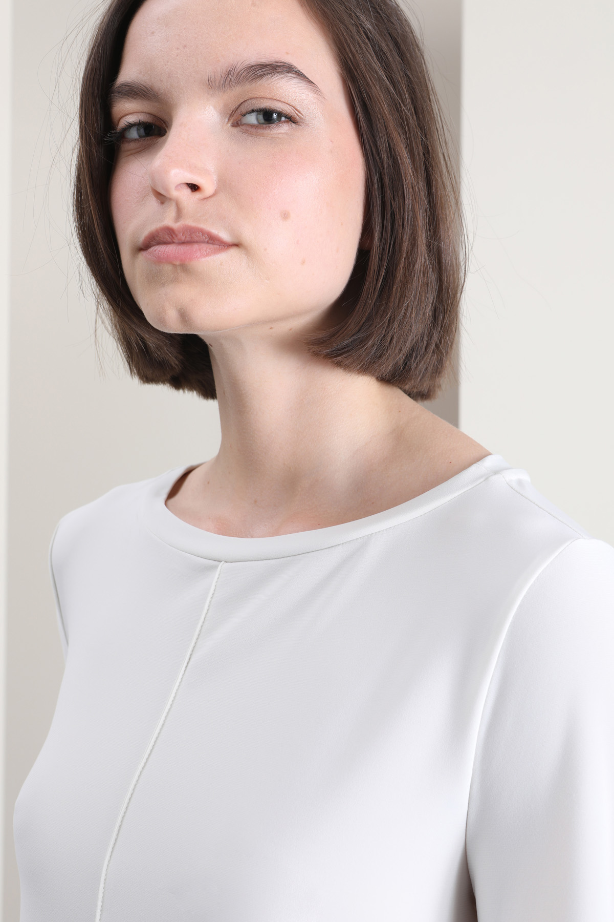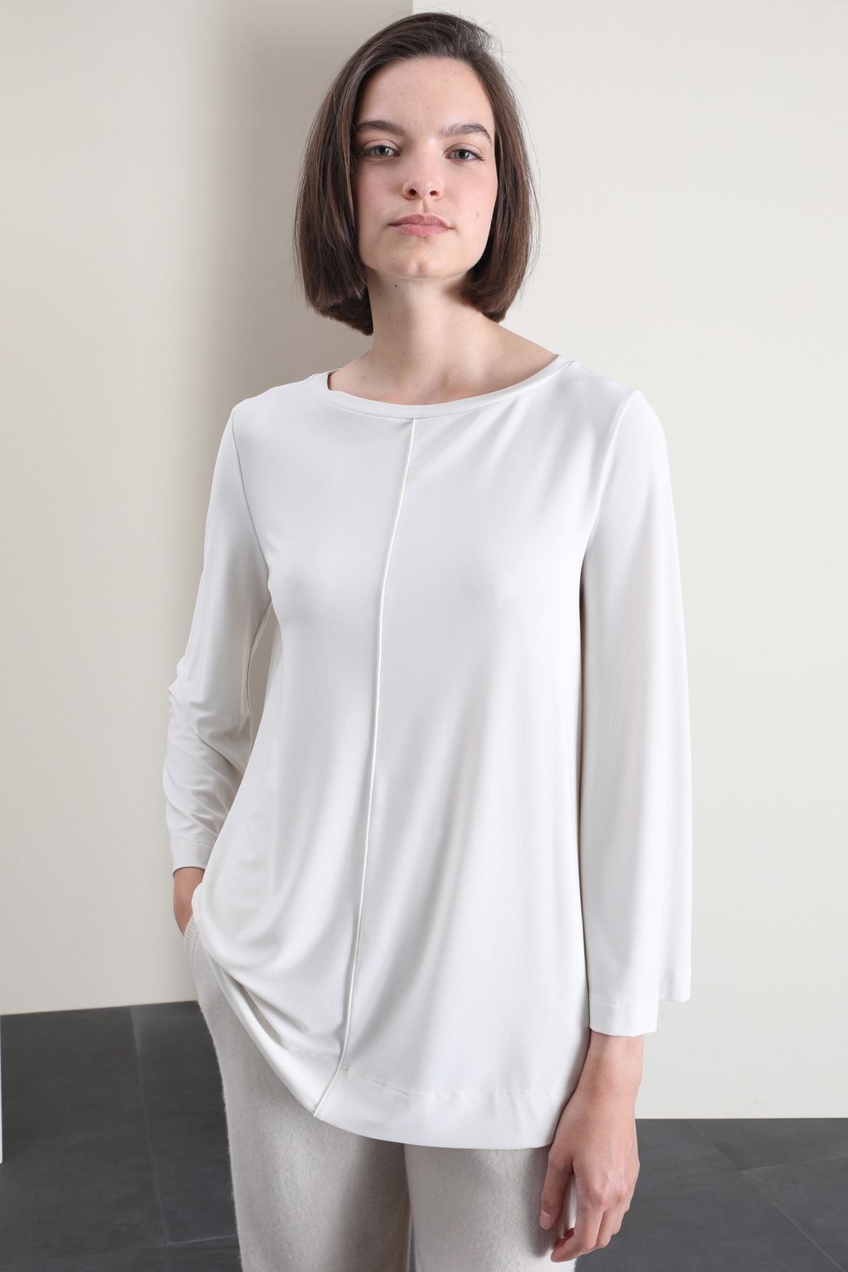 T-shirt dalla linea dritta realizzata in jersey tecnico stretch, con scollo a barchetta, maniche lunghe e taglio impunturato nel centro davanti e nel retro.