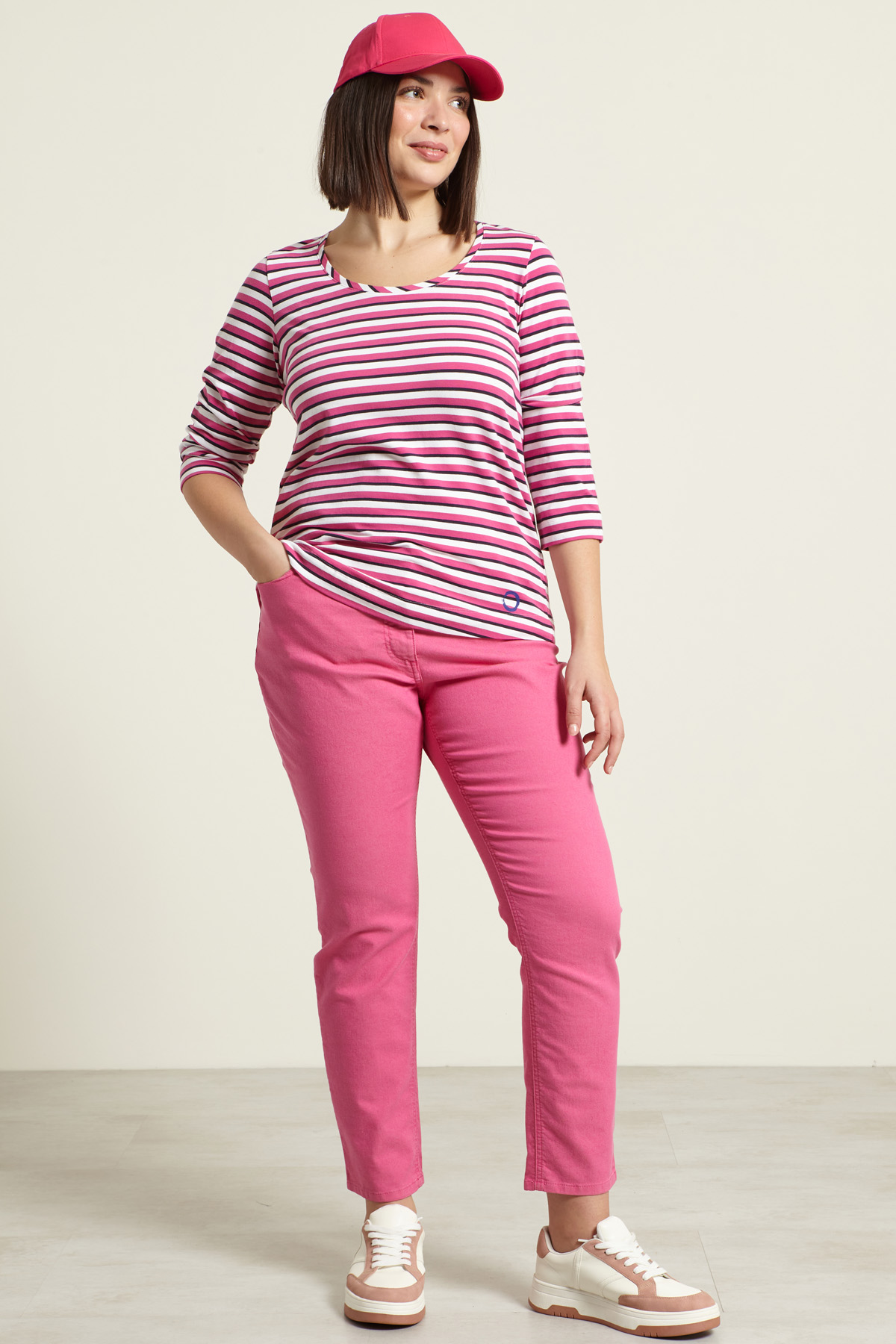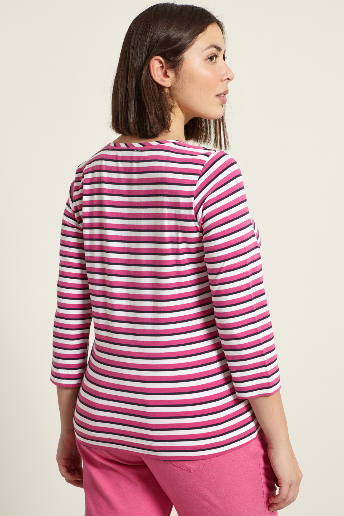 T-shirt dalla linea dritta realizzata in jersey di cotone stretch tinto filo, con scollo a giro e maniche tre quarti.