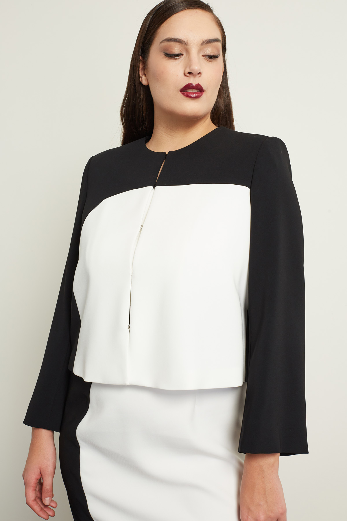 Giacca dalla linea dritta realizzata in cady con motivo a contrasto, scollo a giro, maniche lunghe e spalle imbottite. Allacciatura monopetto tramite ganci. Foderato.