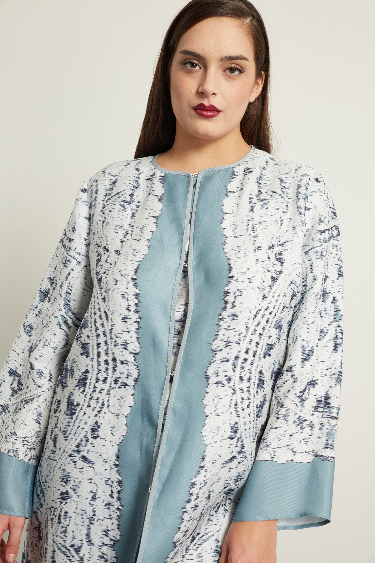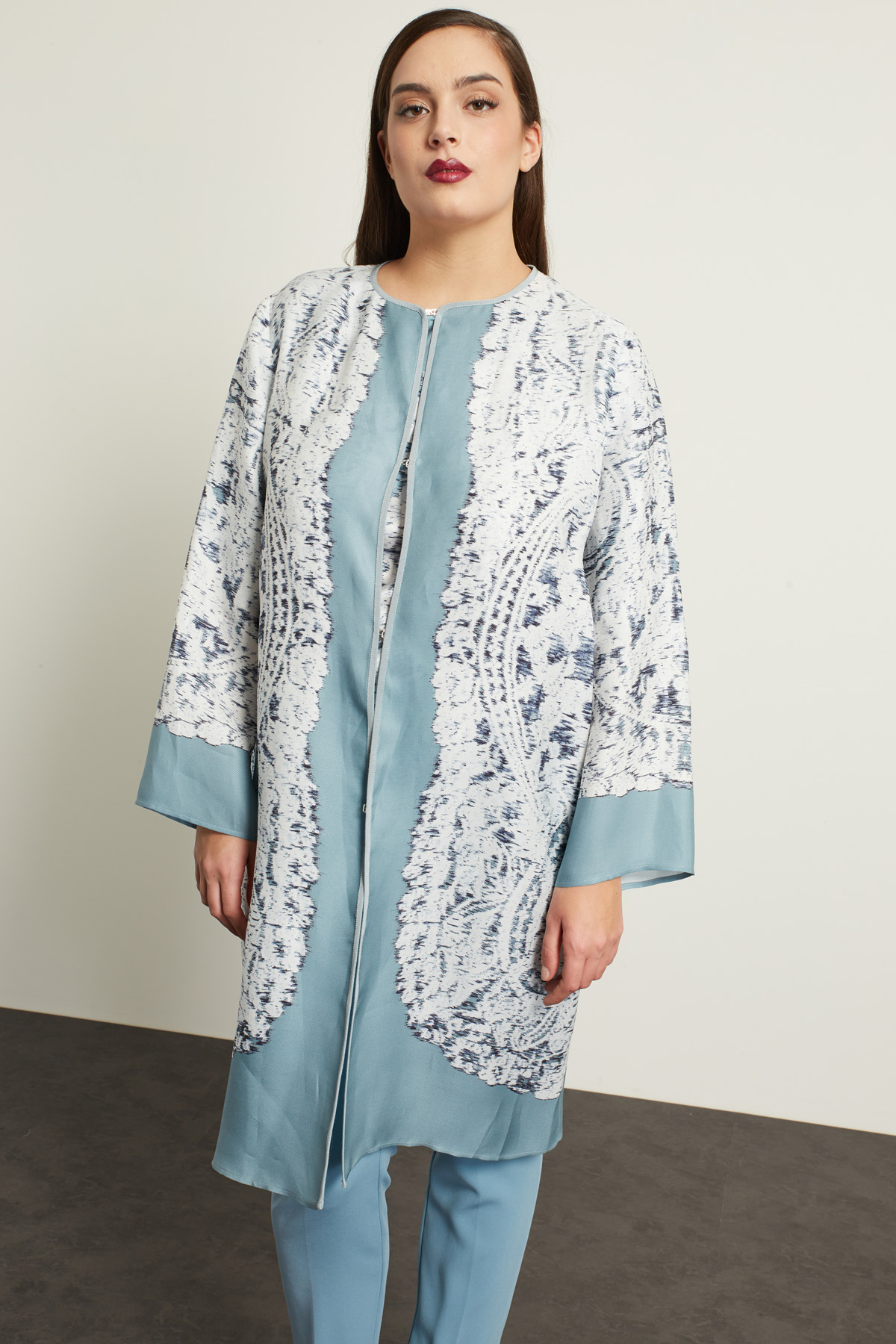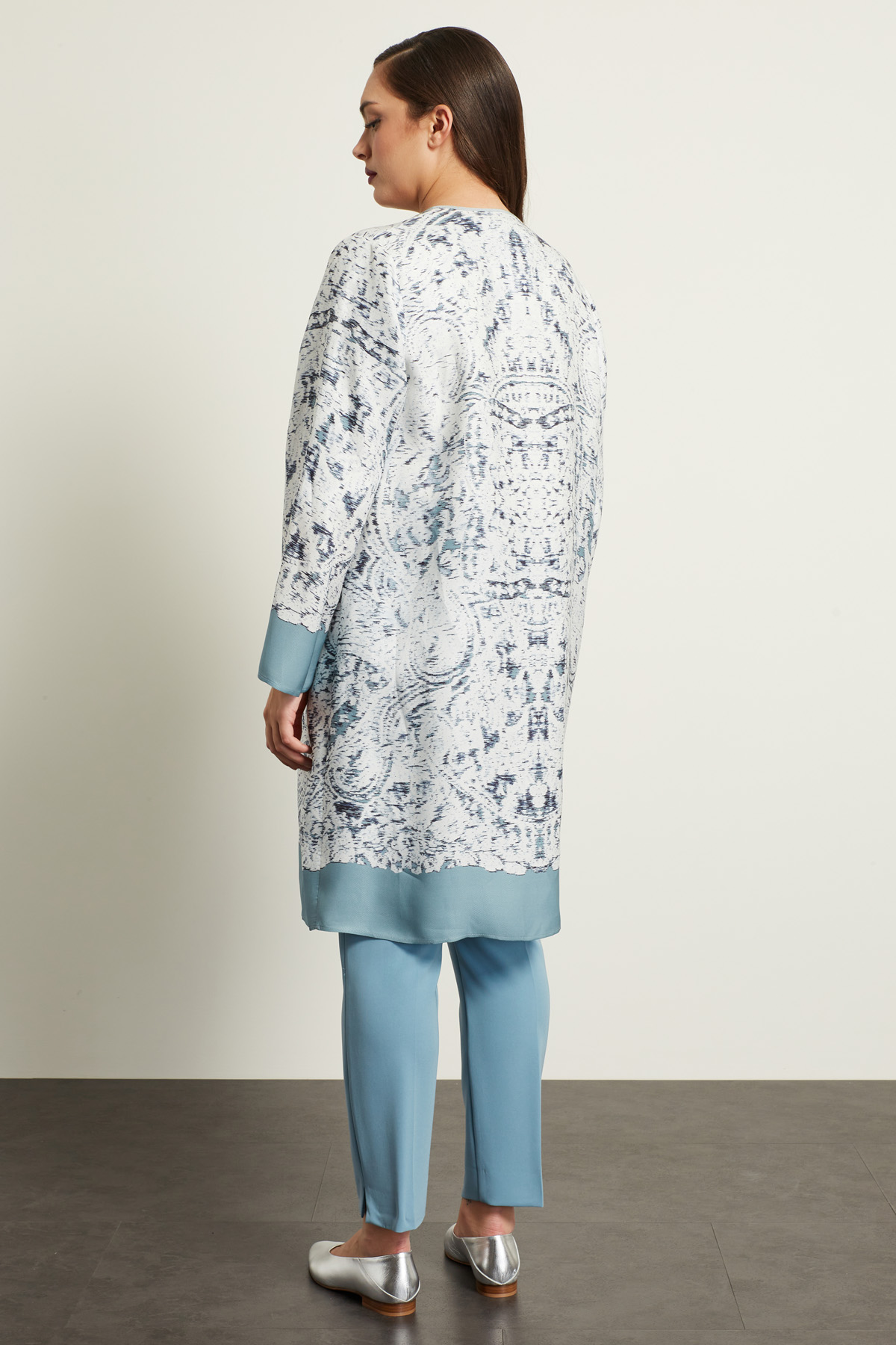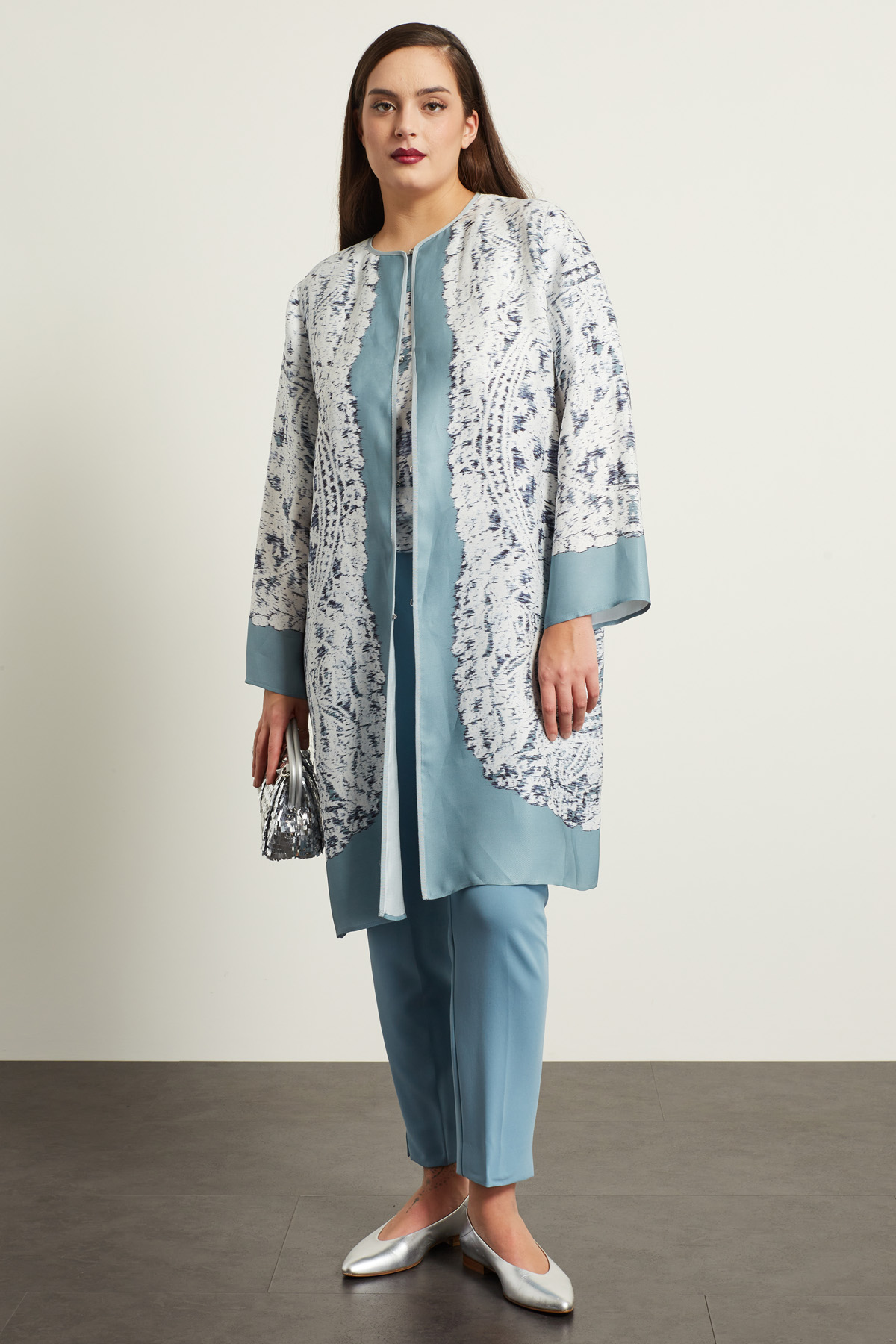 Spolverino dalla linea dritta realizzato in tessuto diagonale di misto seta, con scollo a giro, maniche lunghe ampie e profili rifiniti in gors grain. Allacciatura tramite ganci. Sfoderato.