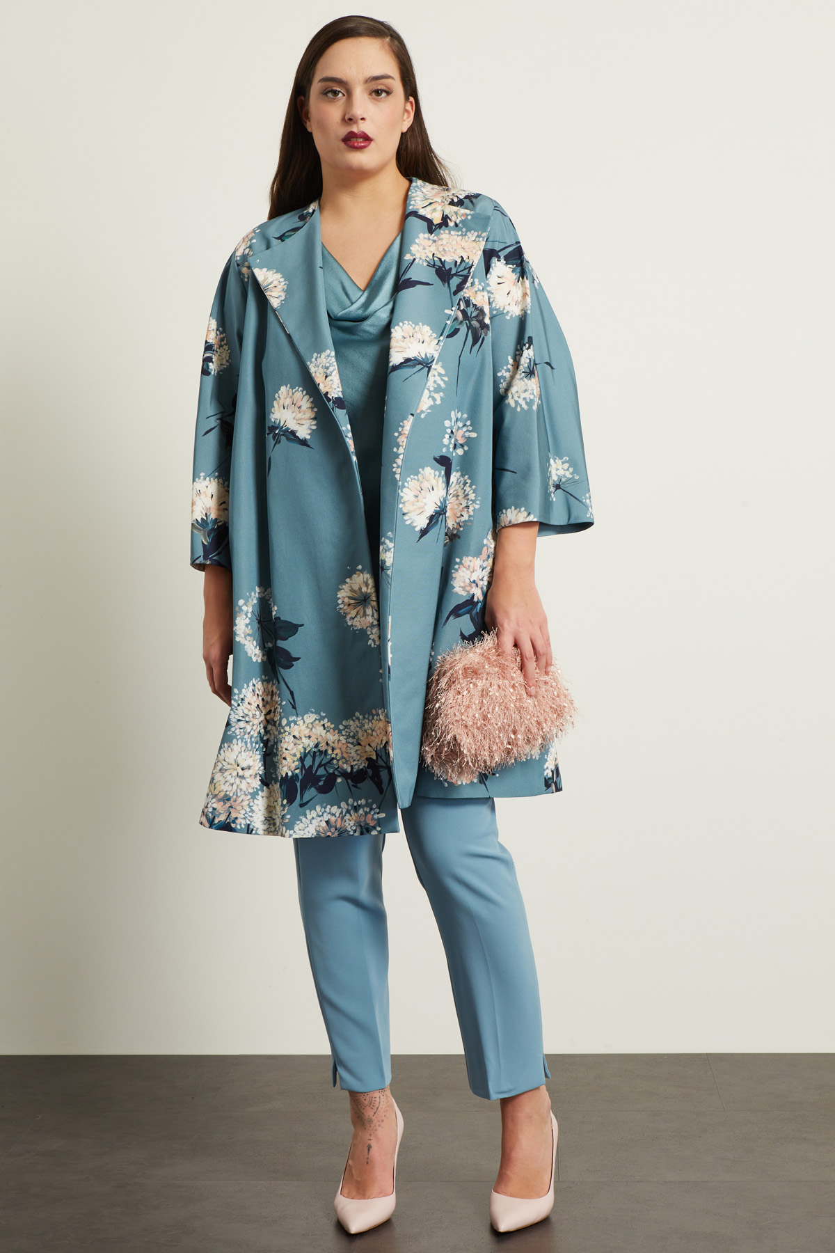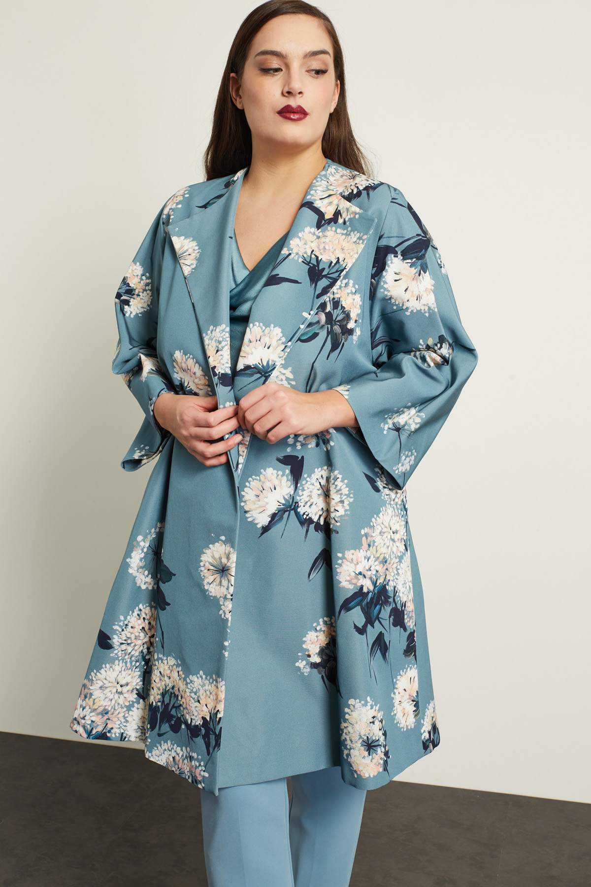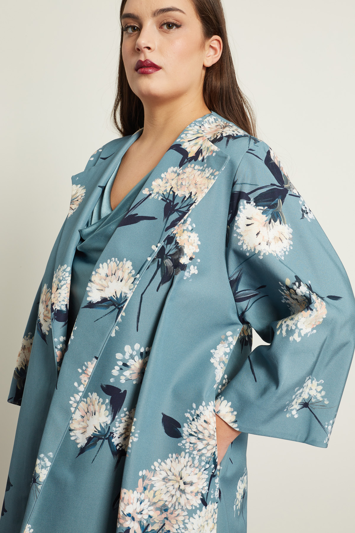 Soprabito dalla linea svasata realizzato in faille di misto cotone e viscosa stampato con collo rever, maniche lunghe ampie e tasche inserite in cucitura. Foderato.