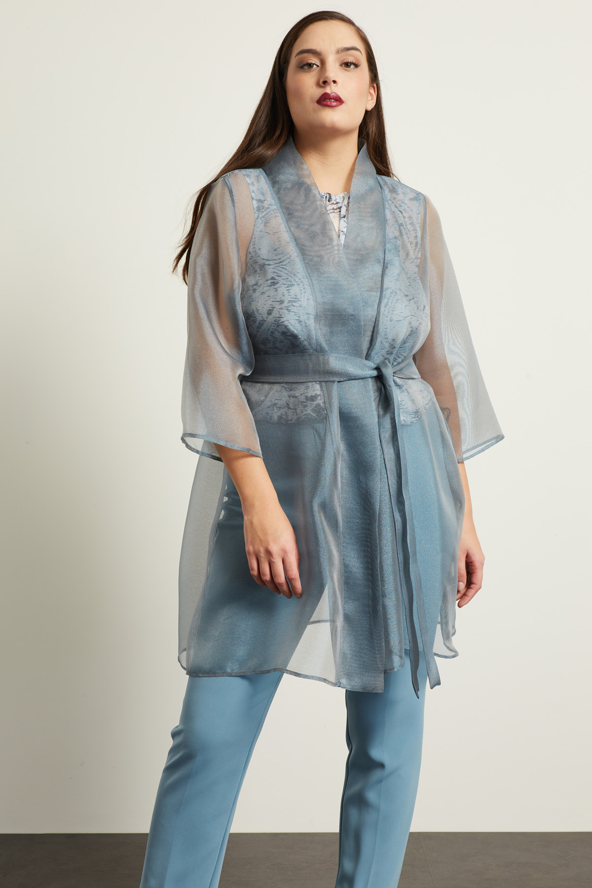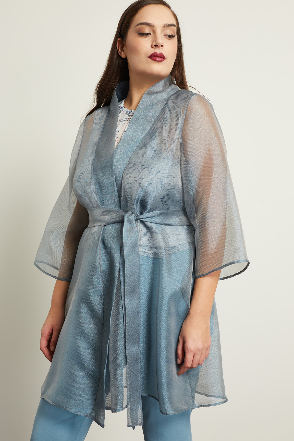 Spolverino dalla linea fluida realizzato in organza lamè con collo sciallato e maniche tre quarti ampie. Capo dotato di cintura coordinata.