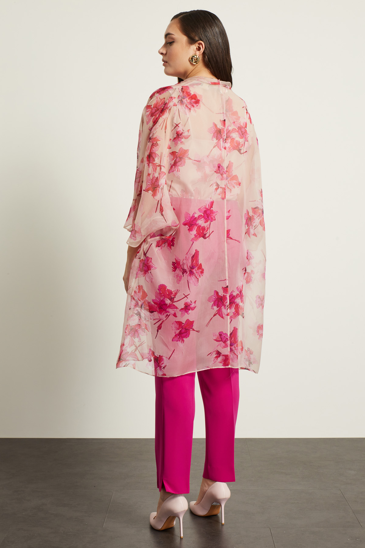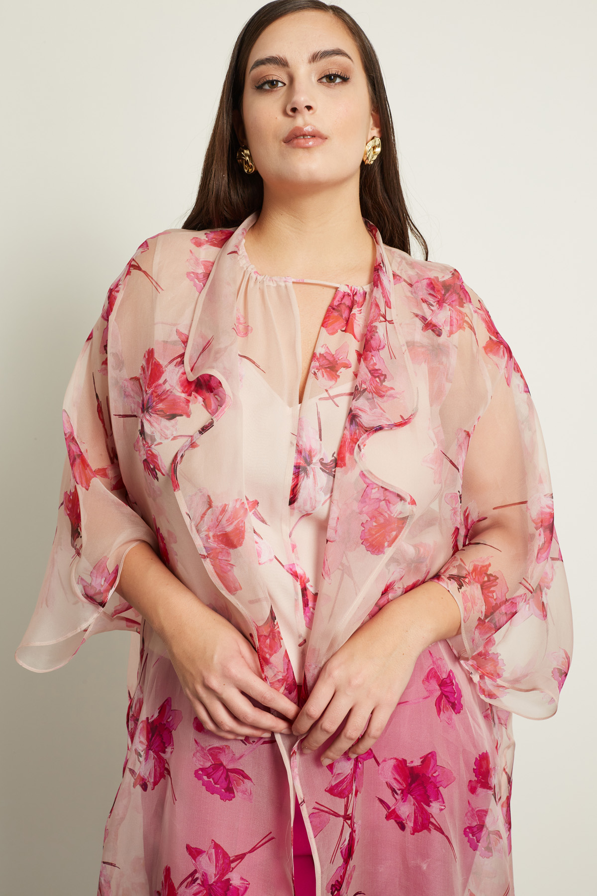 Spolverino lungo dalla linea fluida realizzato in organza di pura seta stampata, con collo a rever e maniche lunghe. Senza allacciatura, sfoderato.