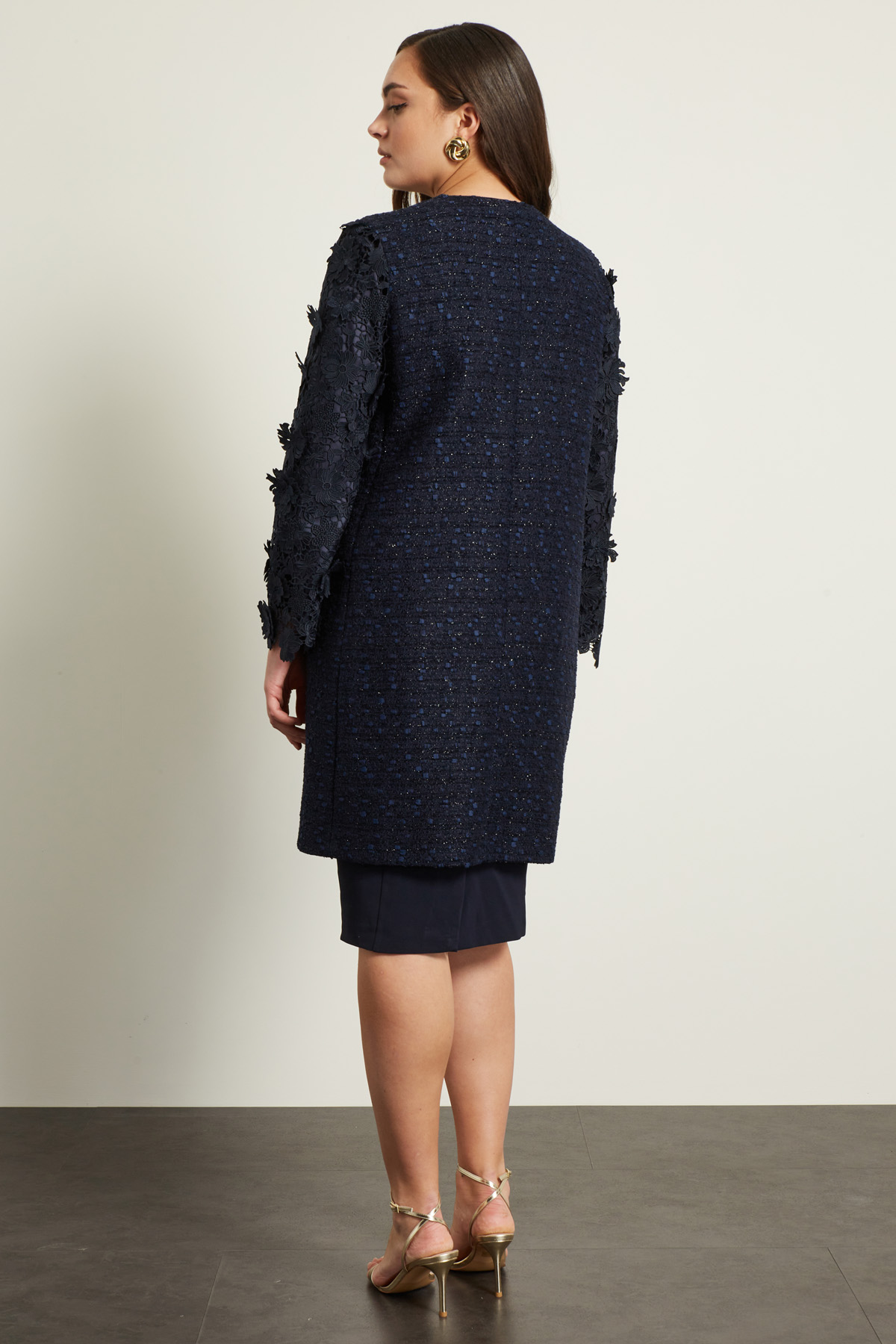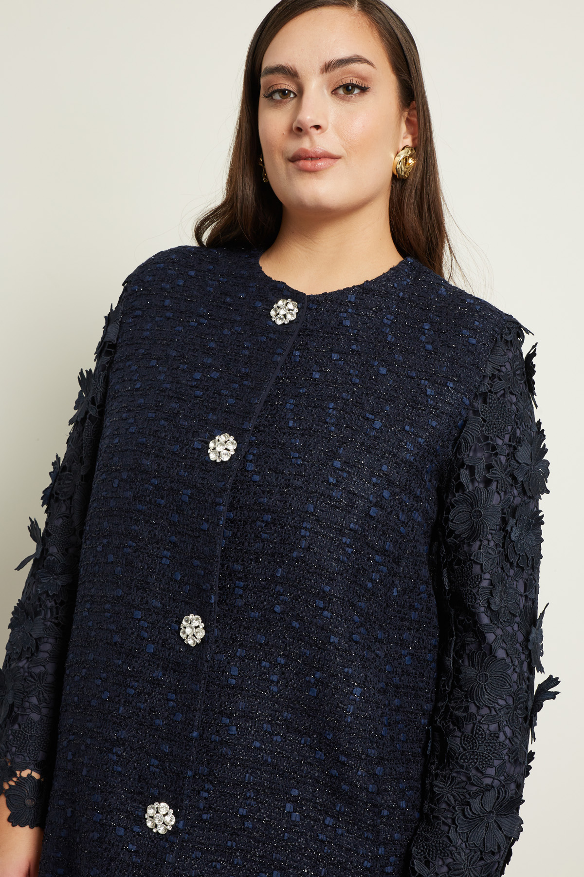 Spolverino dalla linea dritta realizzato in stuoia di misto cotone con inserti in pizzo macramè, scollo a giro, maniche lunghe e tasche inserite in cucitura. Allacciatura monopetto tramite bottoni gioiello. Foderato.
