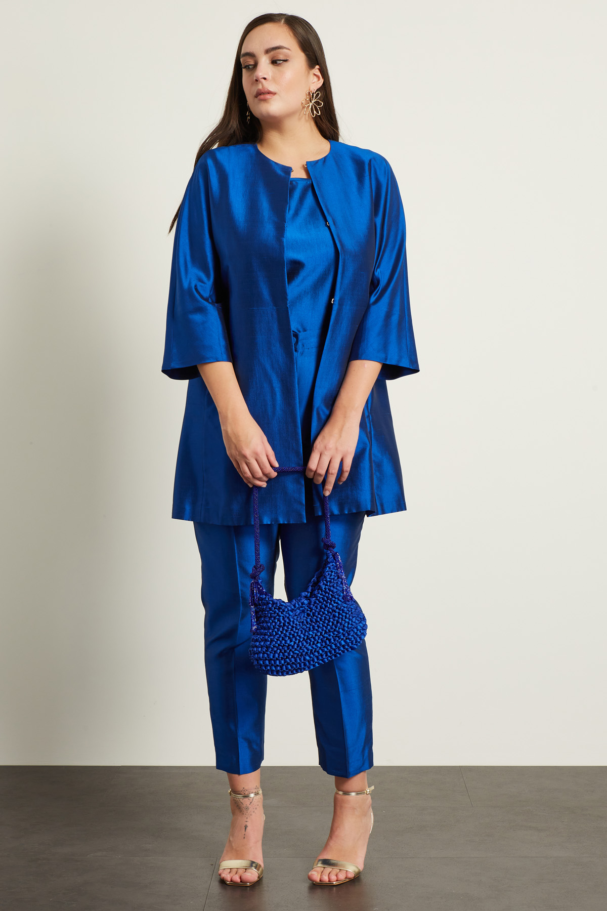 Spolverino dalla linea dritta realizzato in shantung di pura seta, con scollo a giro, maniche a tre quarti e tasche laterali inserite in cucitura. Allacciatura monopetto tramite ganci. Sfoderato.