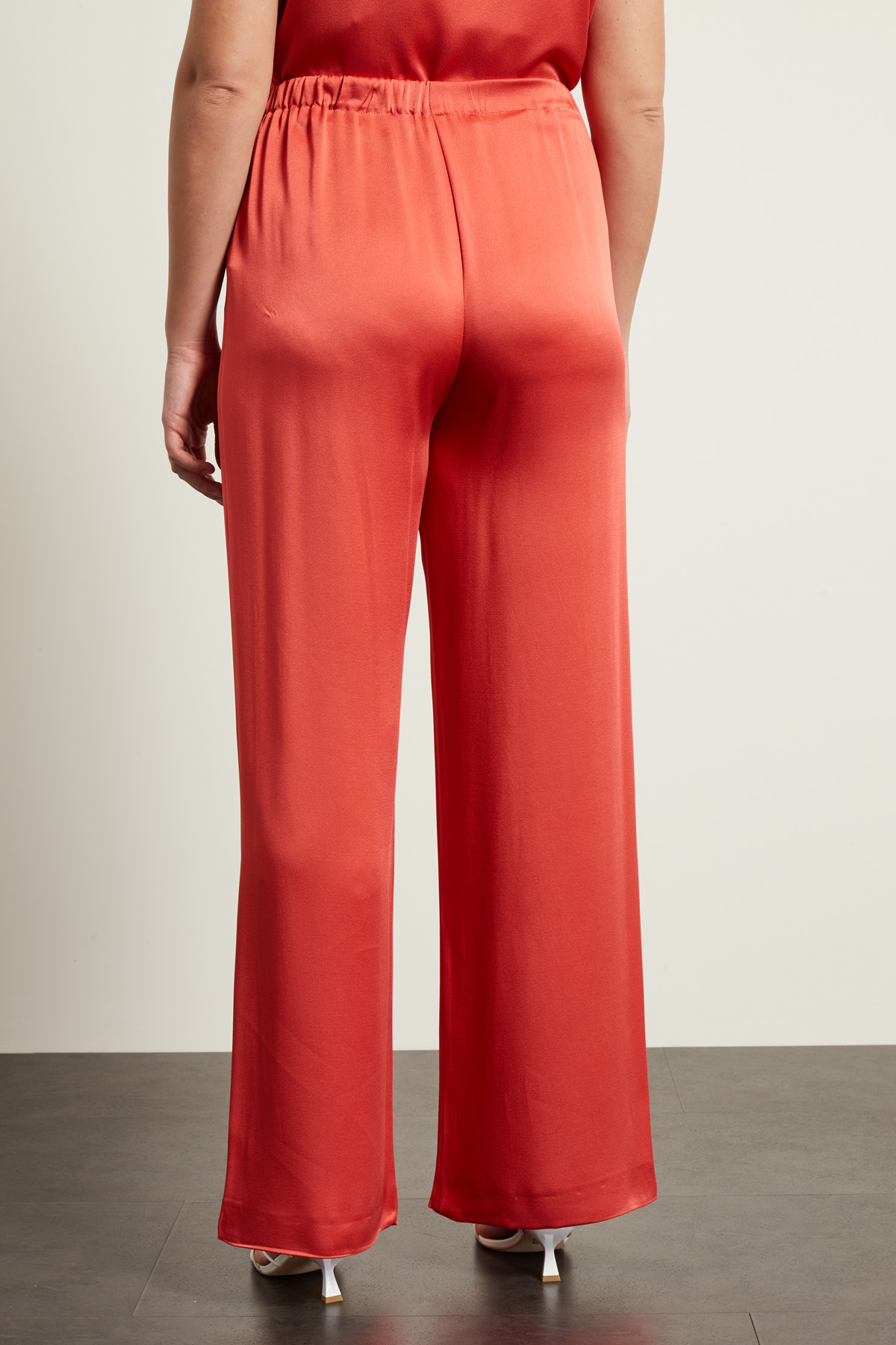 Pantaloni a palazzo realizzati in raso di misto viscosa, con inserto elastico in vita.