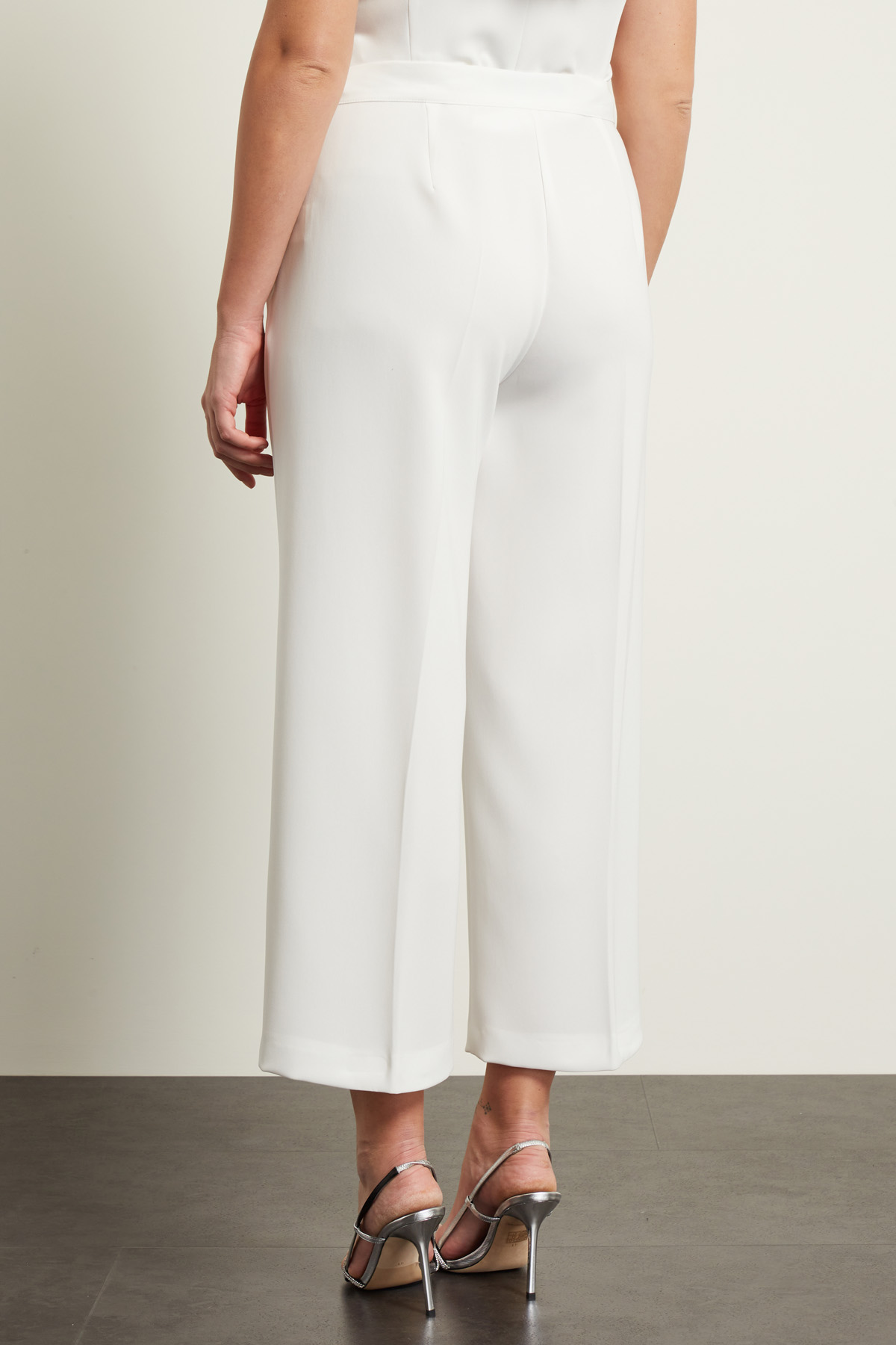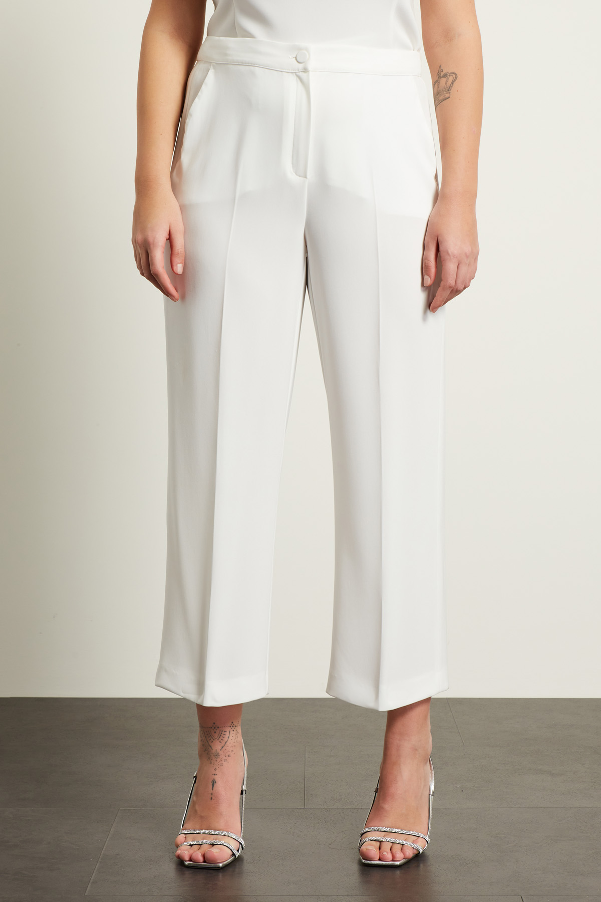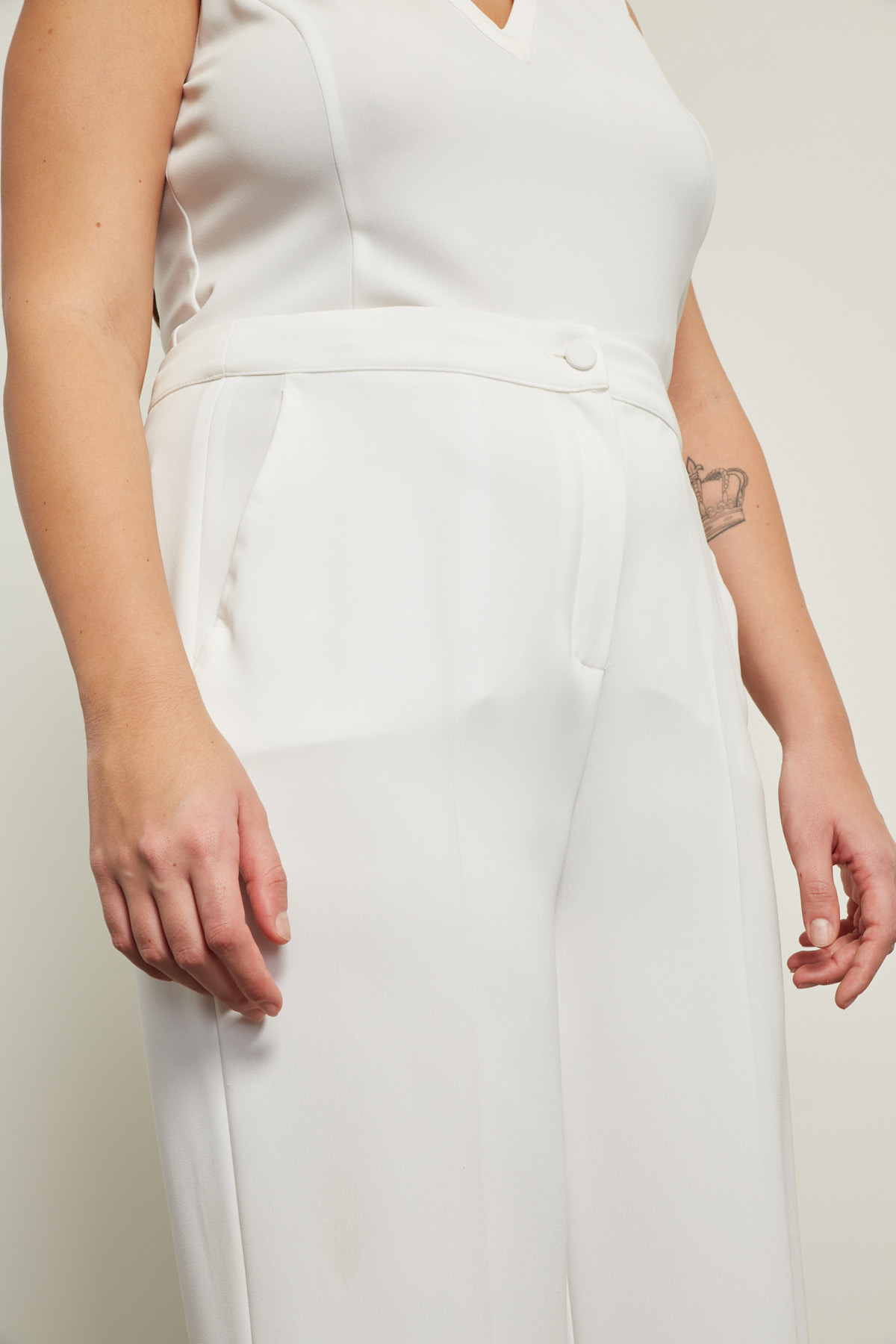 Pantaloni dalla linea dritta realizzati in cady, con cintone in vita, tasche laterali inserite in cucitura e piega stirata. Allacciatura tramite zip nascosta e bottone rivestito.
