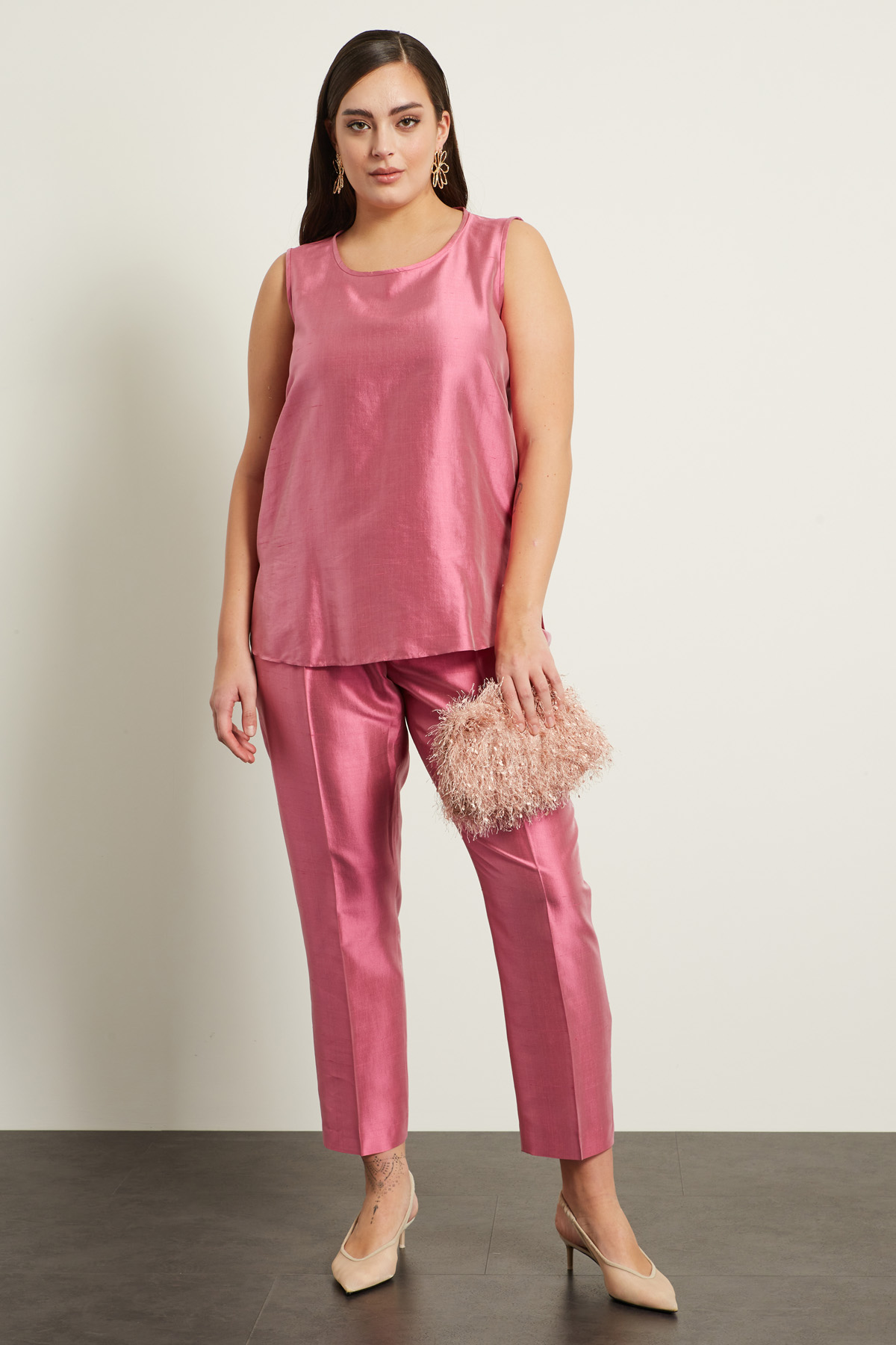 Top smanicato dalla linea dritta realizzato in shantung di pura seta, con scollo a U, spalline spesse e spacchetti al fondo.