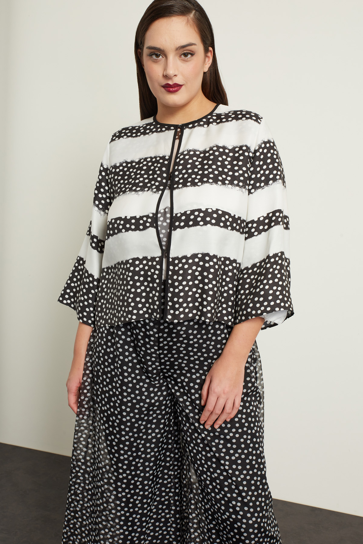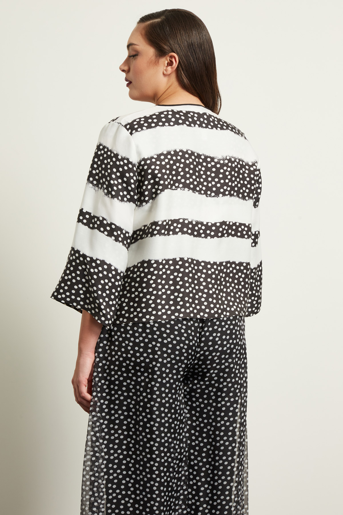 Spolverino dalla linea dritta realizzato in tessuto diagonale di misto seta, con collo a giro, maniche tre quarti ampie. Allacciatura tramite ganci.