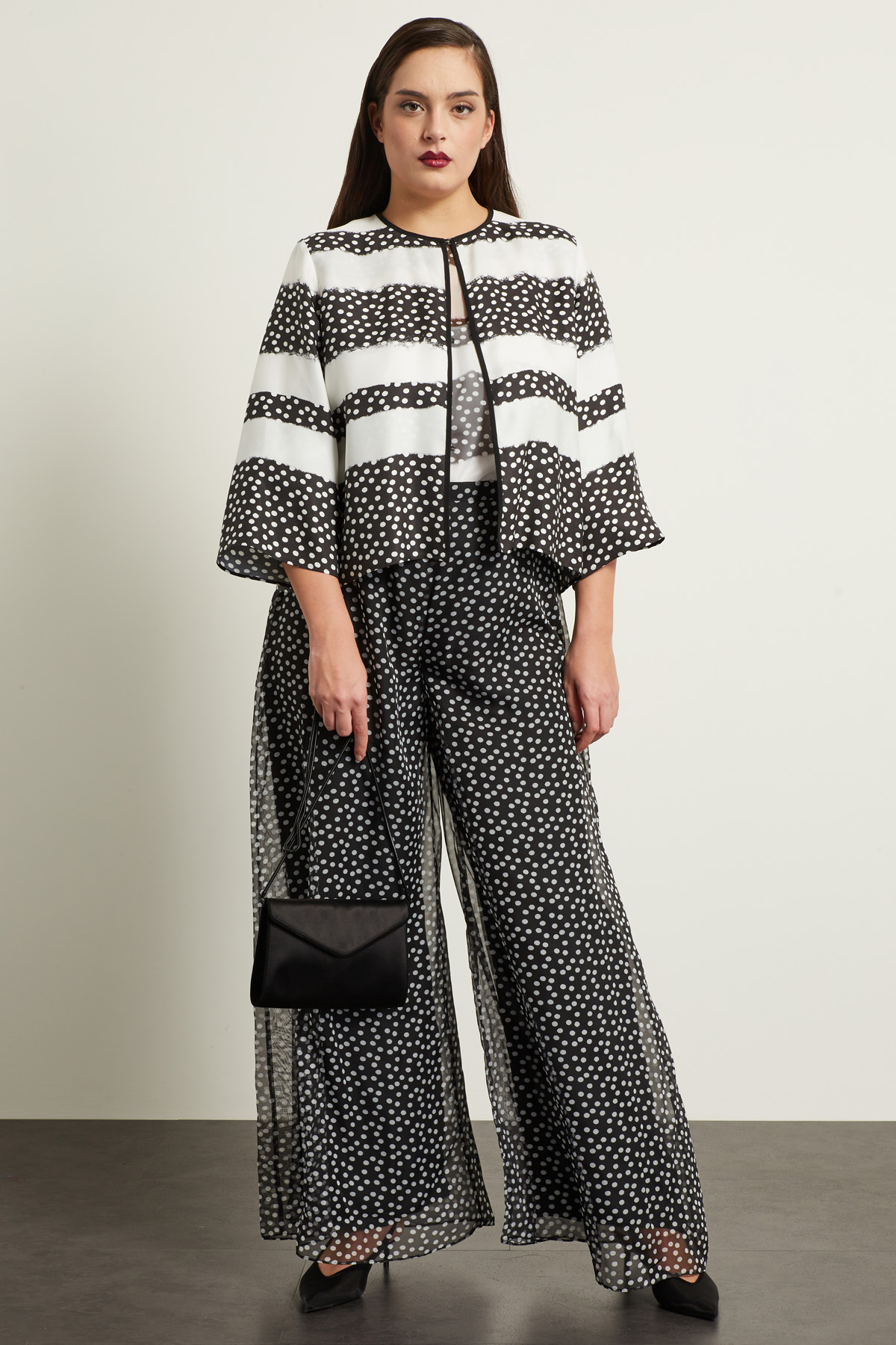 - La modella è alta 179 cm e indossa la taglia 21. Le sue misure sono: seno 100 cm, vita 79 cm e fianchi 108 cm