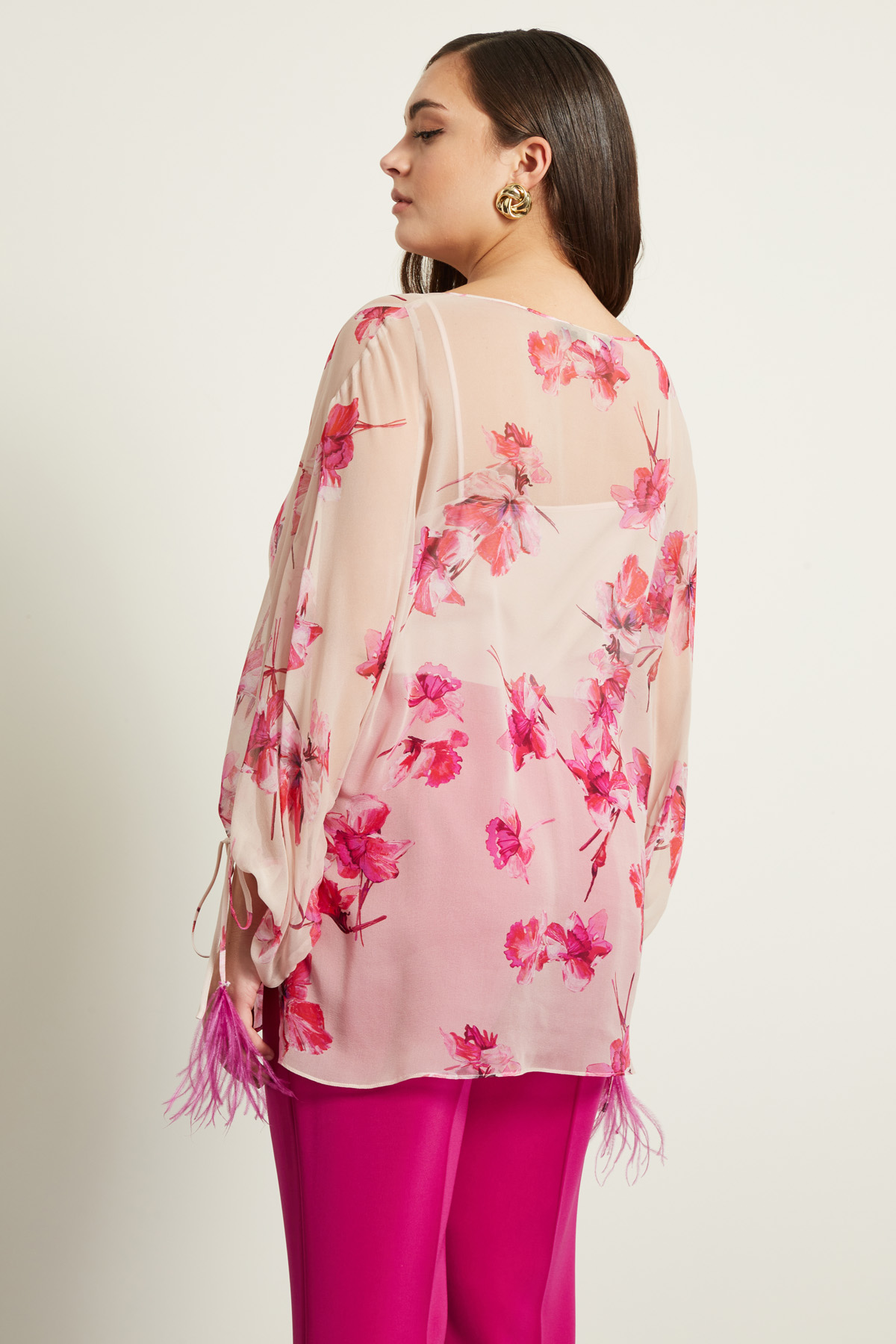 Blusa dalla linea fluida realizzata in georgette di pura seta stampata, con scollo a barchetta, maniche lunghe a palloncino con coulisse al polso e laccetti, spacchetti laterali al fondo. Capo dotato di top sottoveste.