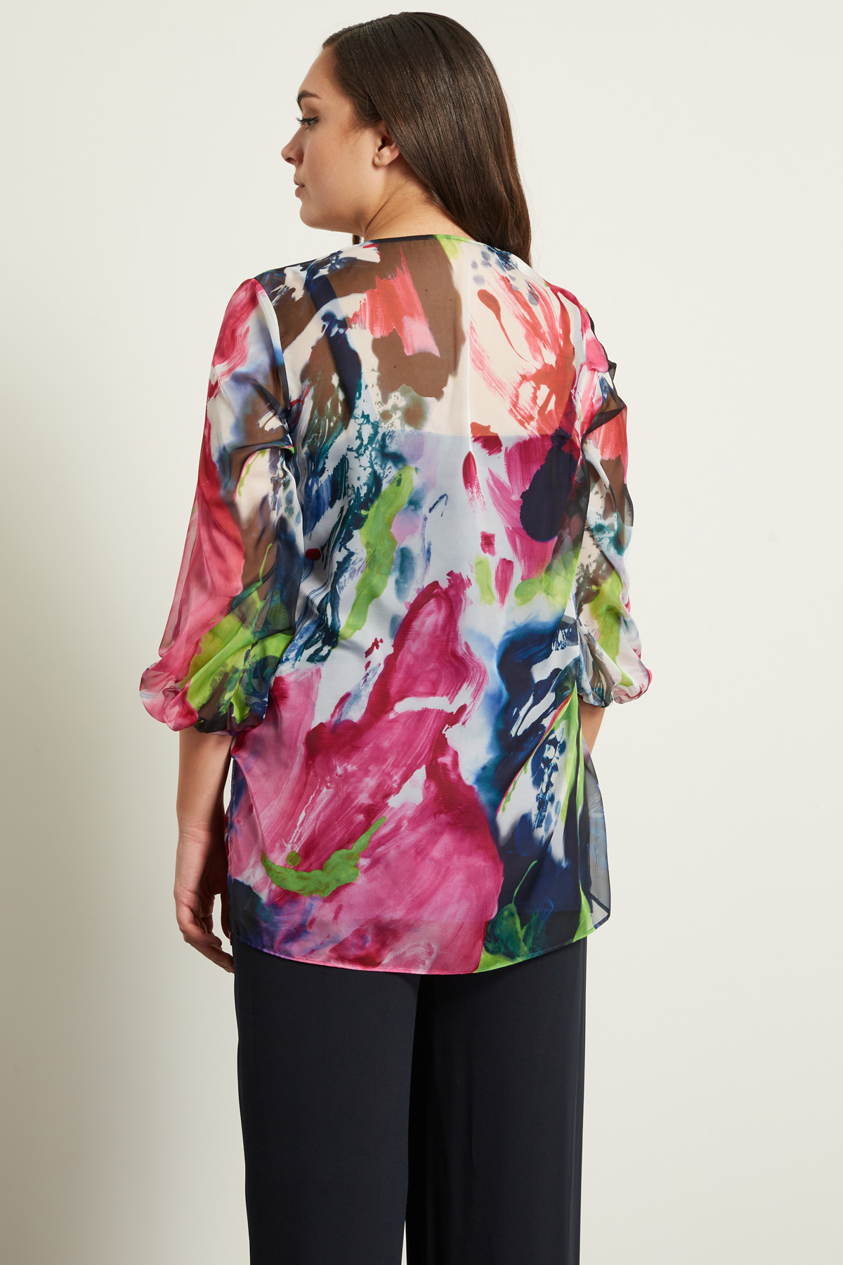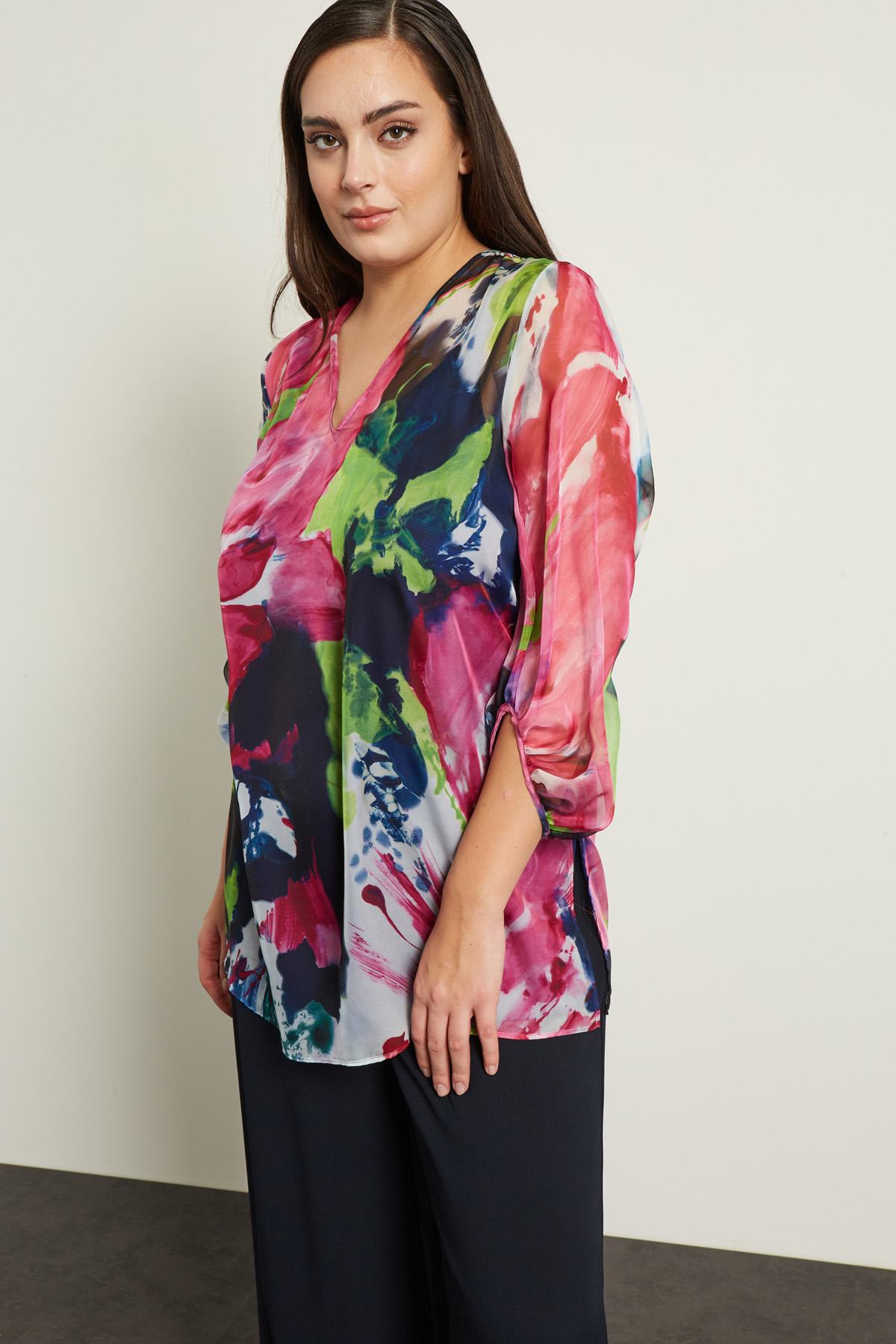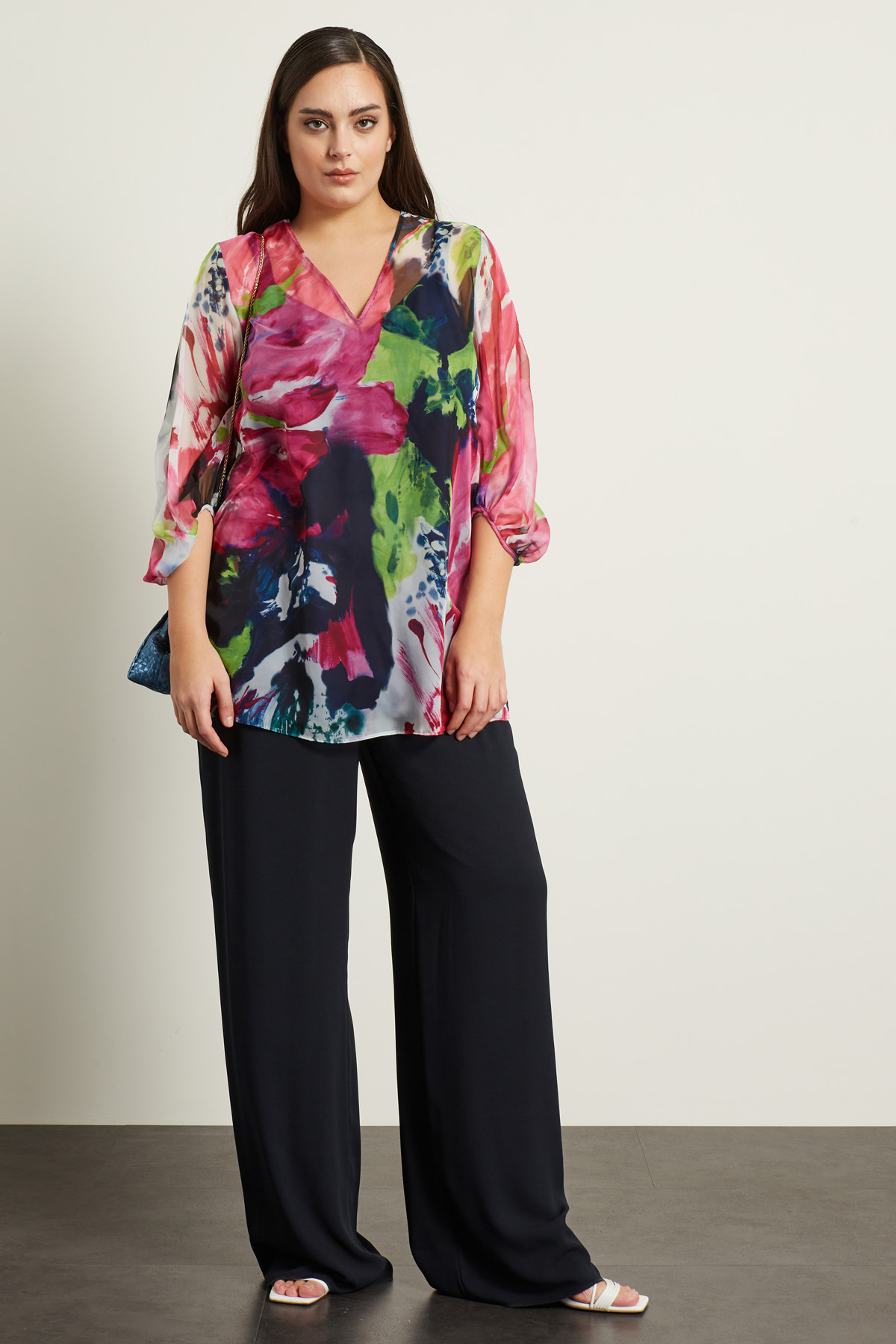 Blusa dalla linea fluida realizzata in chiffon stampato, con scollo a V, maniche tre quarti a palloncino e spacchetti laterali a fondo capo. Modello dotato di top sottoveste in abbinamento.