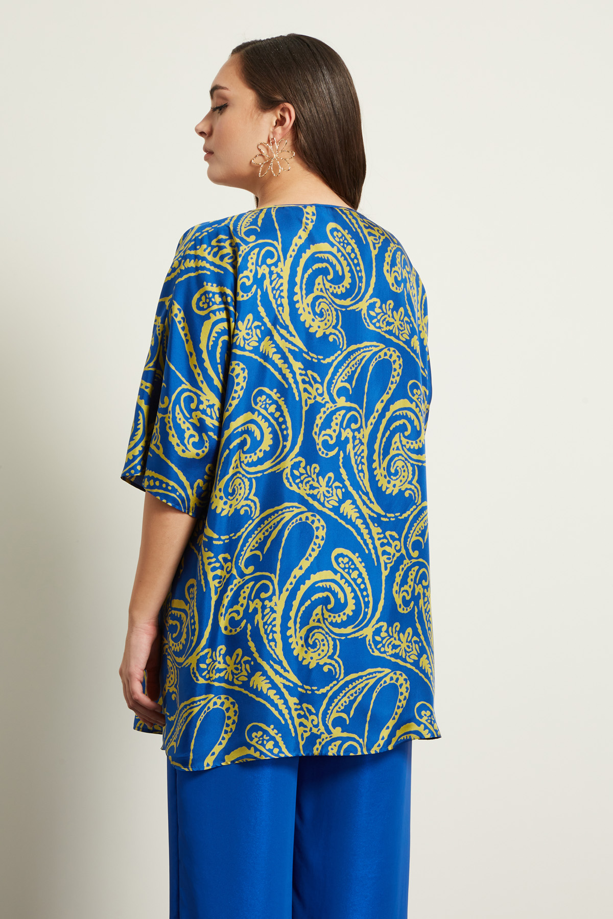 Casacca dalla linea fluida realizzata in twill di pura seta stampata, con scollo rotondo e maniche tre quarti a kimono.