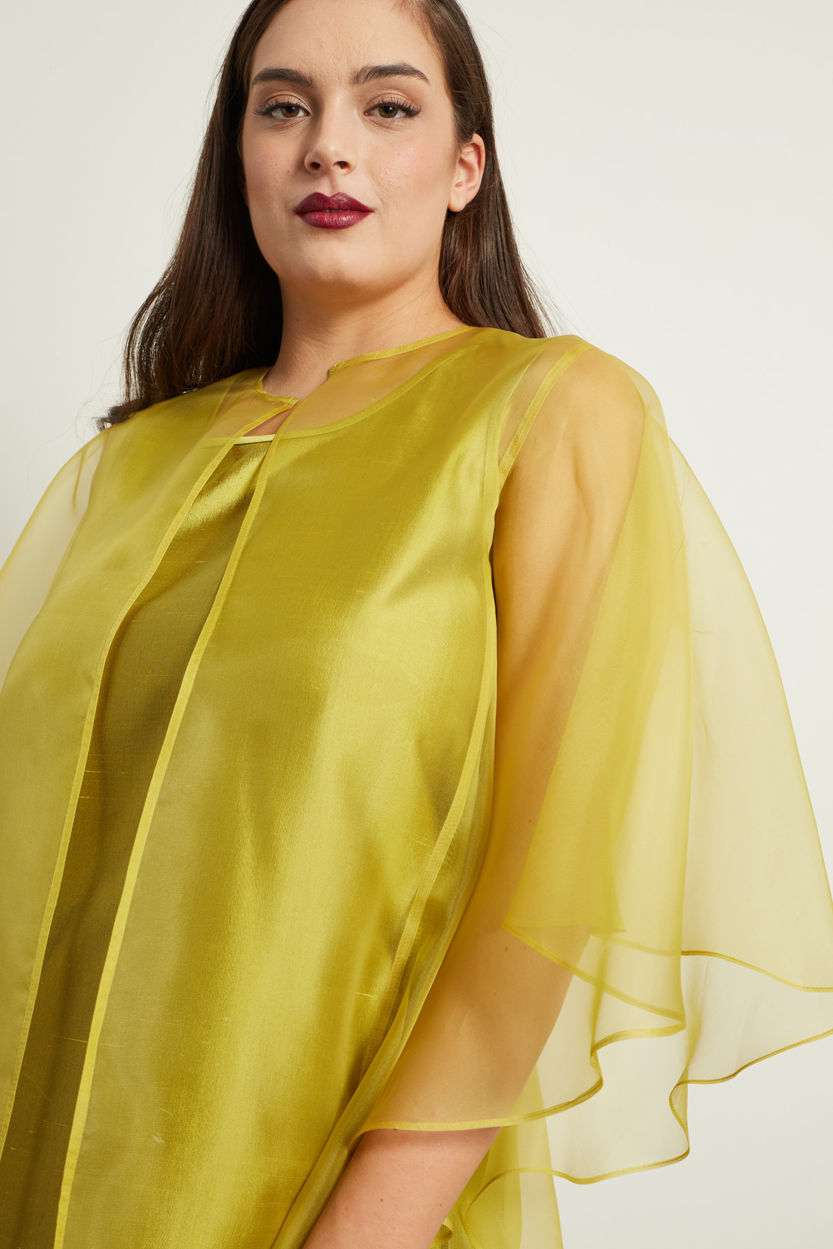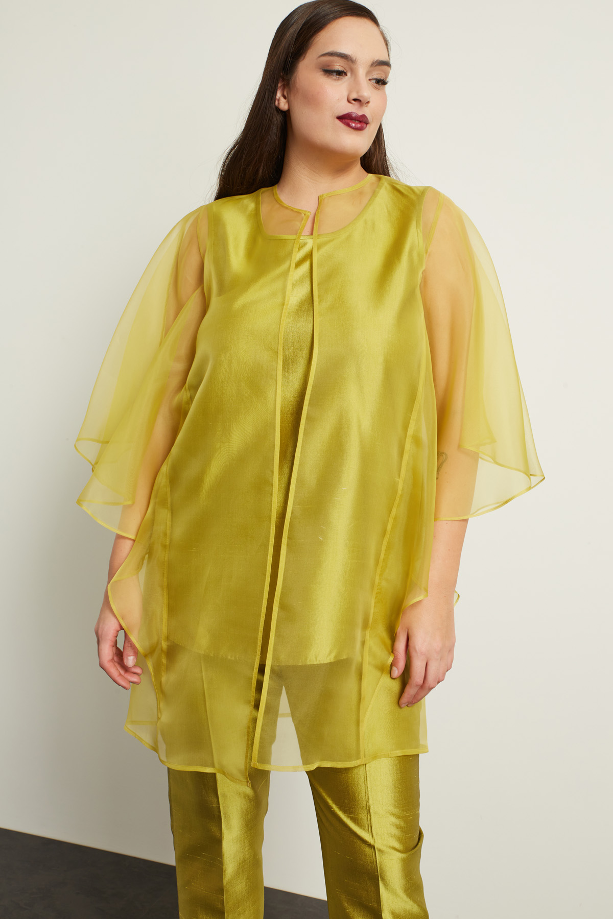 Spolverino dalla linea fluida realizzato in organza di pura seta, con collo a giro e maniche corte ampie a fazzoletto.