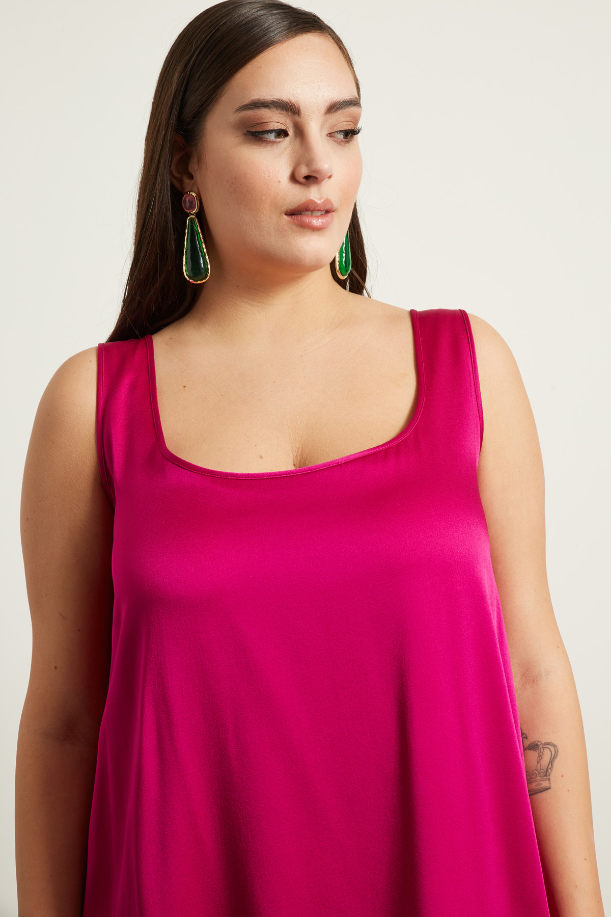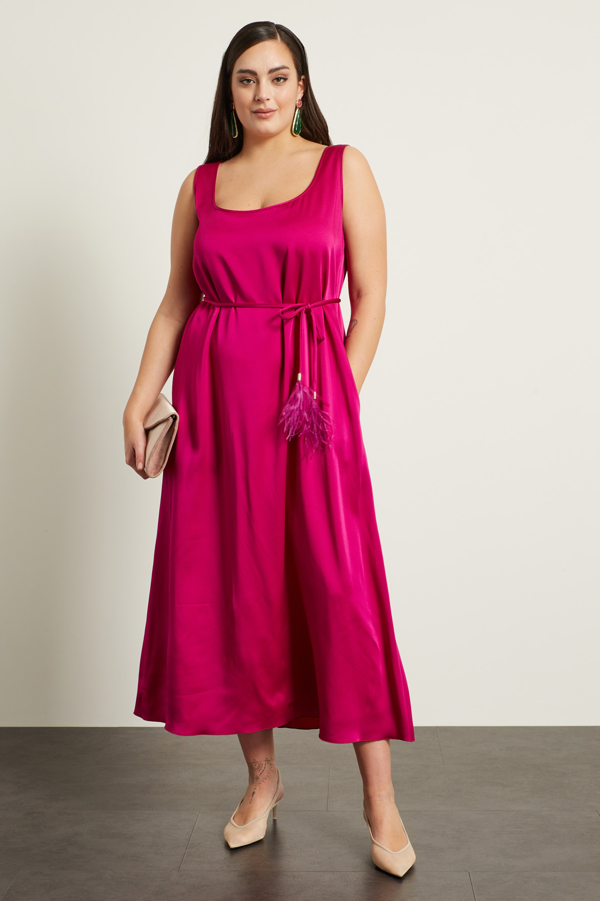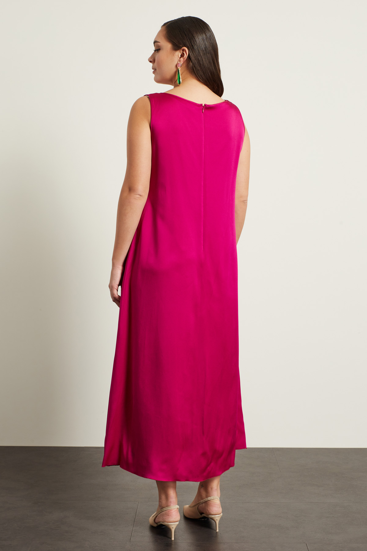Abito smanicato lungo dalla linea dritta realizzato in raso di misto viscosa, con scollo squadrato, spalline spesse e tasche laterali inserite in cucitura. Allacciatura tramite zip invisibile nel retro.