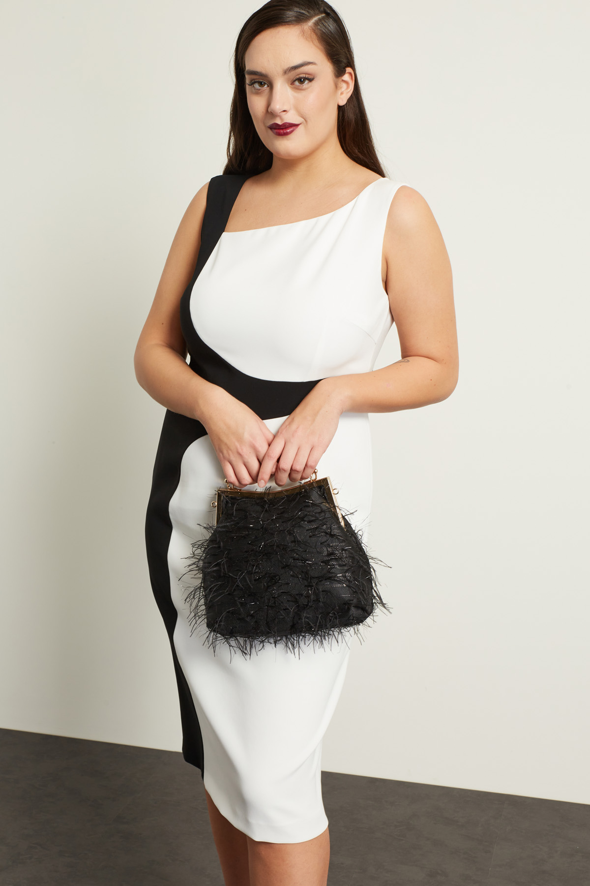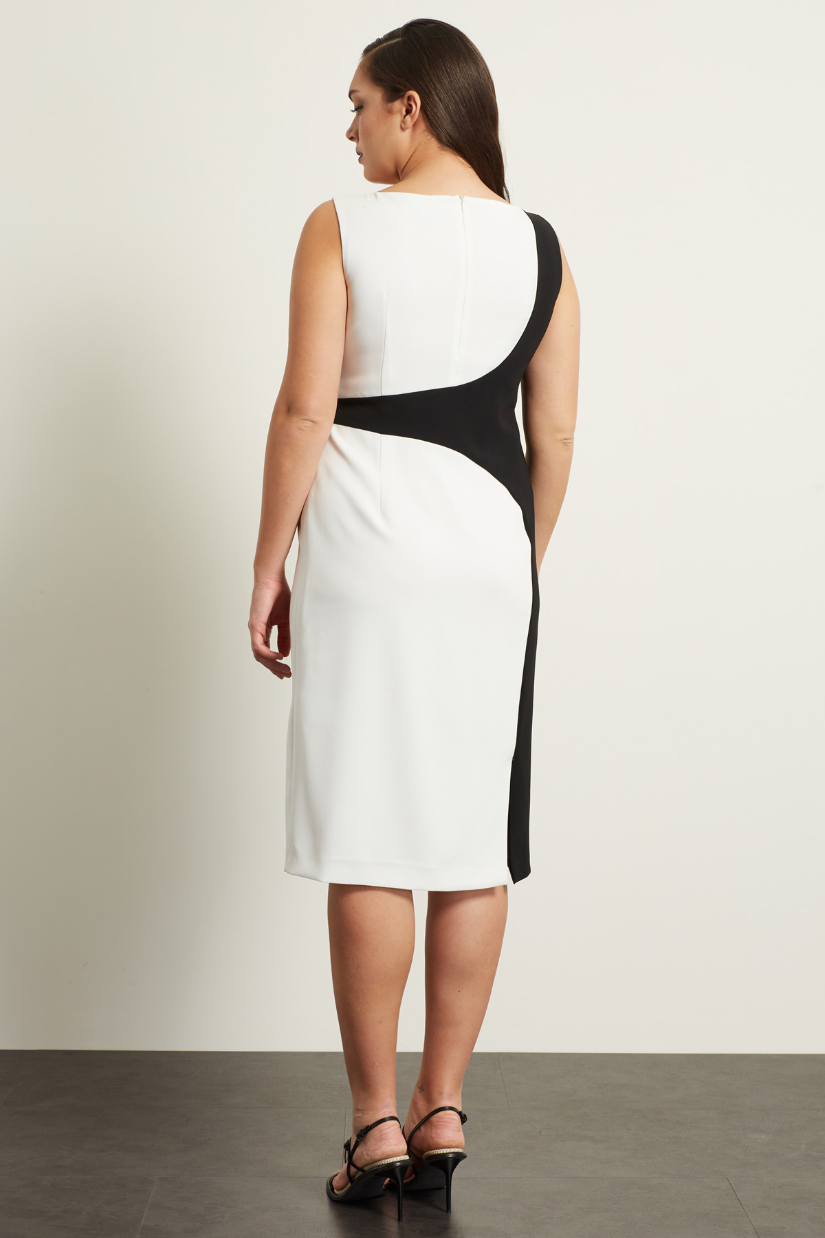 Tubino dalla linea sfiancata realizzato in cady con motivo a contrasto, scollo asimmetrico con spalline spesse e taglio laterale nel retro. Allacciatura tramite zip invisibile nel fianco. Foderato.