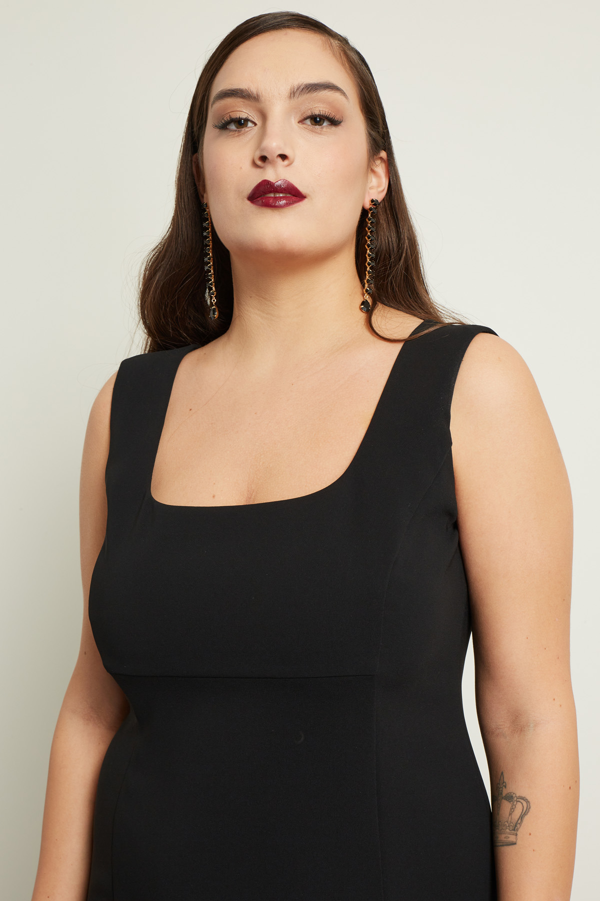 Tubino dalla linea aderente realizzato in cady, con scollo squadrato, spalline spesse e spacco nel retro al fondo. Allacciatura tramite zip invisibile nel retro. Foderato.